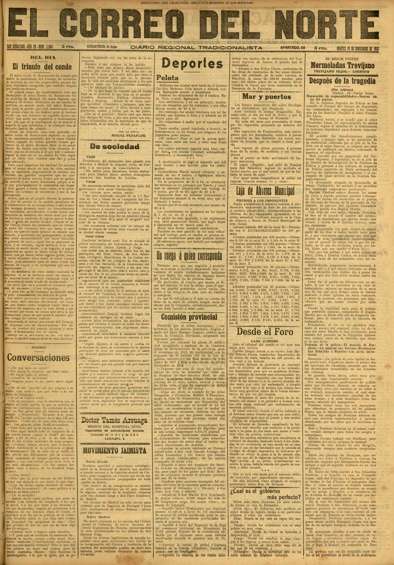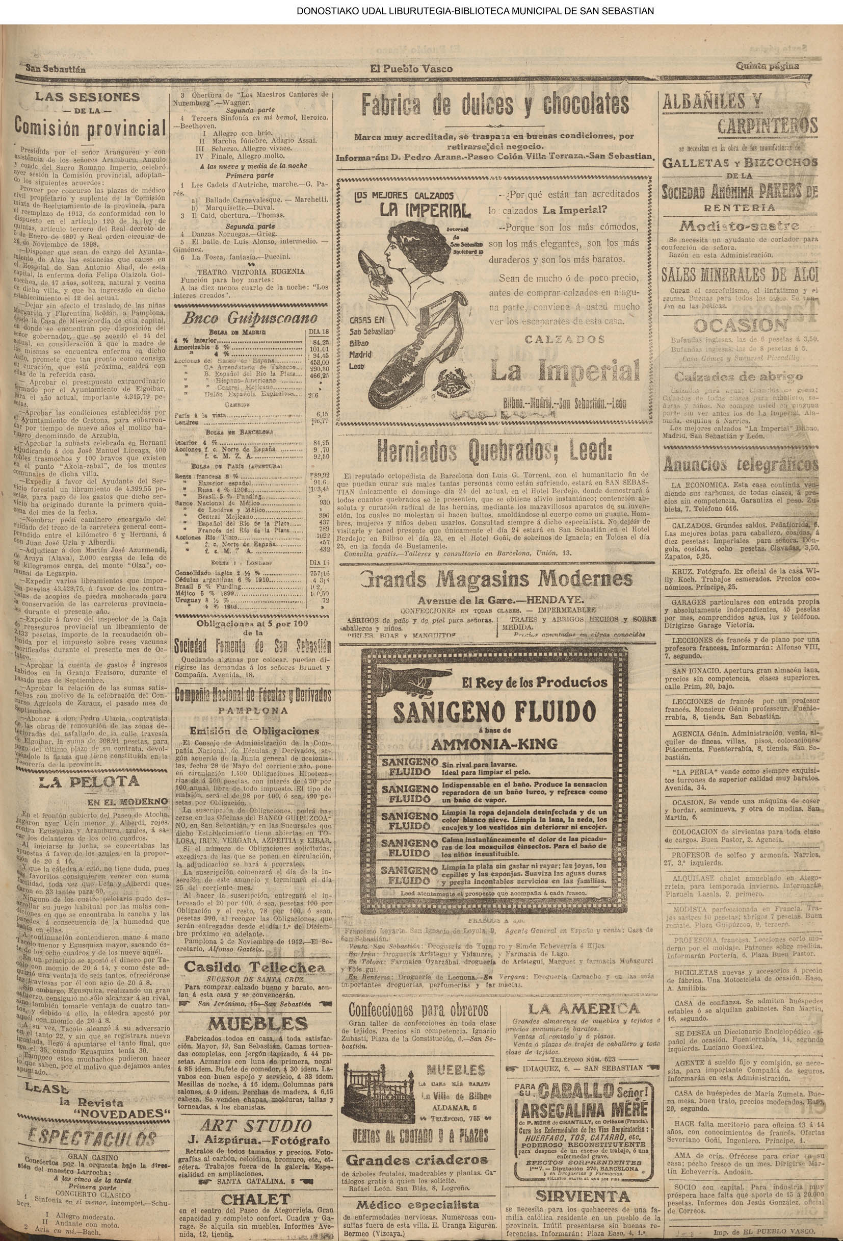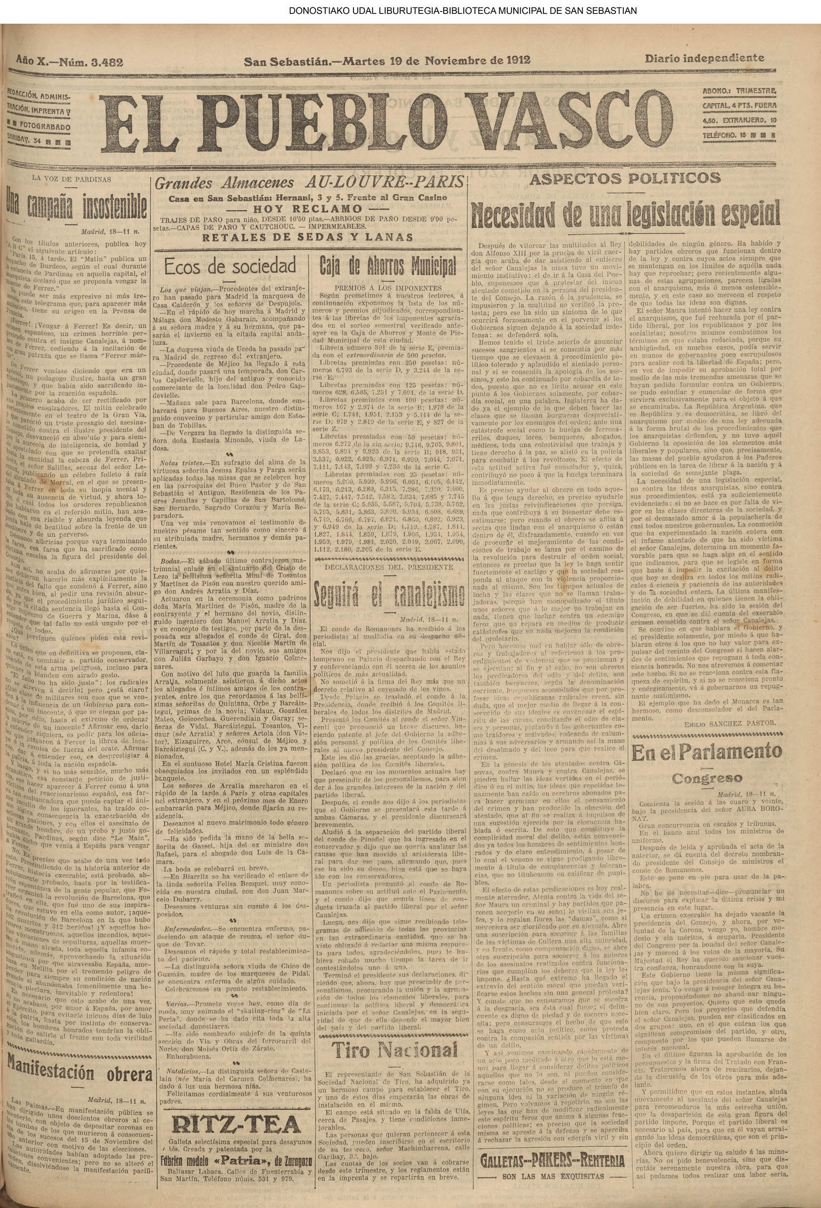 | # EL DÍA (domingo)– Fue el día inseguro, pero bueno, a excepción de las primeras horas de la mañana en las que llovió a ratos, despejando algo al mediodía. La tarde con agradabilísima temperatura, permitió que los paseantes se solazaran sin agua ni viento. En el mar continuó la borrasca, mostrándose inaccesible a todo. Por eso los pesqueros se mantuvieron en la dársena y los vapores grandes de la misma clase en su fondeadero de Pasajes. En la Brecha no entró cantidad alguna de fresco, llegando de Francia, para ser hoy puesta a la venta, bastante angula. |