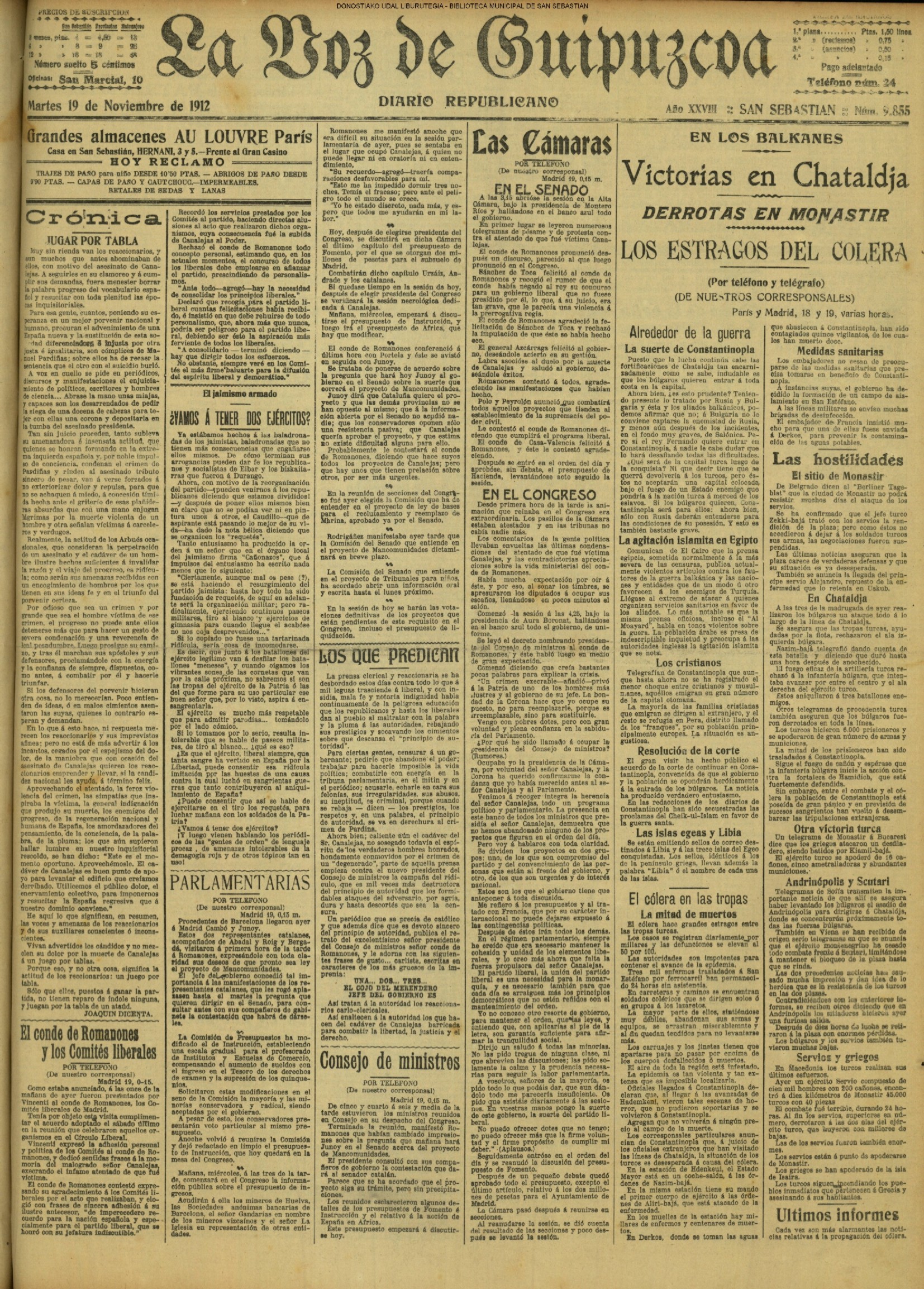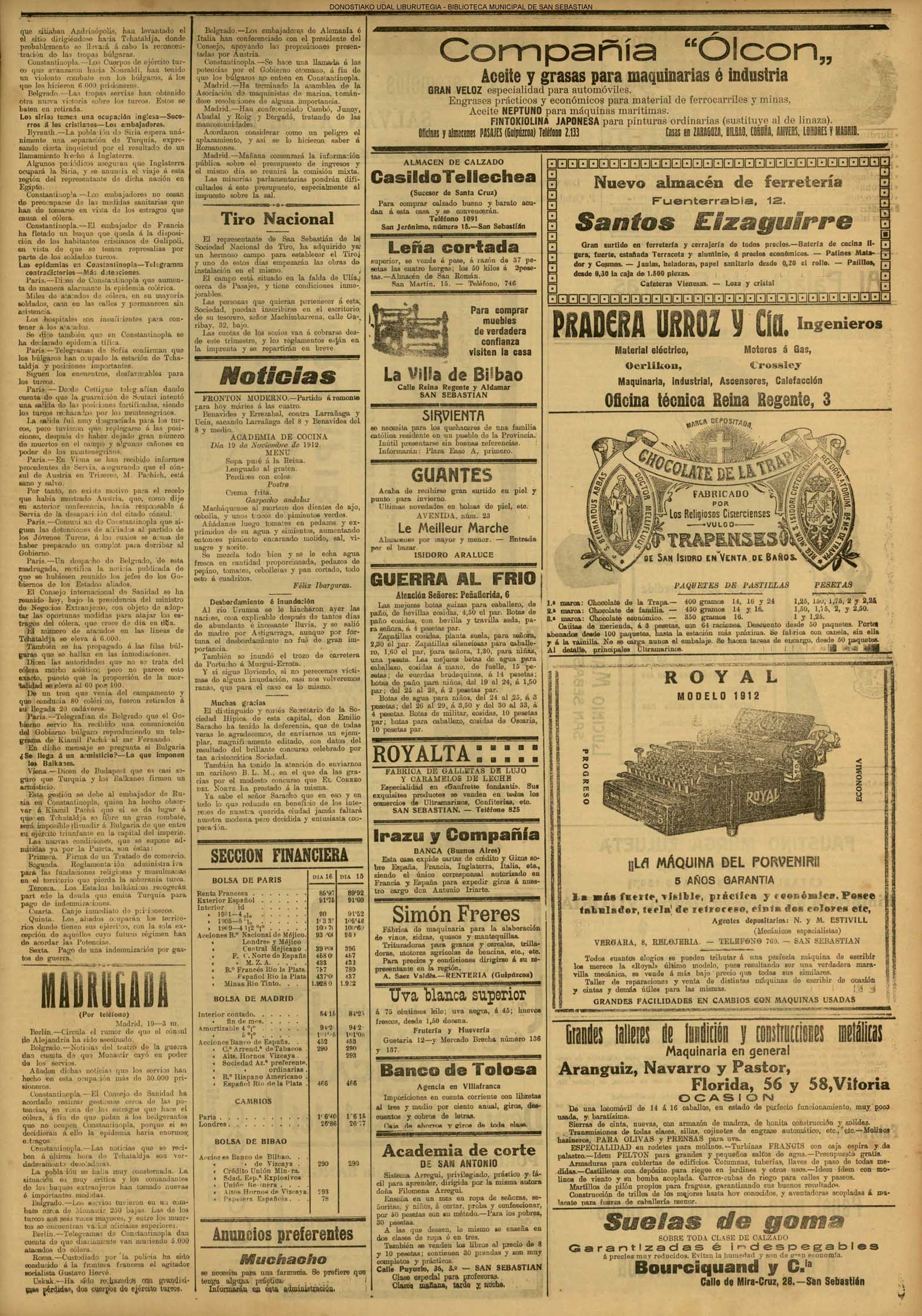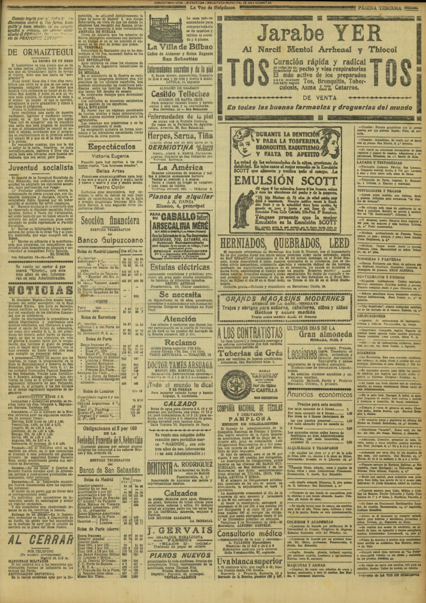 | # EL DÍA (domingo)– Fue el día inseguro, pero bueno, a excepción de las primeras horas de la mañana en las que llovió a ratos, despejando algo al mediodía. La tarde con agradabilísima temperatura, permitió que los paseantes se solazaran sin agua ni viento. En el mar continuó la borrasca, mostrándose inaccesible a todo. Por eso los pesqueros se mantuvieron en la dársena y los vapores grandes de la misma clase en su fondeadero de Pasajes. En la Brecha no entró cantidad alguna de fresco, llegando de Francia, para ser hoy puesta a la venta, bastante angula. |