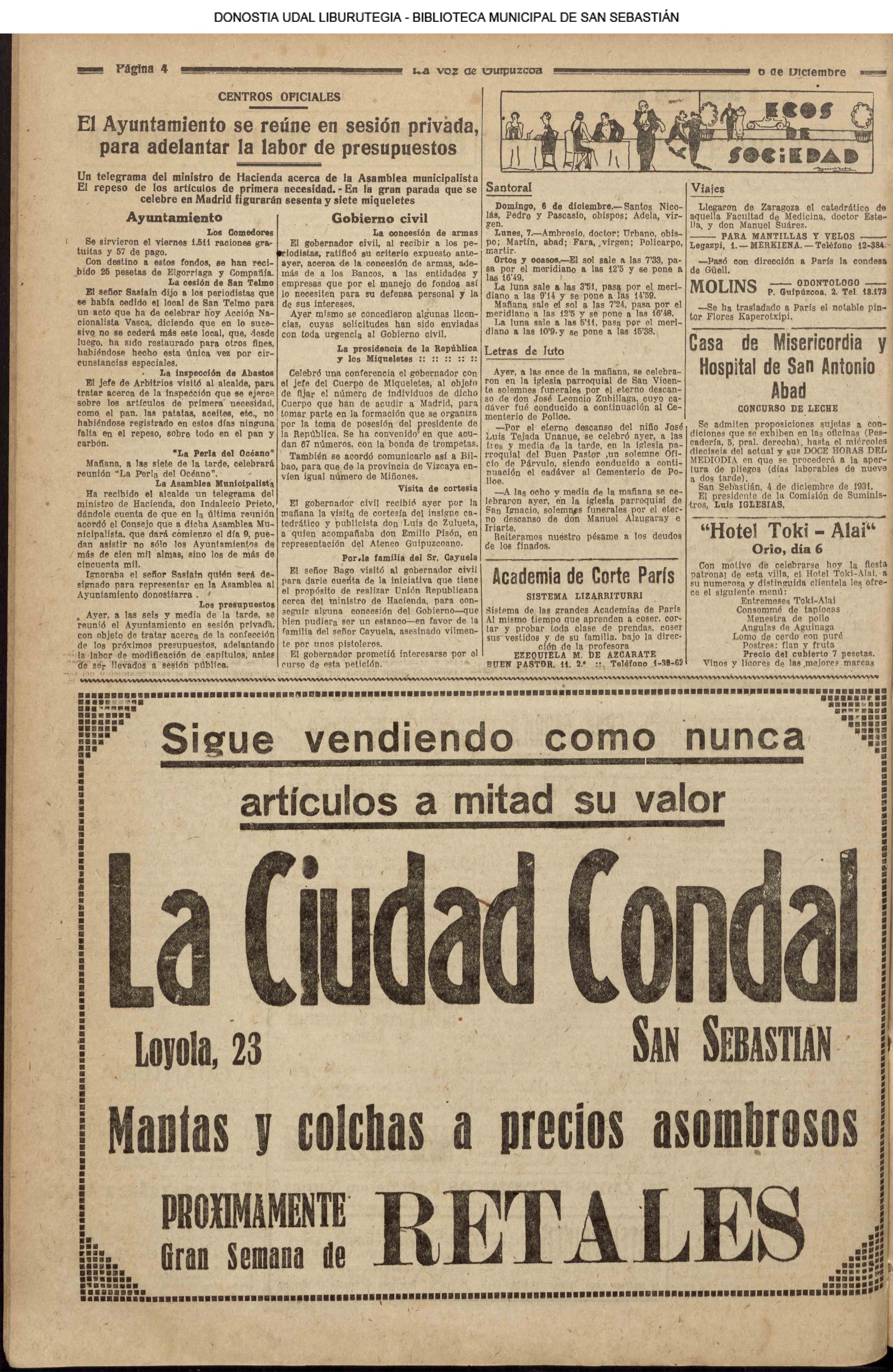 *********************************************** (PRENSA DEL DÍA) # LA VOZ DE GUIPÚZCOA (PORTADA) .- A propuesta del Sr. Calvo Sotelo parece que van a prorrogarse los presupuestos en el primer trimestre de 1935. ------------------------------------------------------------- # LA VOZ DE GUIPÚZCOA. .- Mejoras donostiarras . Se han iniciado las obras de edificación del Hospital Mixto. (pág.06) .- CENTROS OFICIALES: .-AYUNTAMIENTO : .- Preparando la fiesta del niño .- La limpieza de las calles .- La limpieza de los patios .- Las anomalías del teléfono 3200 .- Los comedores de Asistencia Social .- Nota de la Alcaldía. .- DIPUTACIÓN : .- La Caja de Ahorros .- Otras reuniones. .- GOBIERNO CIVIL : .- La colocación de los músicos .- Hoy se celebra "El día del niño" .- Un donativo .- Personal de Gobernación .-INFORMACIÓN DE LA NOCHE: .-Recogida y entrega de armas .- La asamblea de obreros y empleados municipales .- El trabajo de los peluqueros .- La construcción de un edificio para Gobierno Civil .