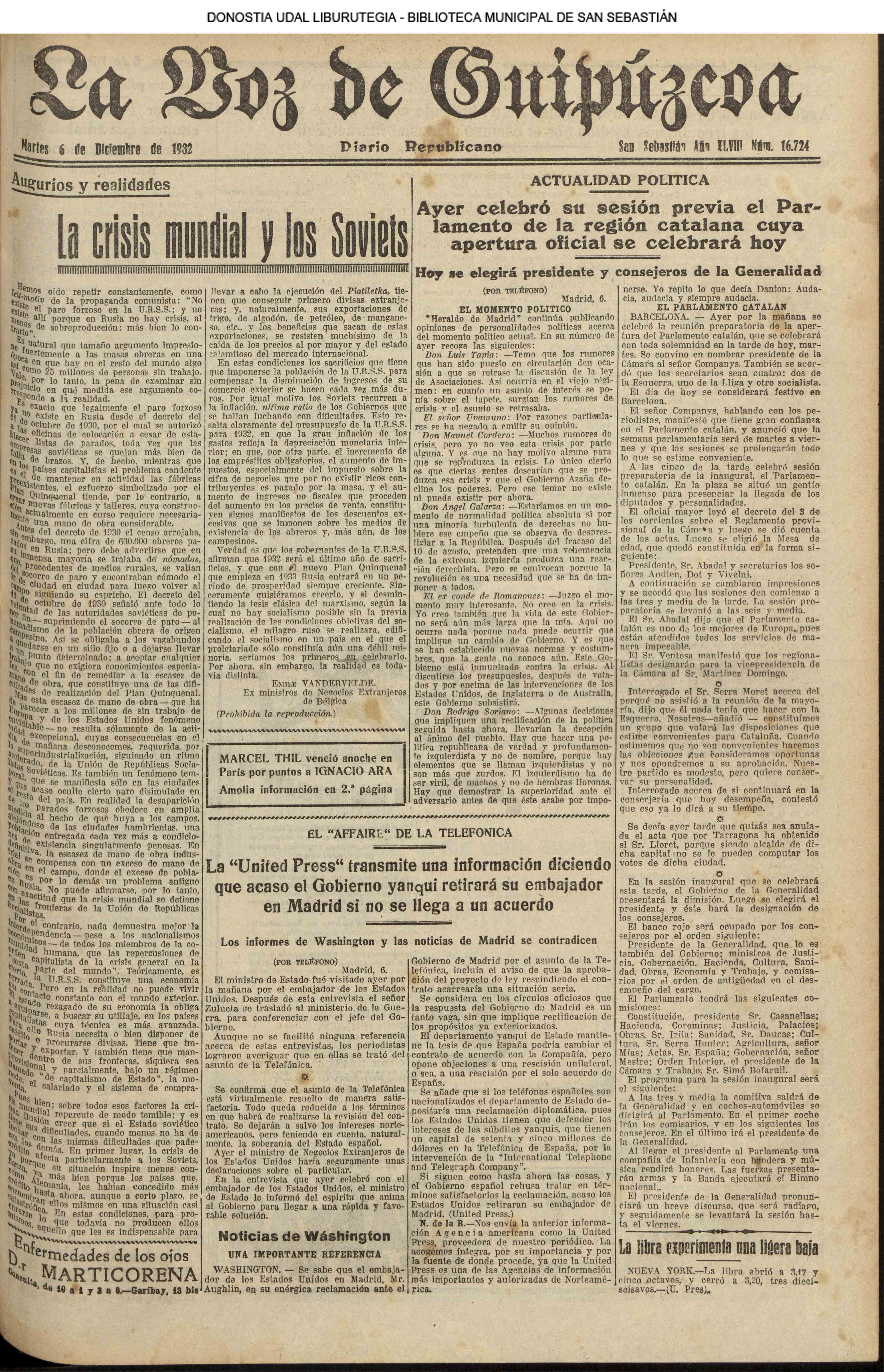 (*).- CELEBRA SESIÓN INAUGURAL EL PARLAMENTO DE LA REGIÓN CATALANA, siendo elegido Presidente interino don Luis Companys (LVG)(EL DÍA)(EL PUEBLO VASCO)