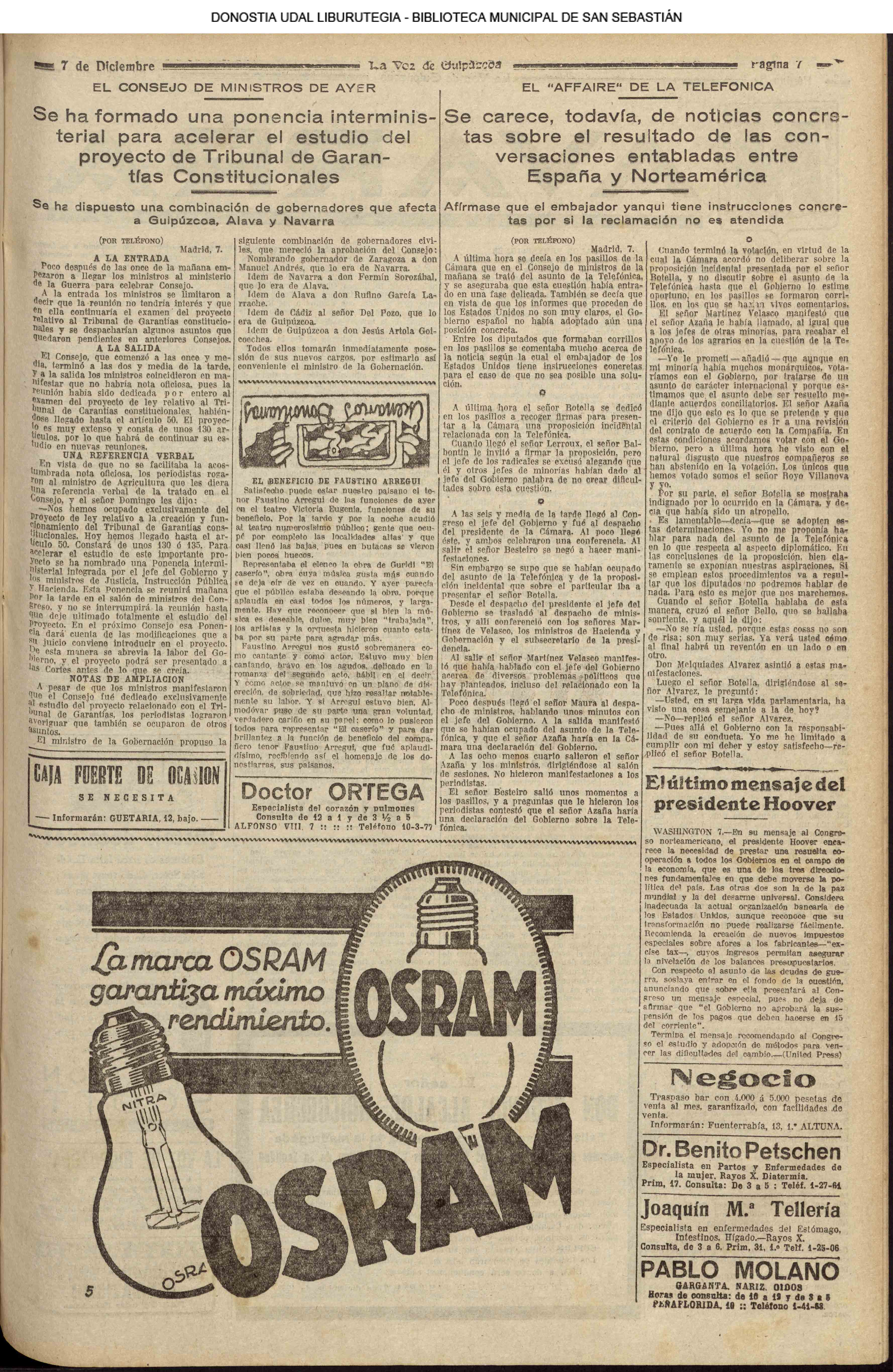 (*).- El Gobierno autoriza al Ayuntamiento donostiarra a elevar las tarifas del teléfono interurbano (LA CONSTANCIA)(EL PUEBLO VASCO) (*).- HORARIO ABSURDO : Horario de comidas : Almuerzo de doce a dos tarde; comida, de siete y media a nueve noche)(EL PUEBLO VASCO)
