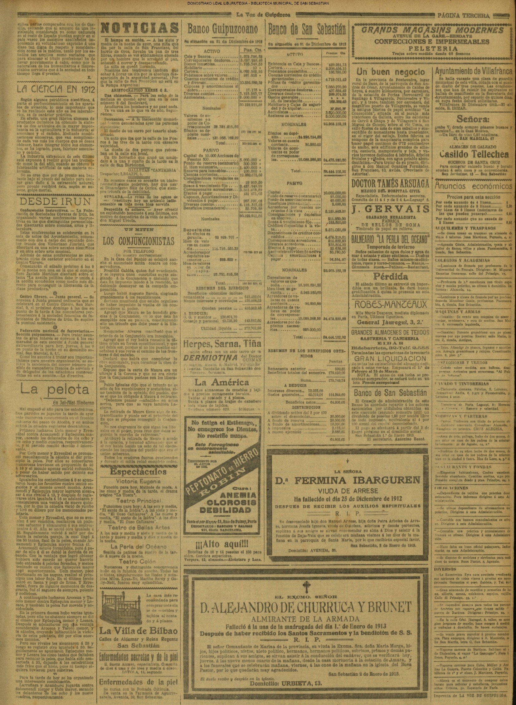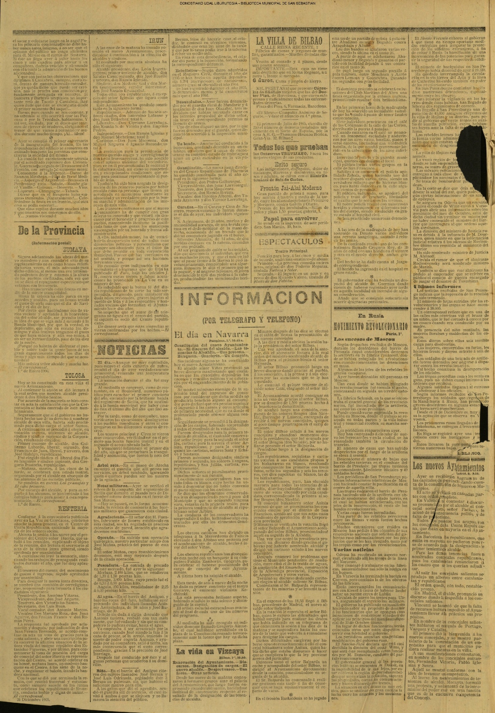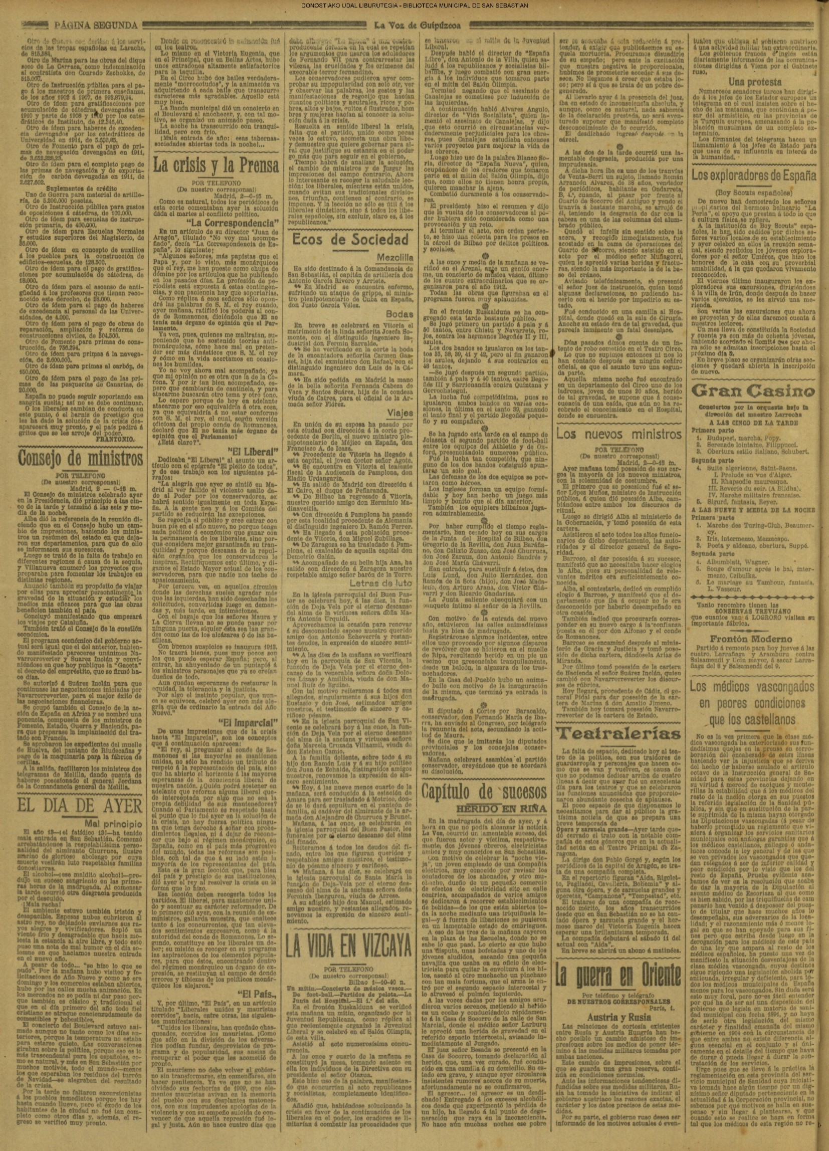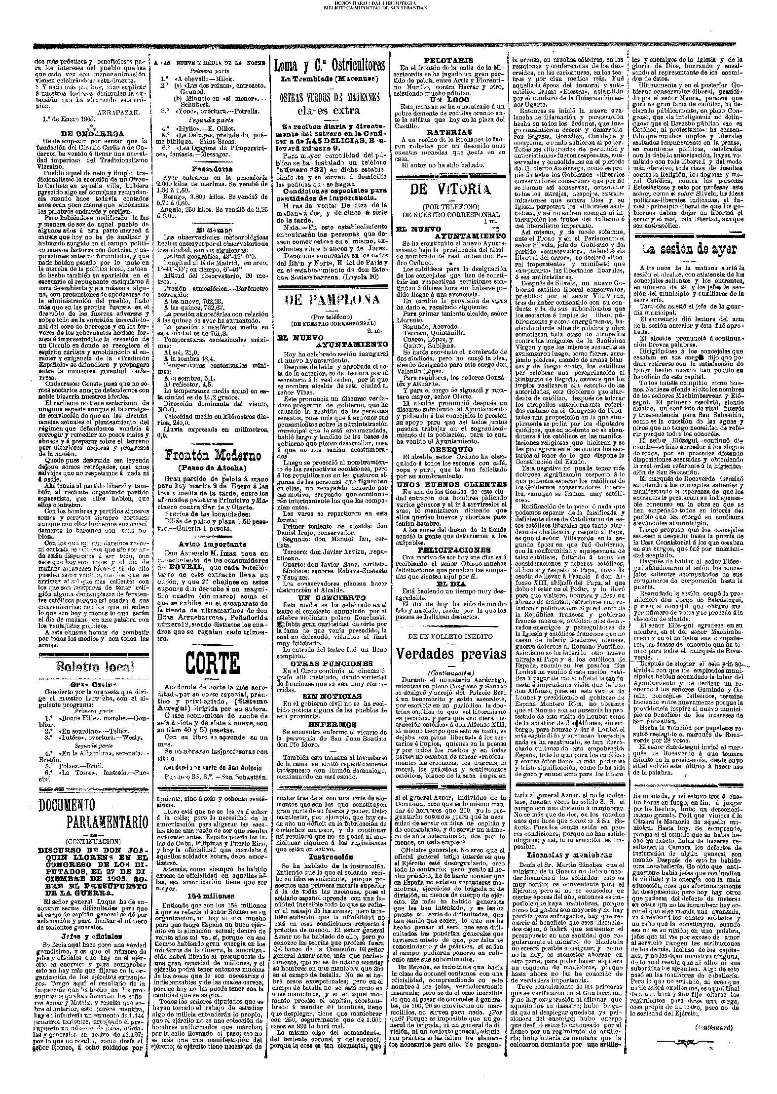(01)(PORTADA)-¡1908!.-..-EL PRESUPUESTO DE SAN SEBASTIÁN(!!!!).-..-AYUNTAMIENTO. Sesión del día 31 de diciembre de 1907.- (02).AYUNTAMIENTO. Sesión del día 31 de diciembre de 1907.(cont.)-NOTICIAS.-....... (03).BARCELONA. Otra bomba....(04).LA CONSTANCIA(01/01)-----------------------------------------------------(01)(PORTADA)-...-Frontón Moderno.-....-NOTAS MUNICIPALES.La sesión de ayer.-.... (02).-NOTAS MUNICIPALES.La sesión de ayer(cont.)-...-El terrorismo en Barcelona....(03).(04) EL CORREO DE GUIPÚZCOA(01/01)-------------------------------------------------(01)(PORTADA)-CRÓNICA.-....-Bellas Artes.-...-Los atentados en Barcelona.-....-EN EL MUNICIPIO.La crisis de los pescadores.- (02).-EN EL MUNICIPIO.La crisis de los pescadores.-En la Casa Consistorial. La sesión de ayer.-(03).(04)EL PUEBLO VASCO(01/01)--------------------------------------------------(01)(PORTADA)-La votación de los ingresos.-....-El Terrorismo.Otra bomba en Barcelona.-bellas Artes(El concierto de ayer).-EN MOTRICO.Un hombre muerto.-ECOS DE SOCIEDAD.-...-LAS CORPORACIONES. Las tardes del Municipio.-(02).-LAS CORPORACIONES. Las tardes del Municipio.(cont.)-...... |