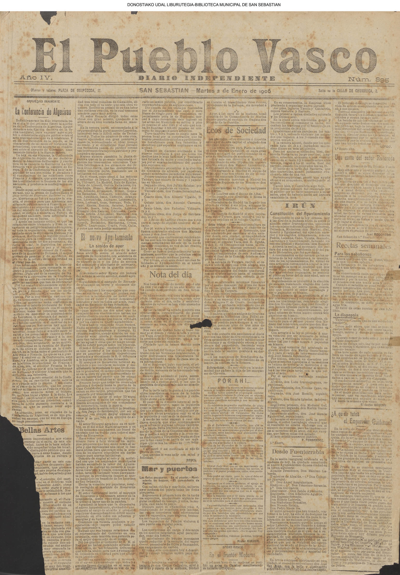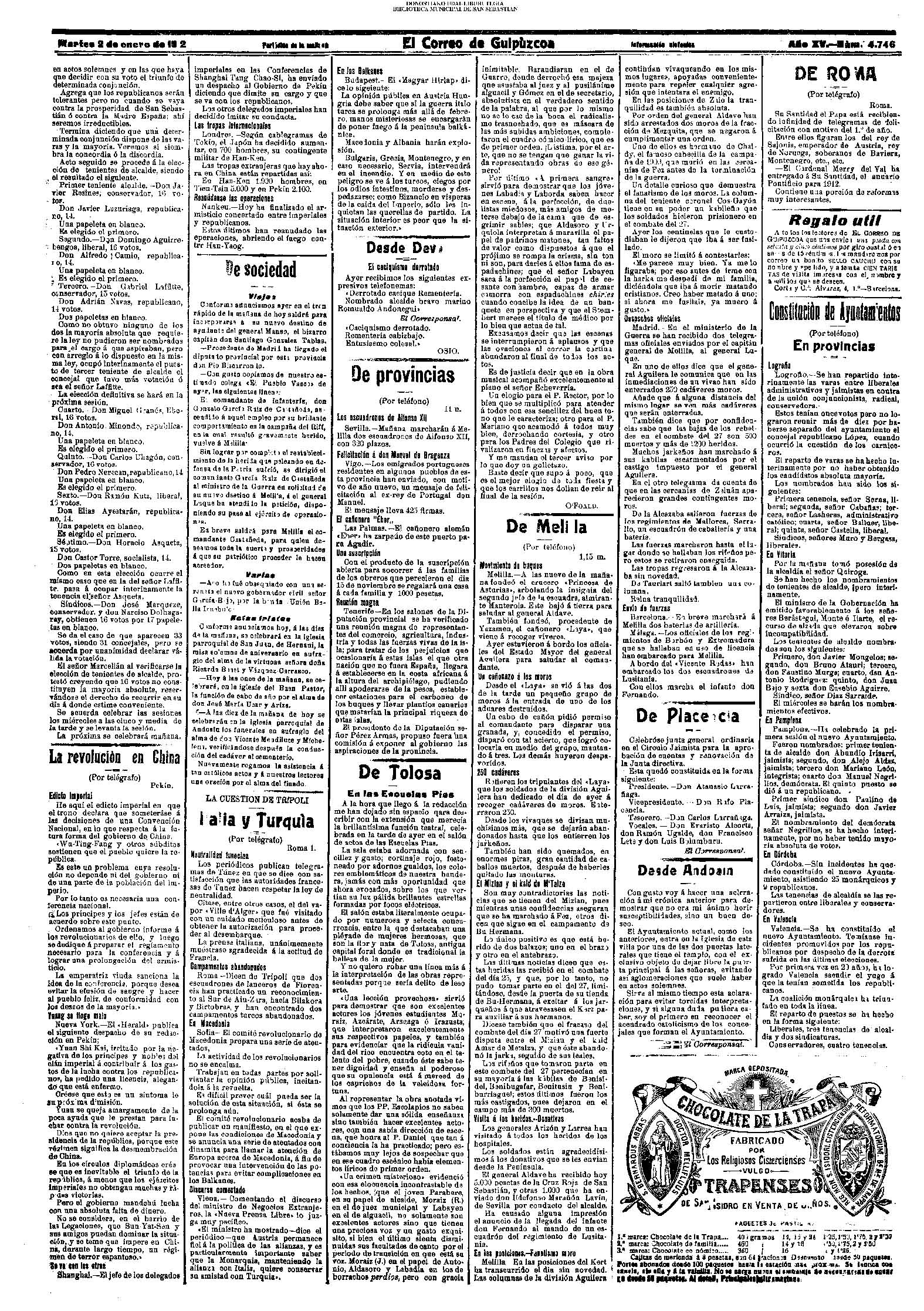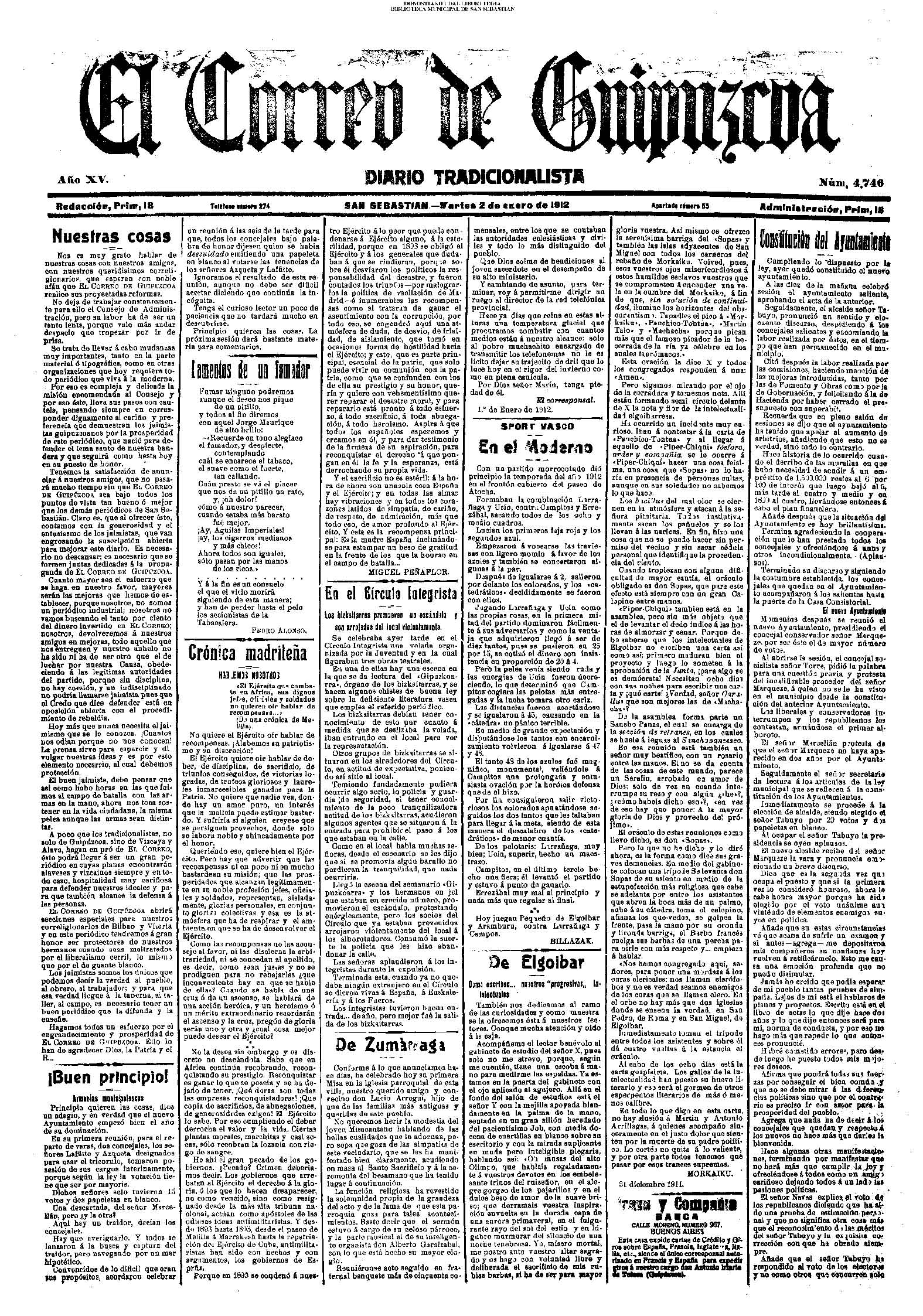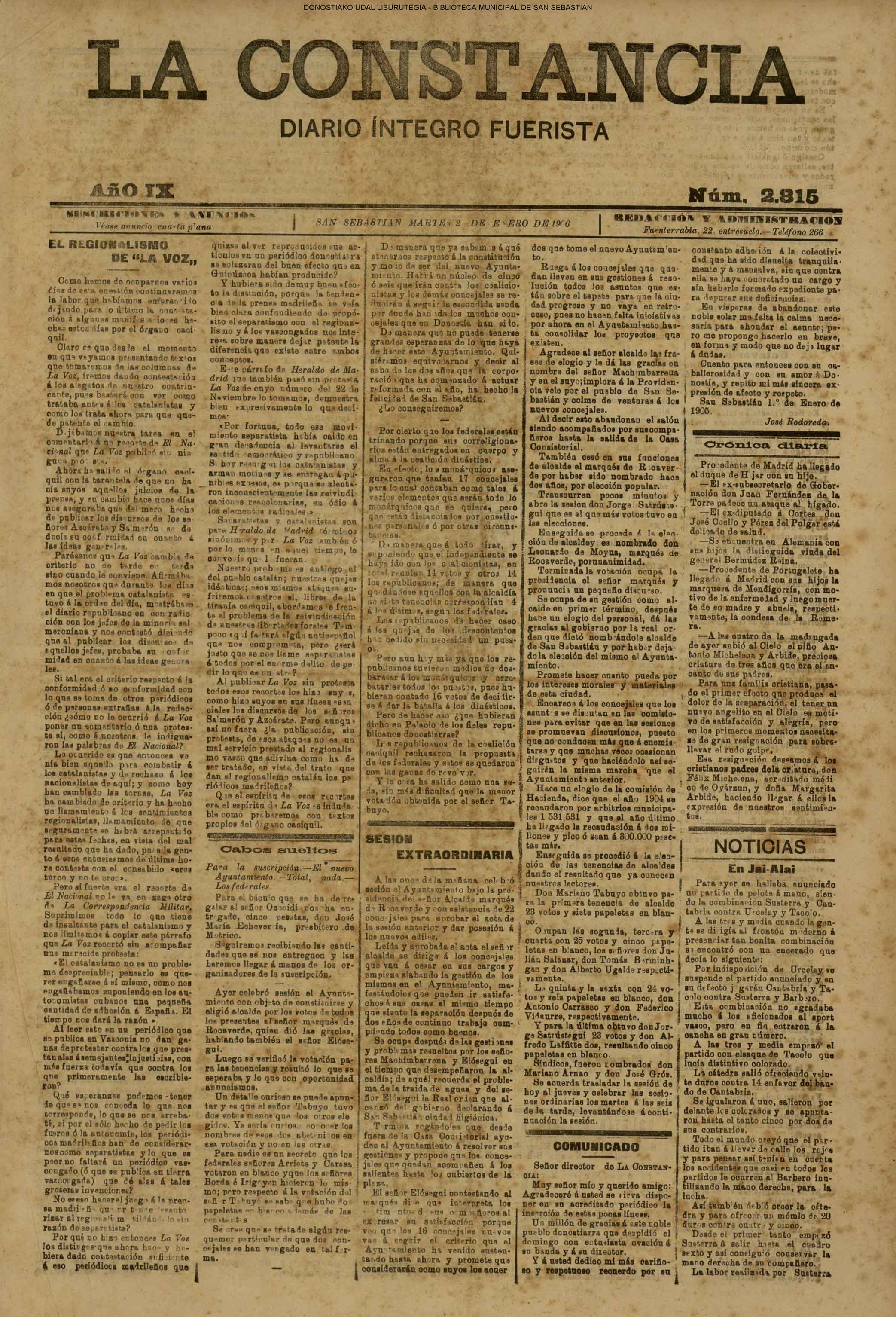 (01)(PORTADA)-¡1908!.-..-EL PRESUPUESTO DE SAN SEBASTIÁN(!!!!).-..-AYUNTAMIENTO. Sesión del día 31 de diciembre de 1907.- (02).AYUNTAMIENTO. Sesión del día 31 de diciembre de 1907.(cont.)-NOTICIAS.-....... (03).BARCELONA. Otra bomba....(04).LA CONSTANCIA(01/01)-----------------------------------------------------(01)(PORTADA)-...-Frontón Moderno.-....-NOTAS MUNICIPALES.La sesión de ayer.-.... (02).-NOTAS MUNICIPALES.La sesión de ayer(cont.)-...-El terrorismo en Barcelona....(03).(04) EL CORREO DE GUIPÚZCOA(01/01)-------------------------------------------------(01)(PORTADA)-CRÓNICA.-....-Bellas Artes.-...-Los atentados en Barcelona.-....-EN EL MUNICIPIO.La crisis de los pescadores.- (02).-EN EL MUNICIPIO.La crisis de los pescadores.-En la Casa Consistorial. La sesión de ayer.-(03).(04)EL PUEBLO VASCO(01/01)--------------------------------------------------(01)(PORTADA)-La votación de los ingresos.-....-El Terrorismo.Otra bomba en Barcelona.-bellas Artes(El concierto de ayer).-EN MOTRICO.Un hombre muerto.-ECOS DE SOCIEDAD.-...-LAS CORPORACIONES. Las tardes del Municipio.-(02).-LAS CORPORACIONES. Las tardes del Municipio.(cont.)-...... |