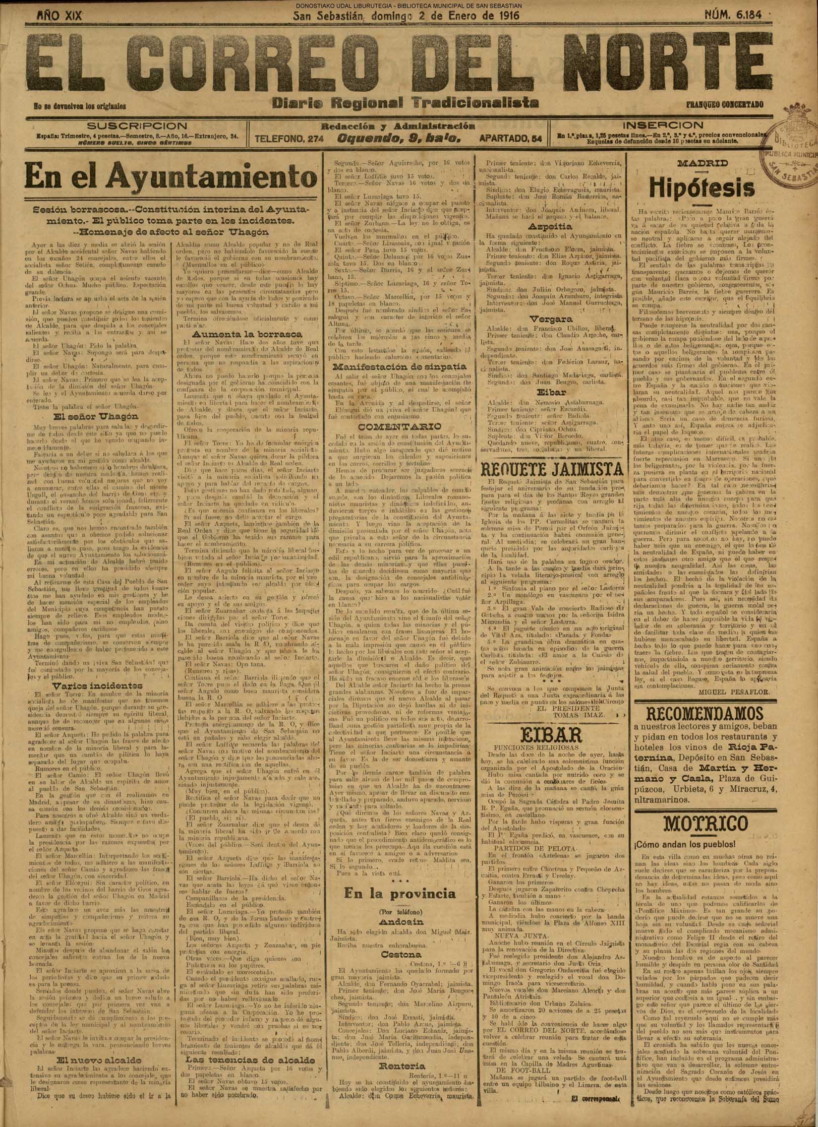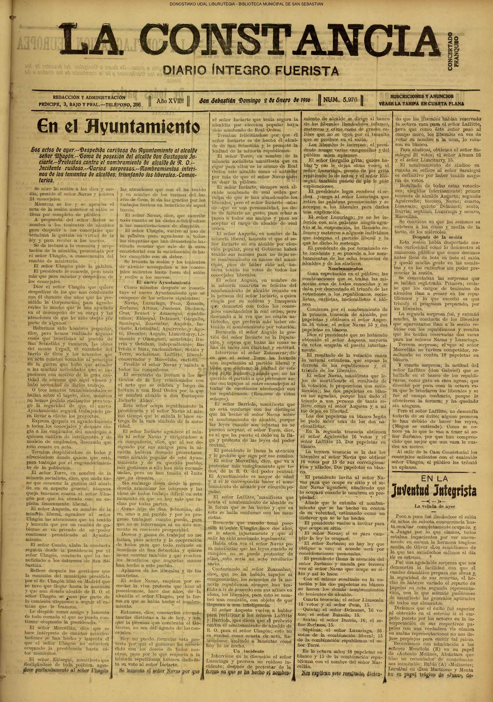 EN EL AYUNTAMIENTO - Despedida cariñosa del Ayuntamiento al Alcalde señor Uhagón - Toma de posesión del alcade D. Eustaquio Inciarte - Protestas contra el nombramiento de alcalde de R.O.- Incidente ruidoso - Varias sorpresas - Nombramientos interinos de los tenientes de alcalde, triunfando los liberales EN EL AYUNTAMIENTO - Sesión borrascosa - Constitución interina del Ayuntamiento - El público toma parte en los incidentes - Homenaje de afecto al señor Uhagón. LAS SESIONES EN EL AYUNTAMIENTO - En la de constitución se promueven numerosos incidentes - Triunfa provisionalmente, al repartirse los puestos, la coalición de liberales, mauristas e independientes |