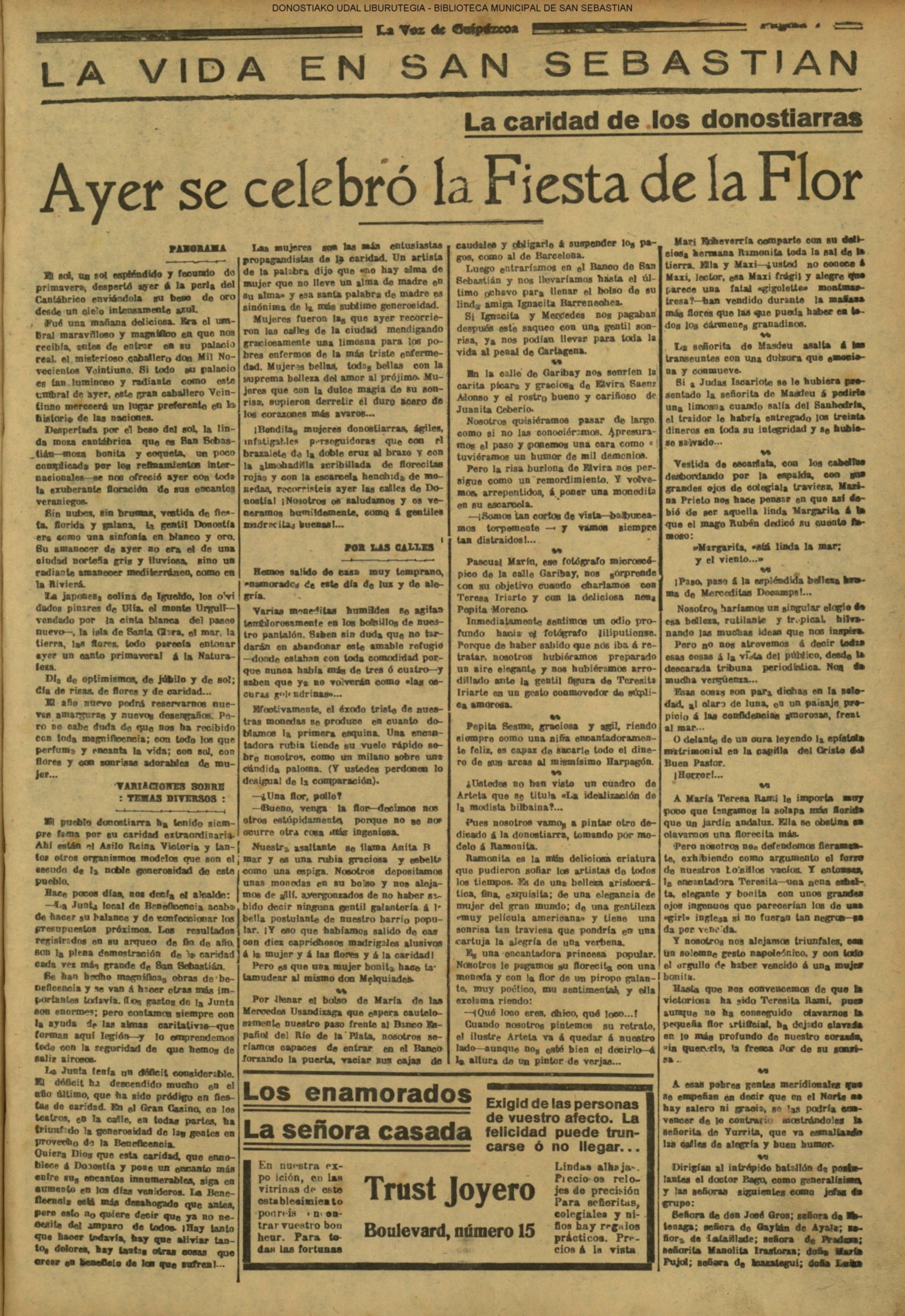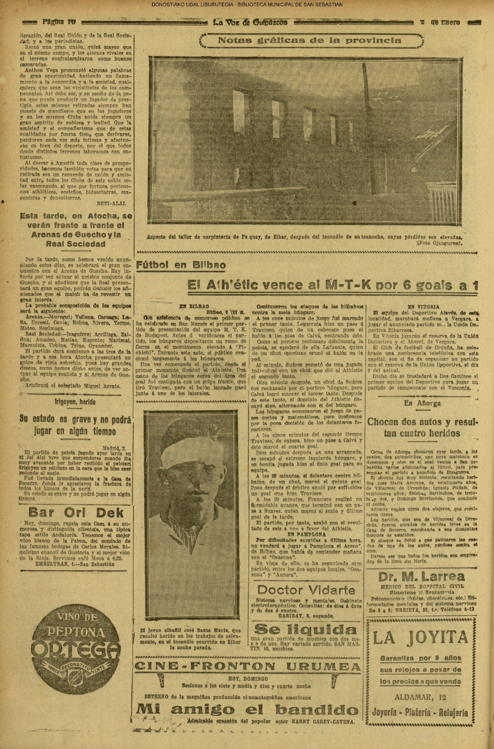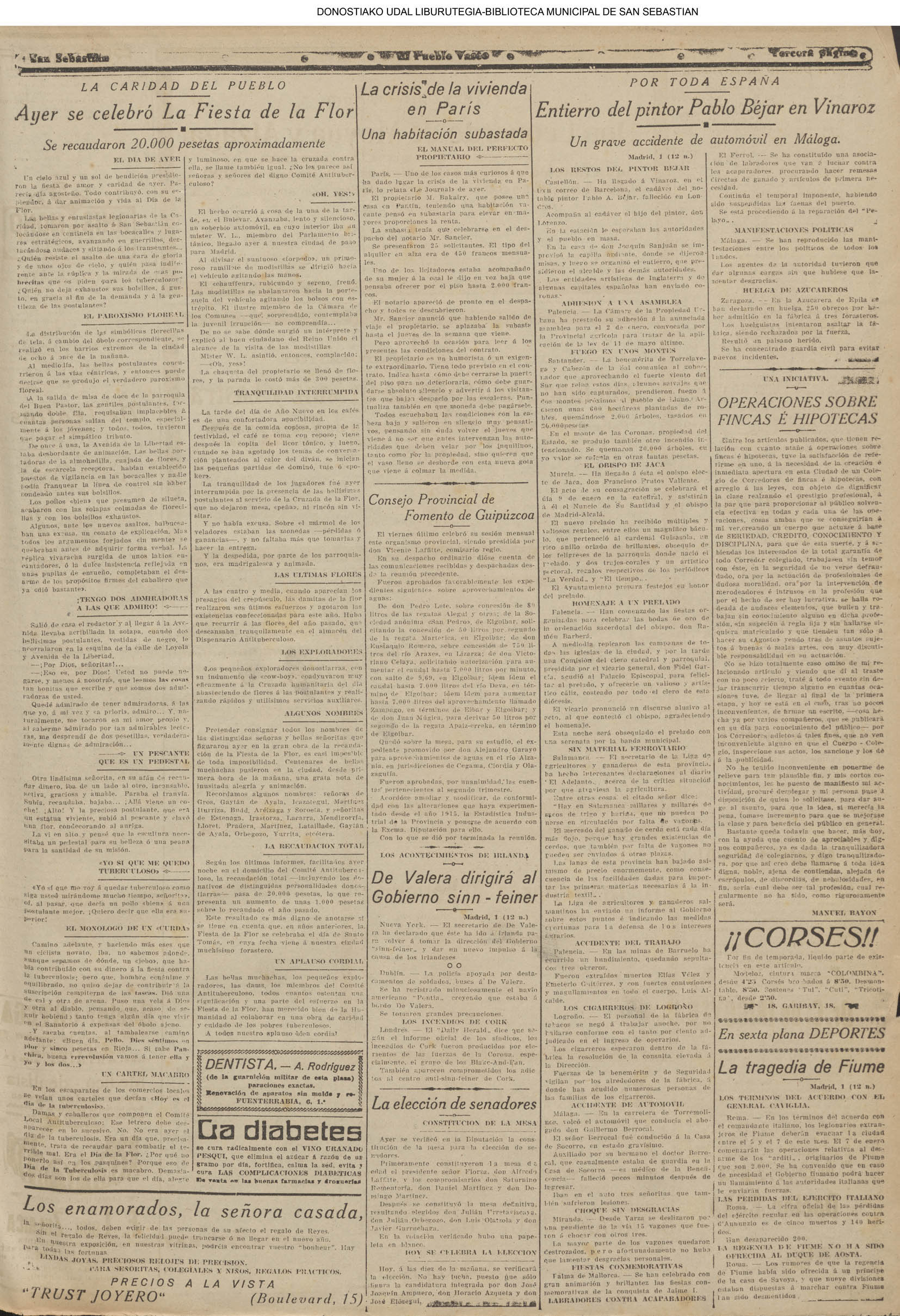 @ - En la tarde de este primer dia del año es erigida en parroquia la iglesia de los Padres Franciscanos, de Atocha. Con tal motivo tiene lugar un solemne acto presidido por el obispo de la diócesis, don Lorenzo Bereciartua. Primeramente se celebró una misa y acto seguido se dió lectura al decreto de erección, en el que quedan señalados los límites de la nueva parroquia, y en el que se nombra cura ecónomo al Padre Jesús Biain. (*) Se declara hacia las tres de la tarde un conato de incendio en los bajos del edificio del Gobierno Civil, comenzando a arder algunos muebles allí depositados. El accidente tuvo gran aparato, debido a la gran cantidad de humo que se formó, pero el fuego fue sofocado por los bomberos donostiarras en menos de tres cuartos de hora. (*)- Tiene lugar en el apeadero de Gros, alrededor de las cinco de la tarde, un mortal accidente al ser atropellado y muerto por un tren tranvía don Isaac Núñez Pinto, de 80 años de edad y domiciliado en la avenida del Baztán |