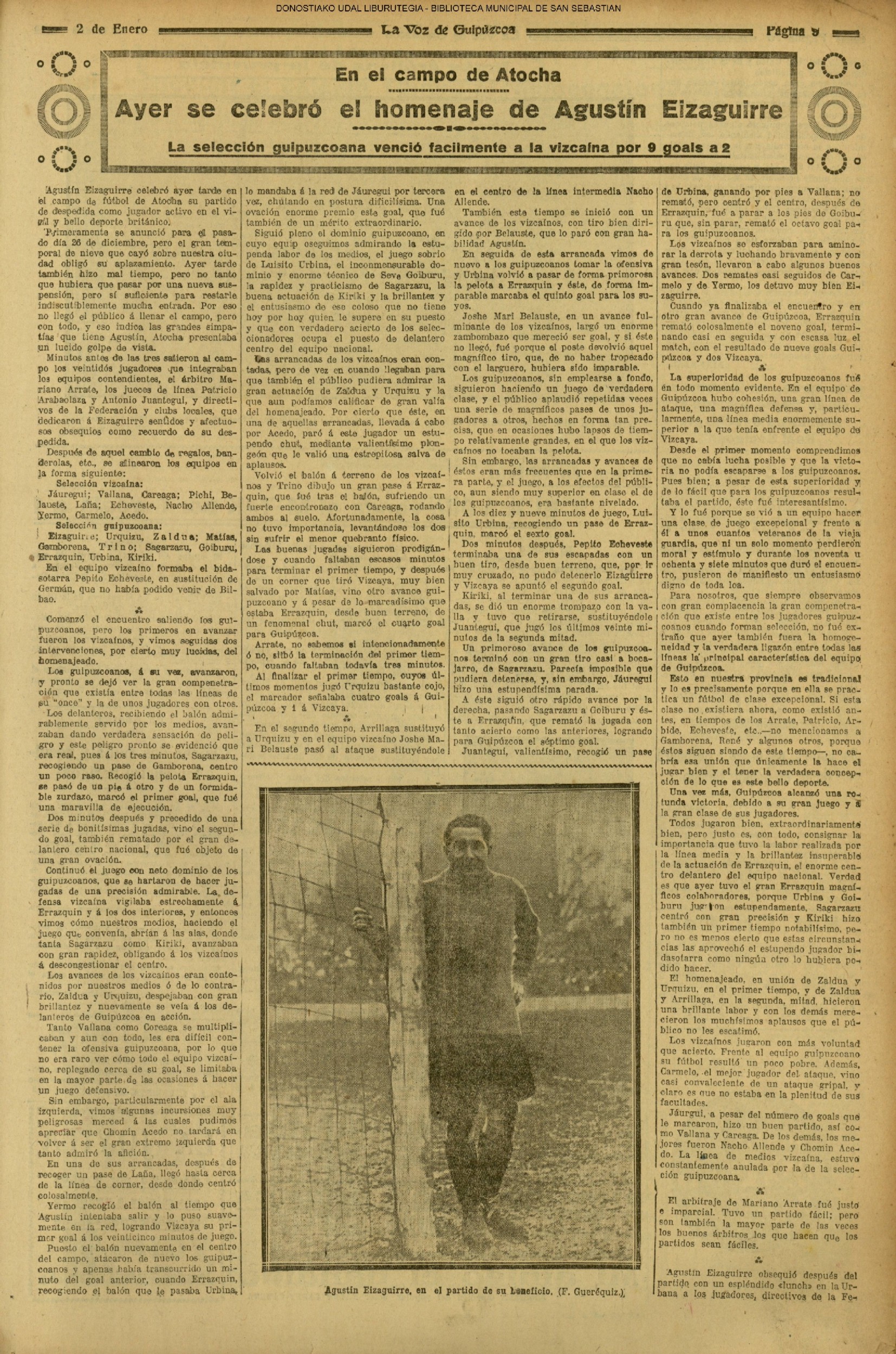 (1927) FOOTBALL -EN el campo de ATOCHA, se celebró el HOMENAJE a Agustín Eizaguirre - La selección guipuzcoana venció fácilmente a la vizcaína por 9 goals a 2 (La Voz de Guipúzcoa/cont)(El Pueblo Vasco)(El Pais Vasco)(La Constancia) |