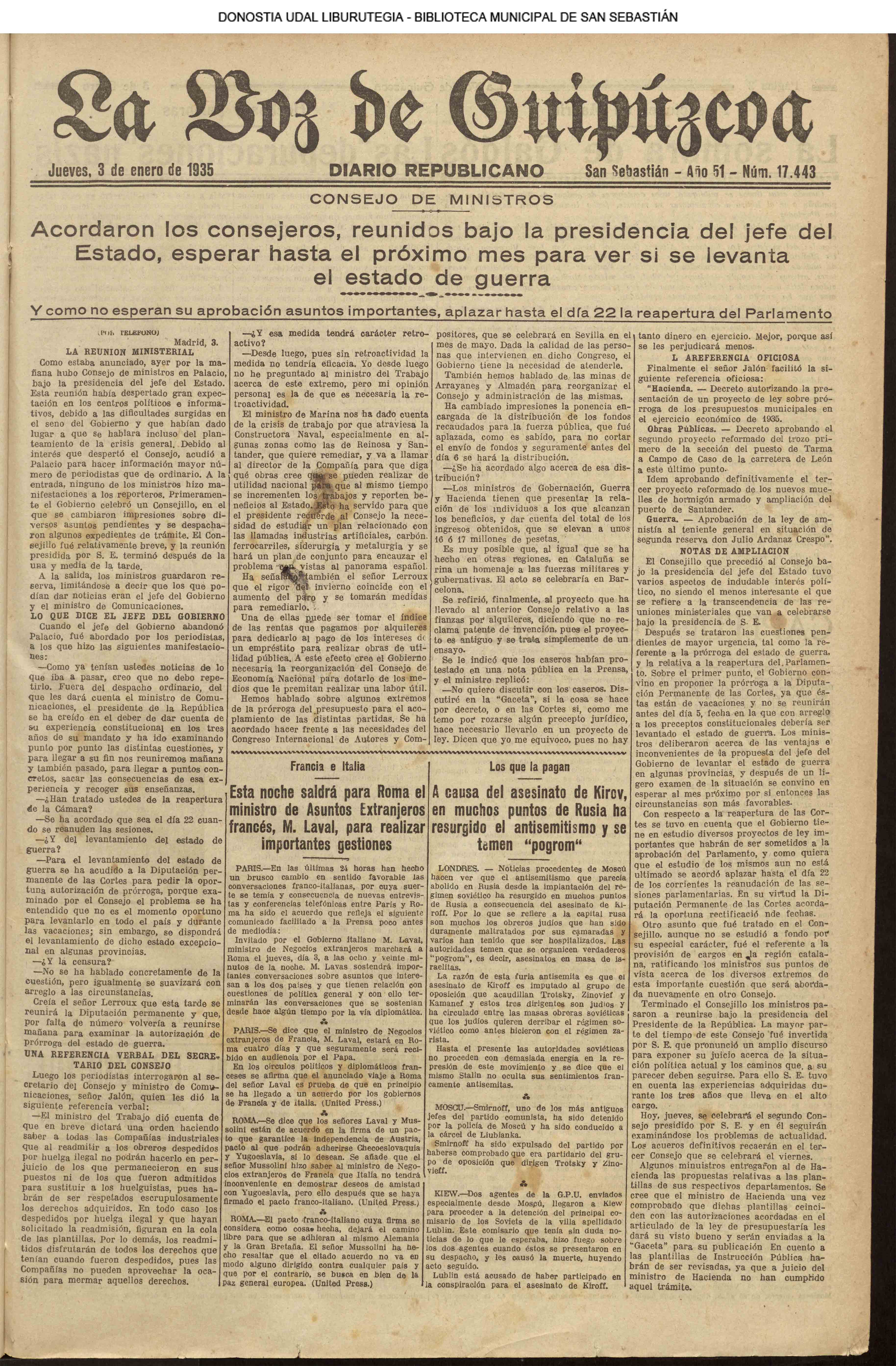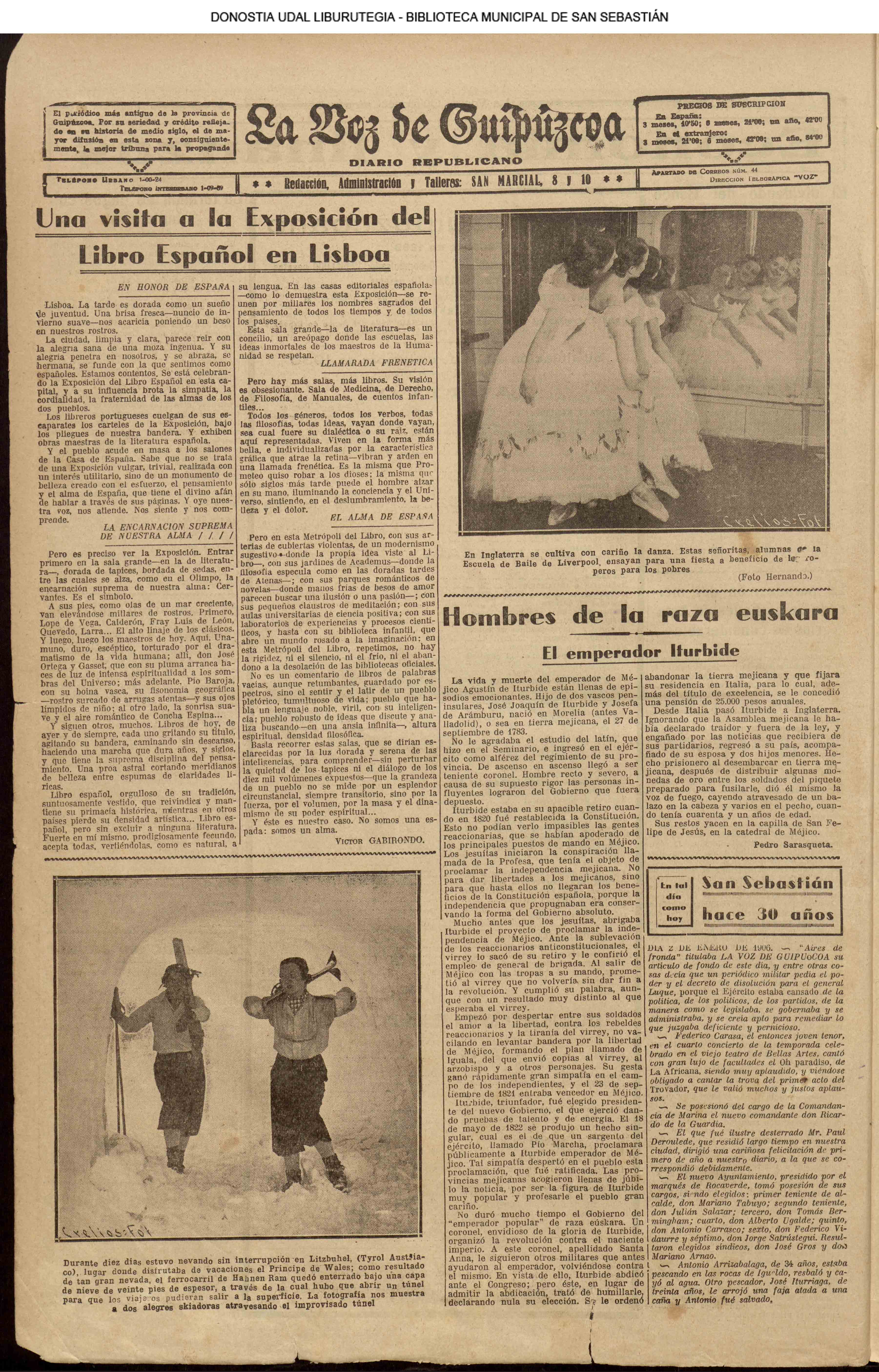 #La Voz de Guipúzcoa: diario republicano (0001.pdf) 001.- CONSEJO DE MINISTROS - Nada tendía de extraño que el decreto de disolución estuviera ya firmado y en manos de quien haya de hacer uso de él. 007.- LAS COMISIONES GESTORAS - Ayer por la mañana fueron destituidas las Gestoras, provincial de Guipúzcoa y municipal de San Sebastián. 016.- Hombres de la raza euskara - El emperador Iturbide (p. sarasqueta) |