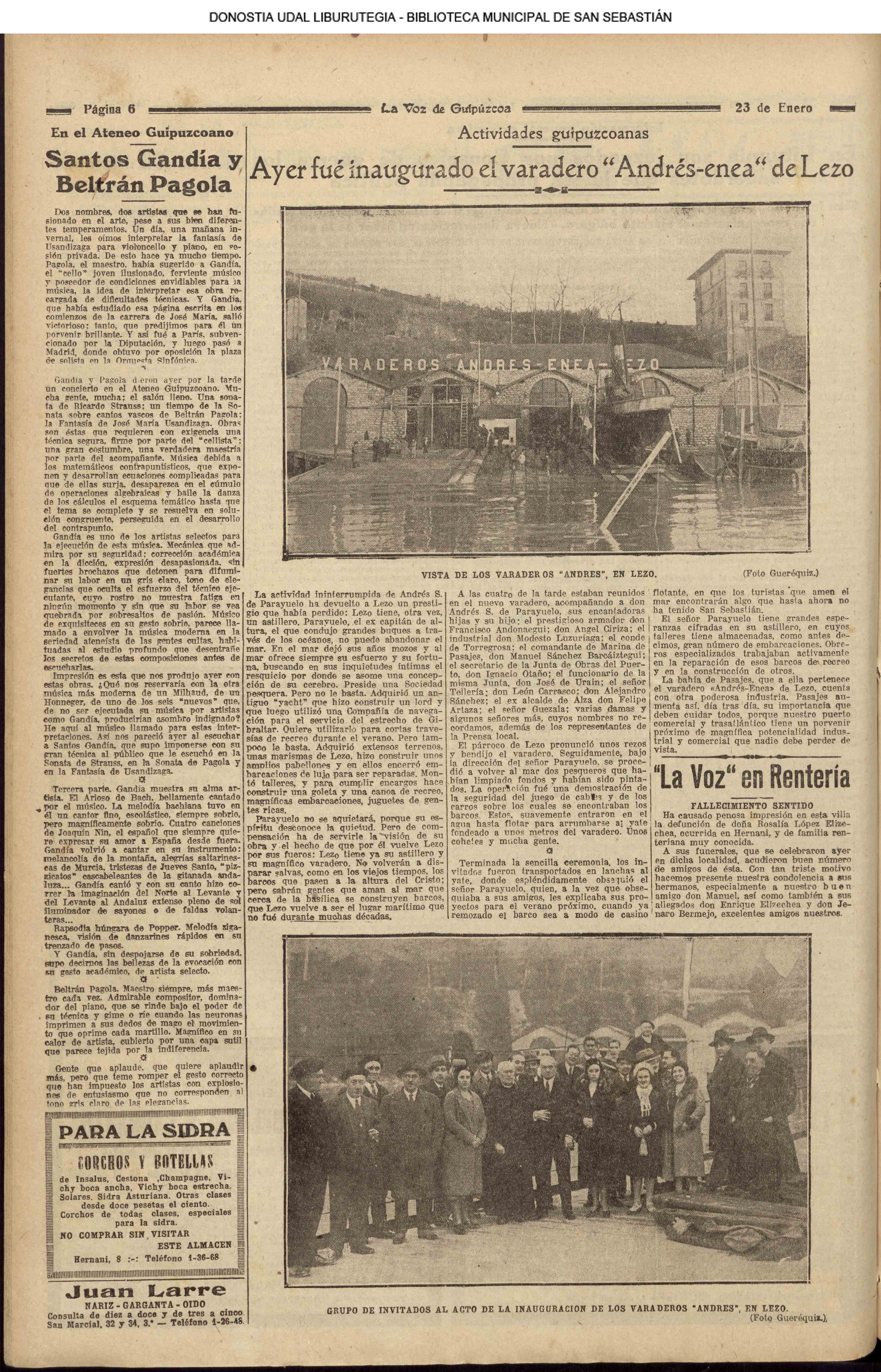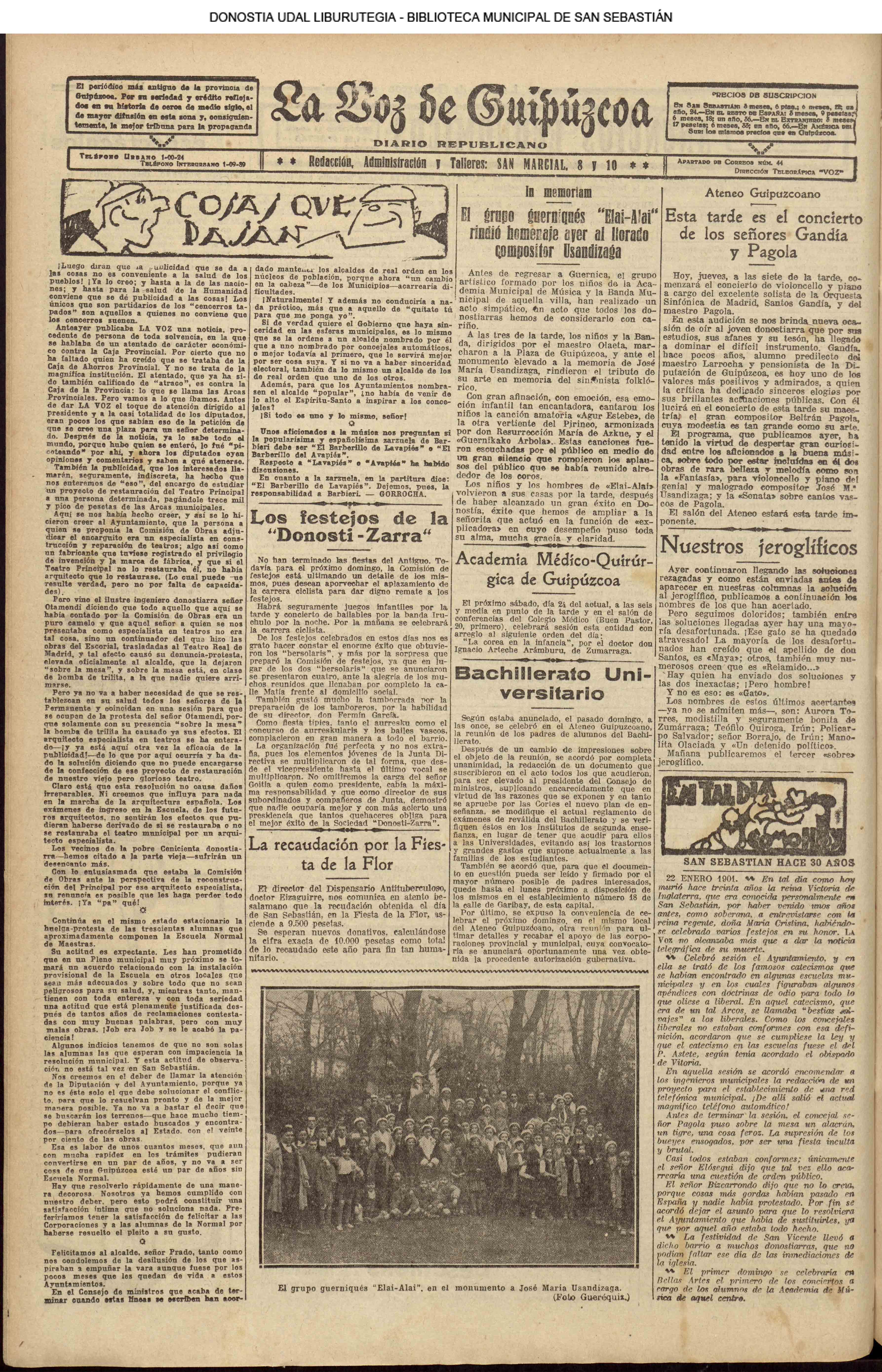 # CONDECORADOS # VEINTICUATRO HORAS DE SAN SEBASTIÁN .- Encargo de proyecto de acondicionamiento del viaducto de Iztueta. .- Sesión de la Permanente Municipal // Diputación // Escuela Profesional de Comercio de San Sebastián // Conferencia de Carlos Arean // Reunión de contribuyentes del Ensanche de Amara // Resultado de la rifa benéfica de Santo Tomás // Escuela Teológica para seglares // Delegación de Hacienda // Academia Médico-Quirúrgica // C.A.R.S. //Conferencia-Coloquio en la Cámara de Industria. .- COSAS DE LA CIUDAD .- SIRIMIRI ( Los pioneros .-Los "barmens".-La tamborrada infantil de Euskal Billera.-Pájaros) # GUIPÚZCOA, HOMBRES Y PROBLEMAS # AYER PLENO MUNICIPAL # CRÓNICA DONOSTIARRA # HORA X HORA |
