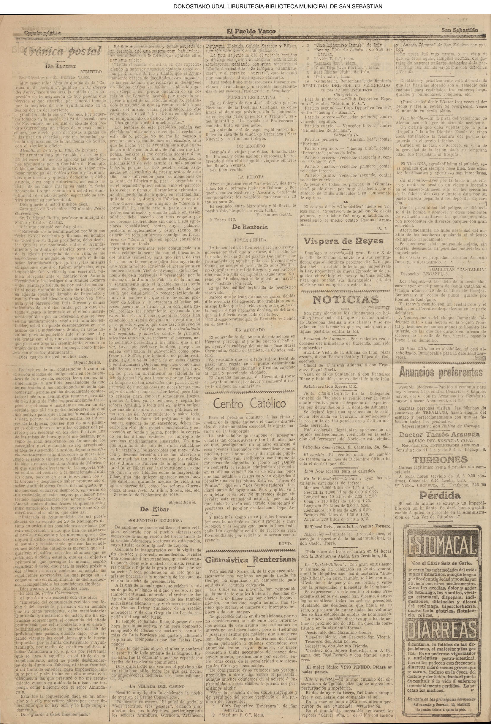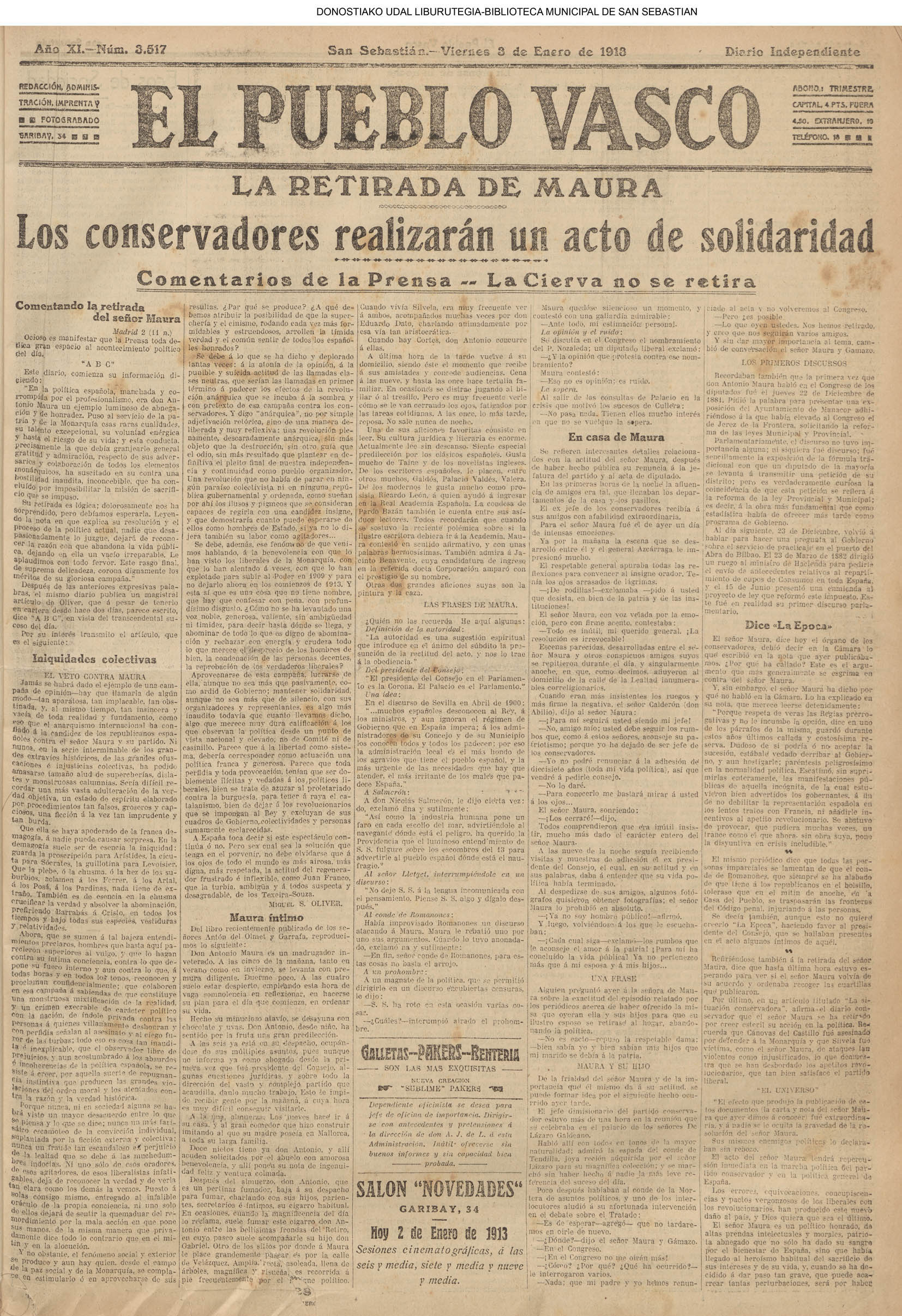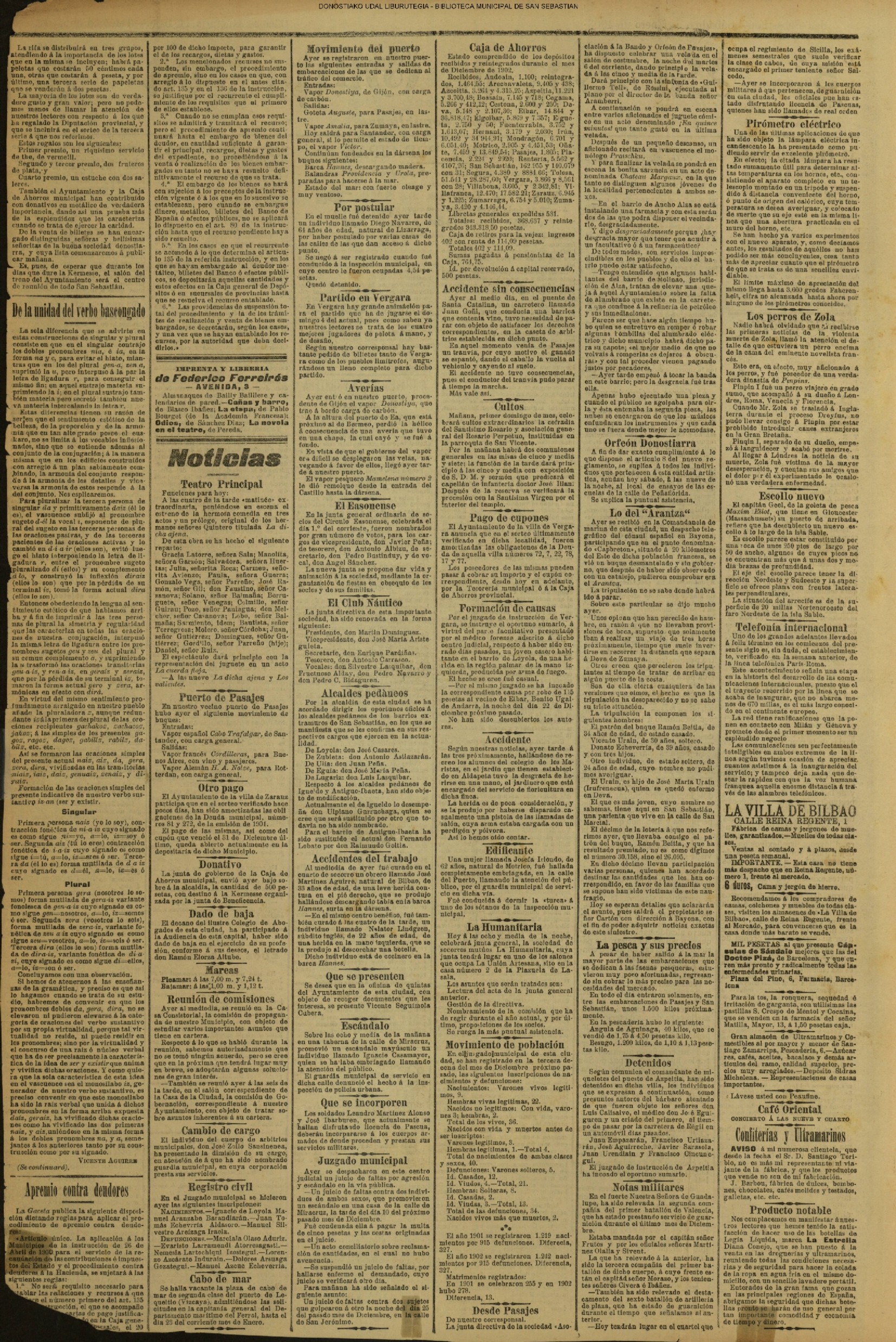 | A propuesta de la Junta del Centenario, sobre rotulación de calles, se aprueba que a la calle que se dirige desde la Estación del Norte hacia el puente de Santa Catalina se denomine "Paseo de Francia", a la plaza que se ha construido entre la calle Miracruz y el puente de Santa Catalina, "Plaza de Vasconia"; a la Plaza Elíptica que está entre el Paseo de Guernica y el de la Zurriola, "Plaza de España" y al Paseo de la Zurriola "Paseo de la República Argentina" (La Voz de Guipúzcoa/cont)(El Pueblo Vasco)(El Correo del Norte)(La Constancia) |