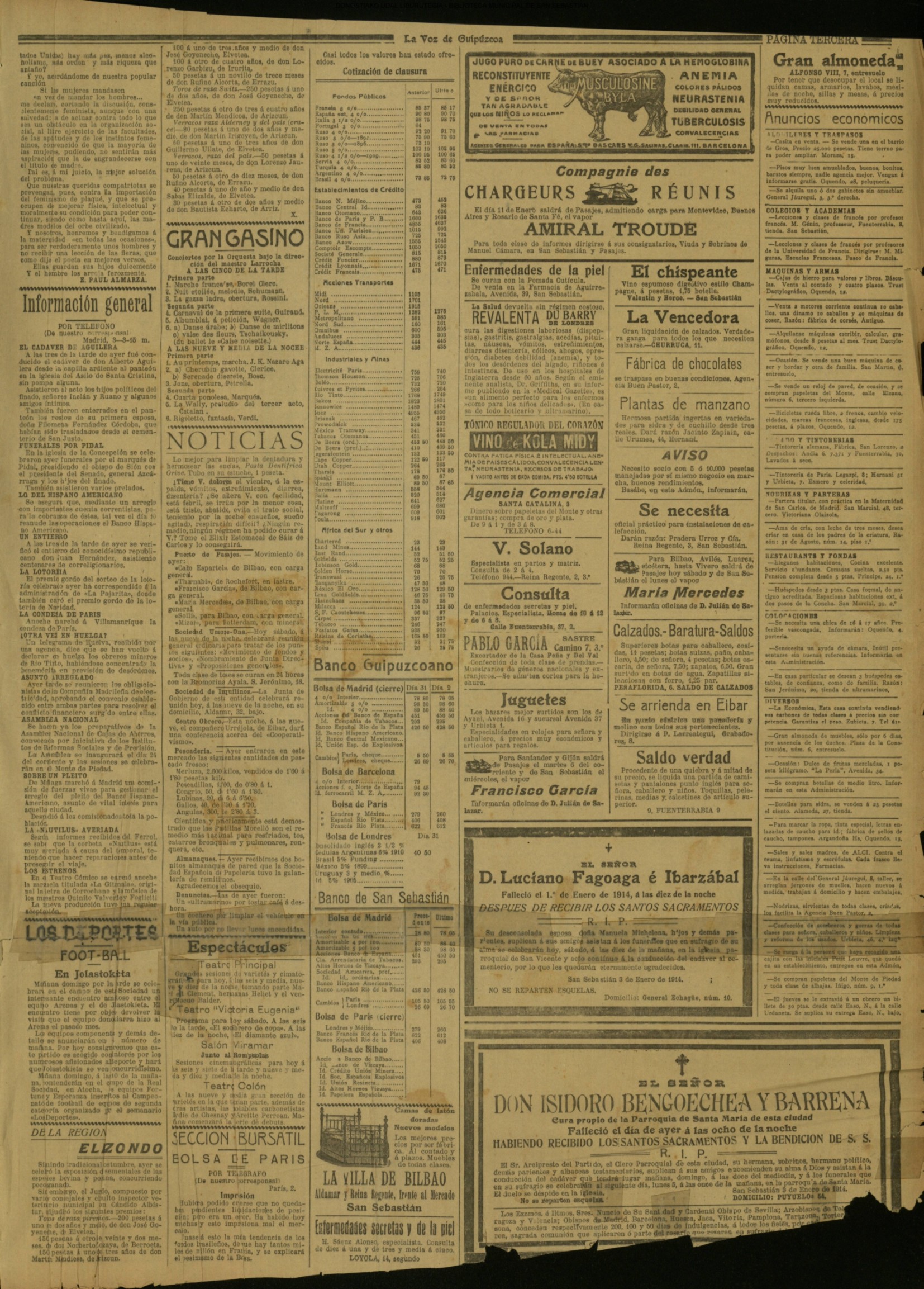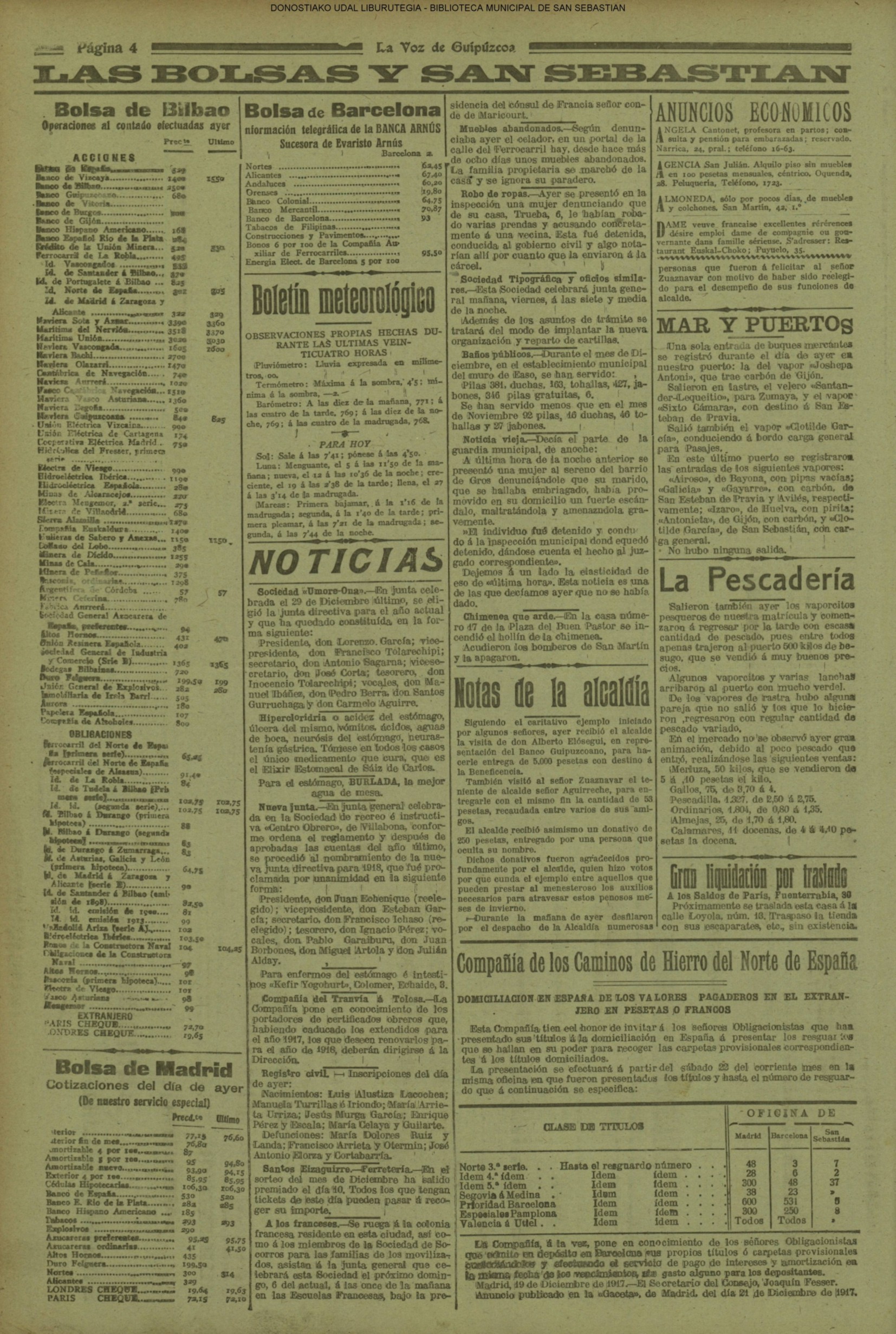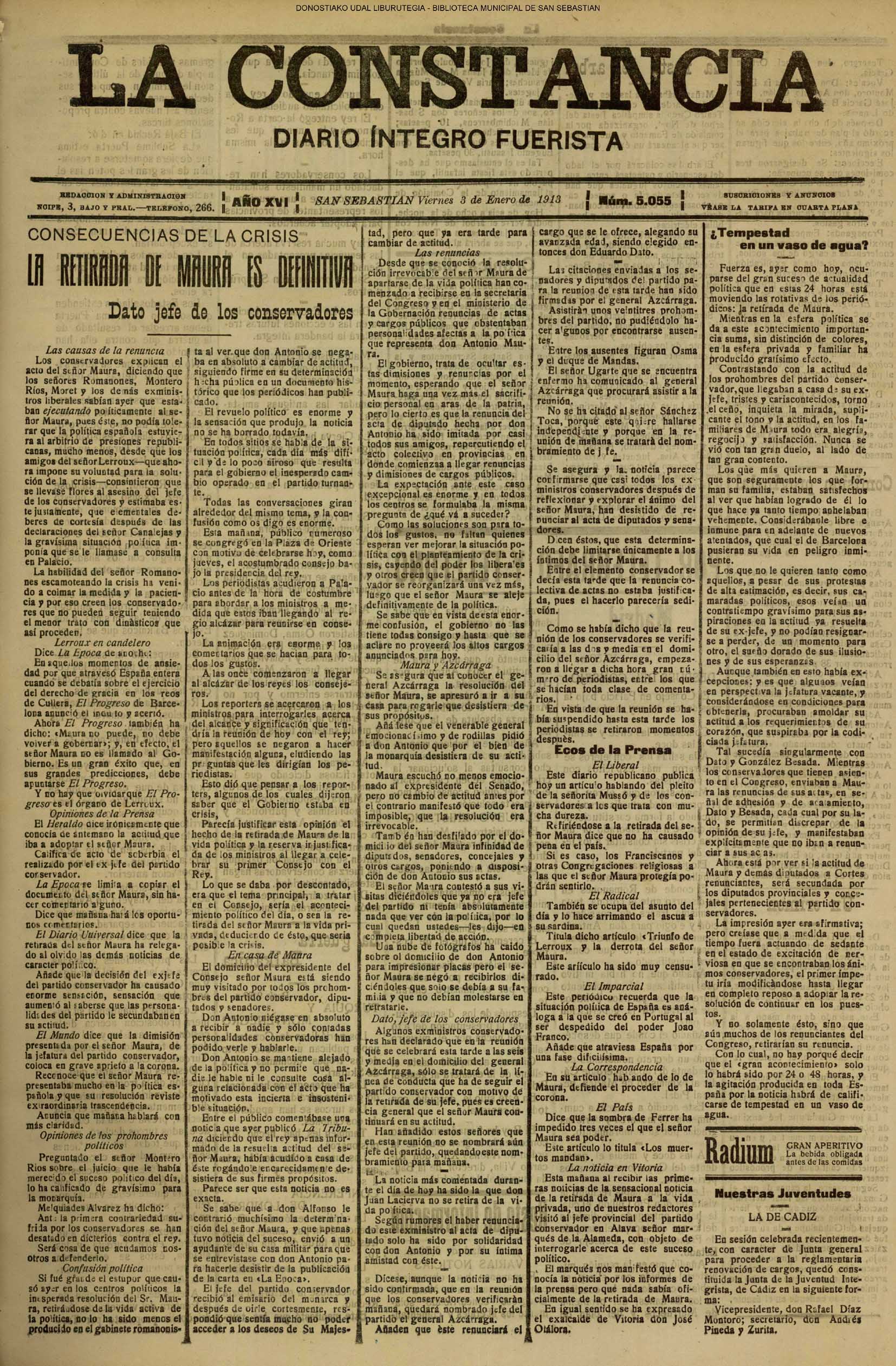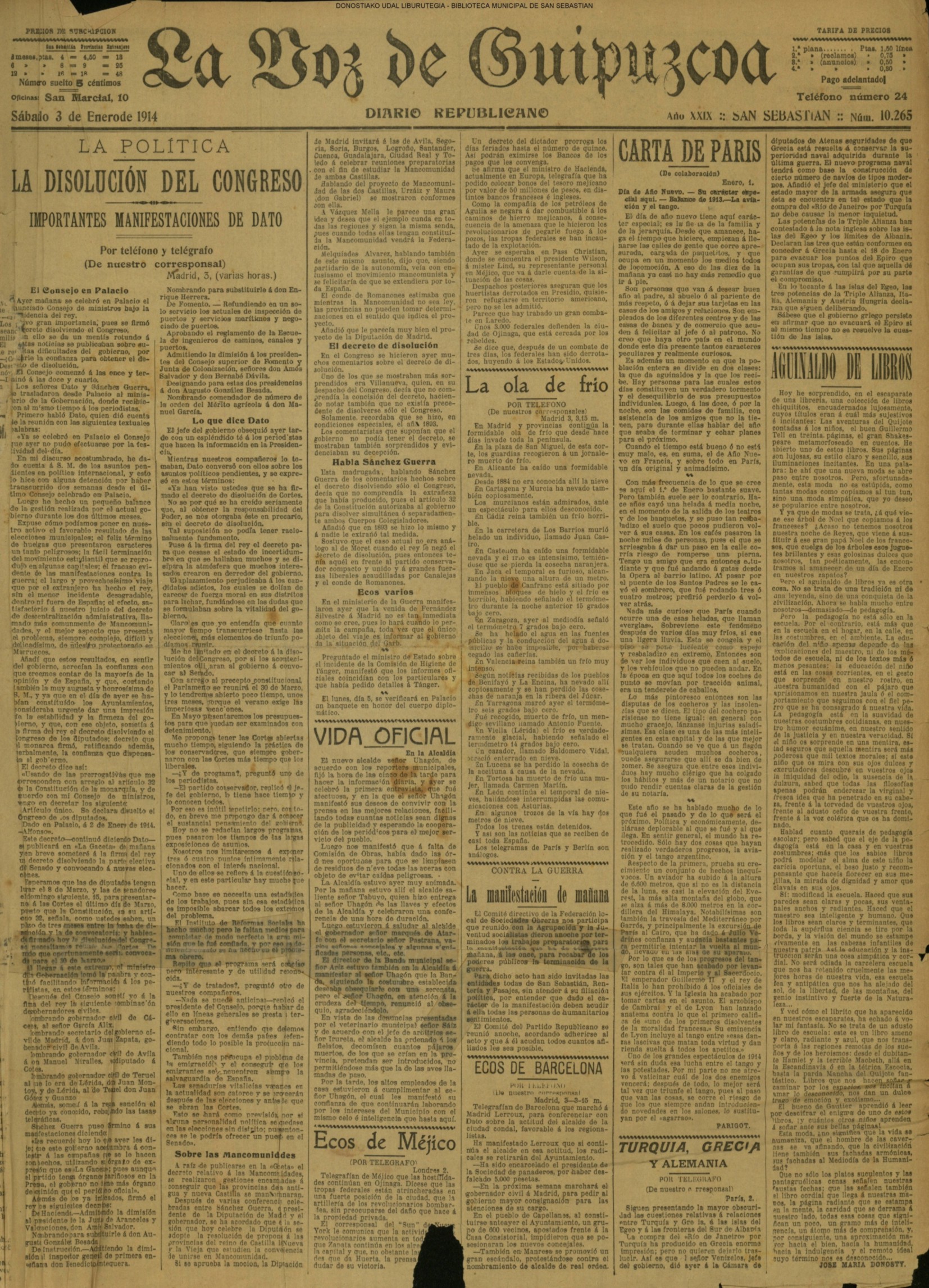 | A propuesta de la Junta del Centenario, sobre rotulación de calles, se aprueba que a la calle que se dirige desde la Estación del Norte hacia el puente de Santa Catalina se denomine "Paseo de Francia", a la plaza que se ha construido entre la calle Miracruz y el puente de Santa Catalina, "Plaza de Vasconia"; a la Plaza Elíptica que está entre el Paseo de Guernica y el de la Zurriola, "Plaza de España" y al Paseo de la Zurriola "Paseo de la República Argentina" (La Voz de Guipúzcoa/cont)(El Pueblo Vasco)(El Correo del Norte)(La Constancia) |
