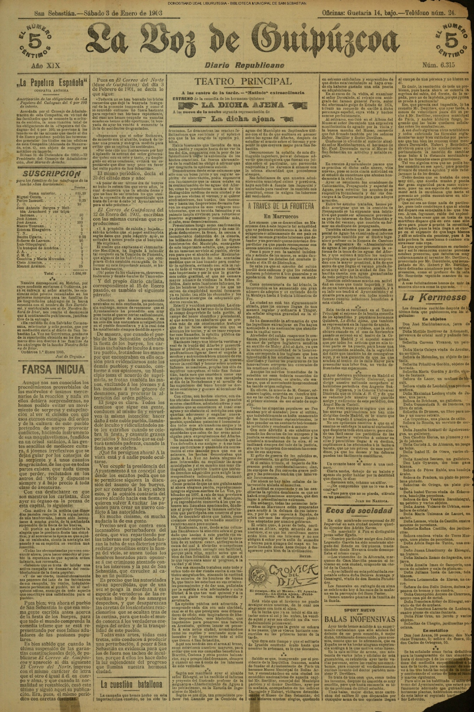 | (1903) La Cía. de Julia Sala y Luis Echaide da a conocer a los donostiarras, en el Principal, «La dicha ajena», de los Quintero. (La Voz de Guipúzcoa) |
