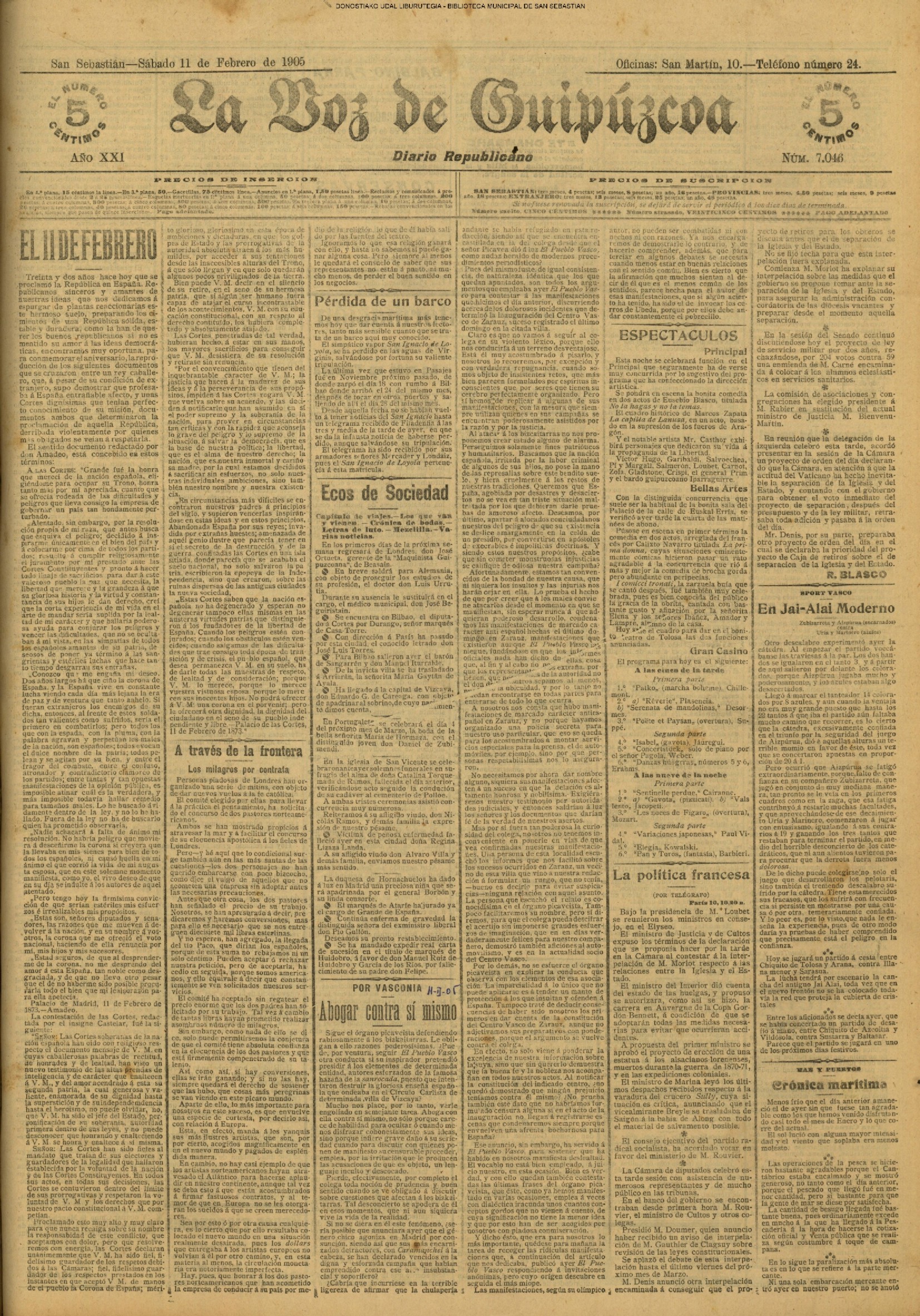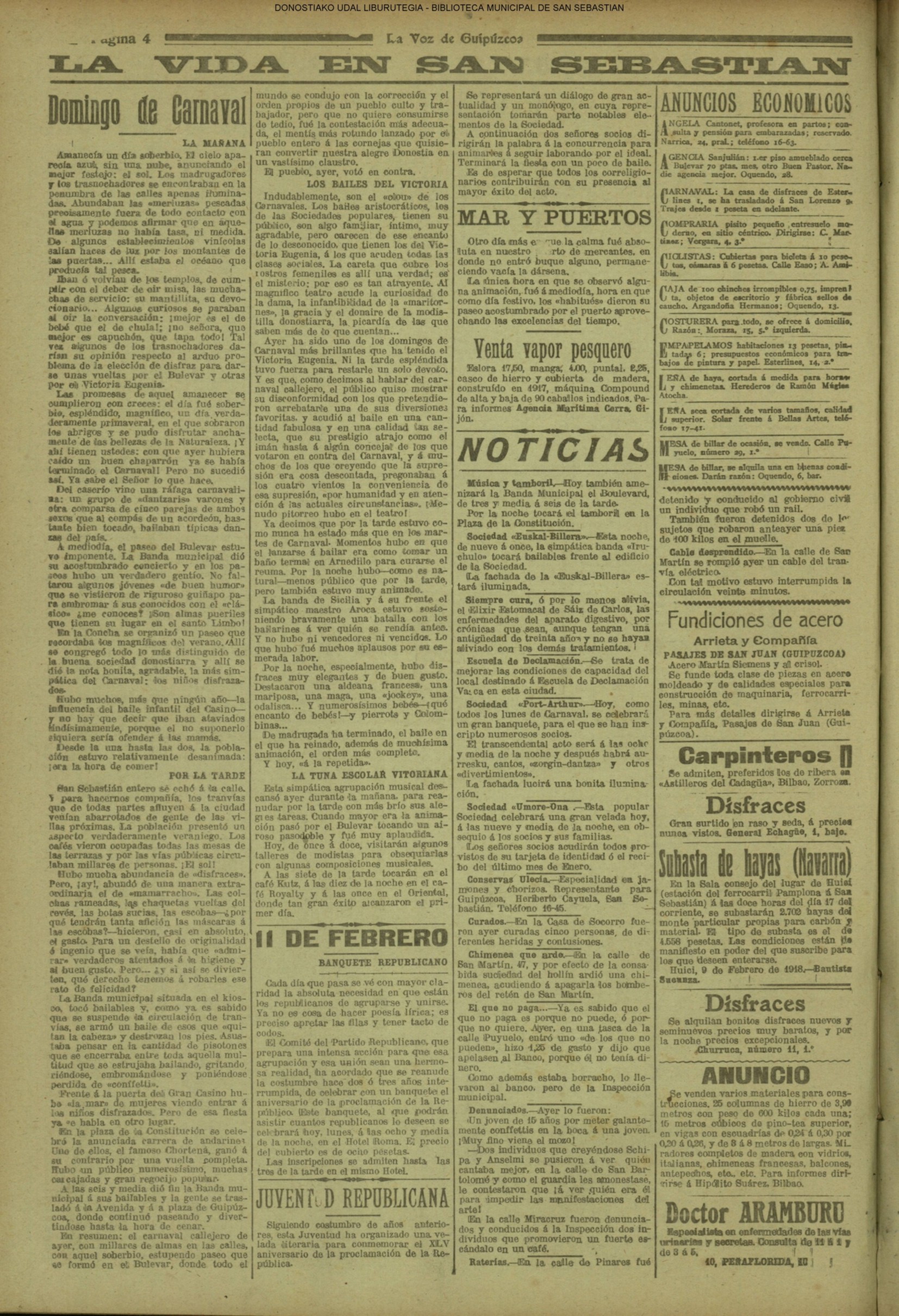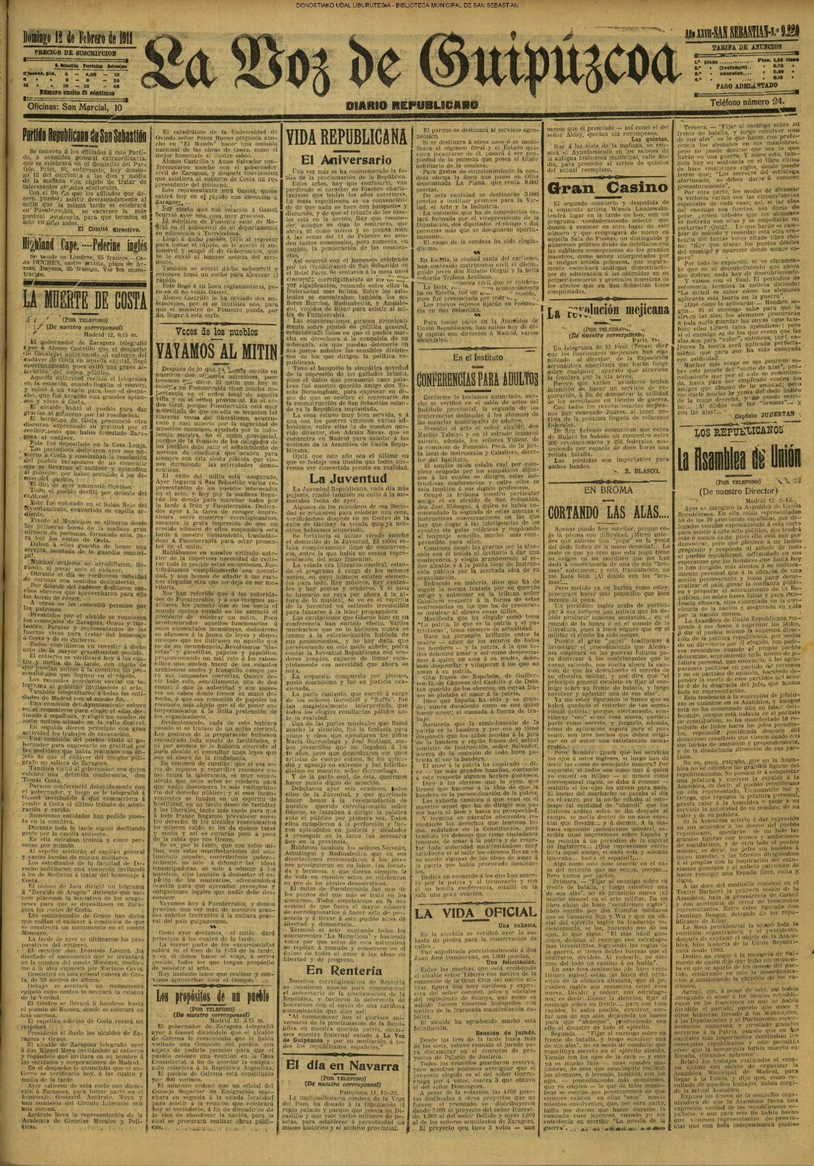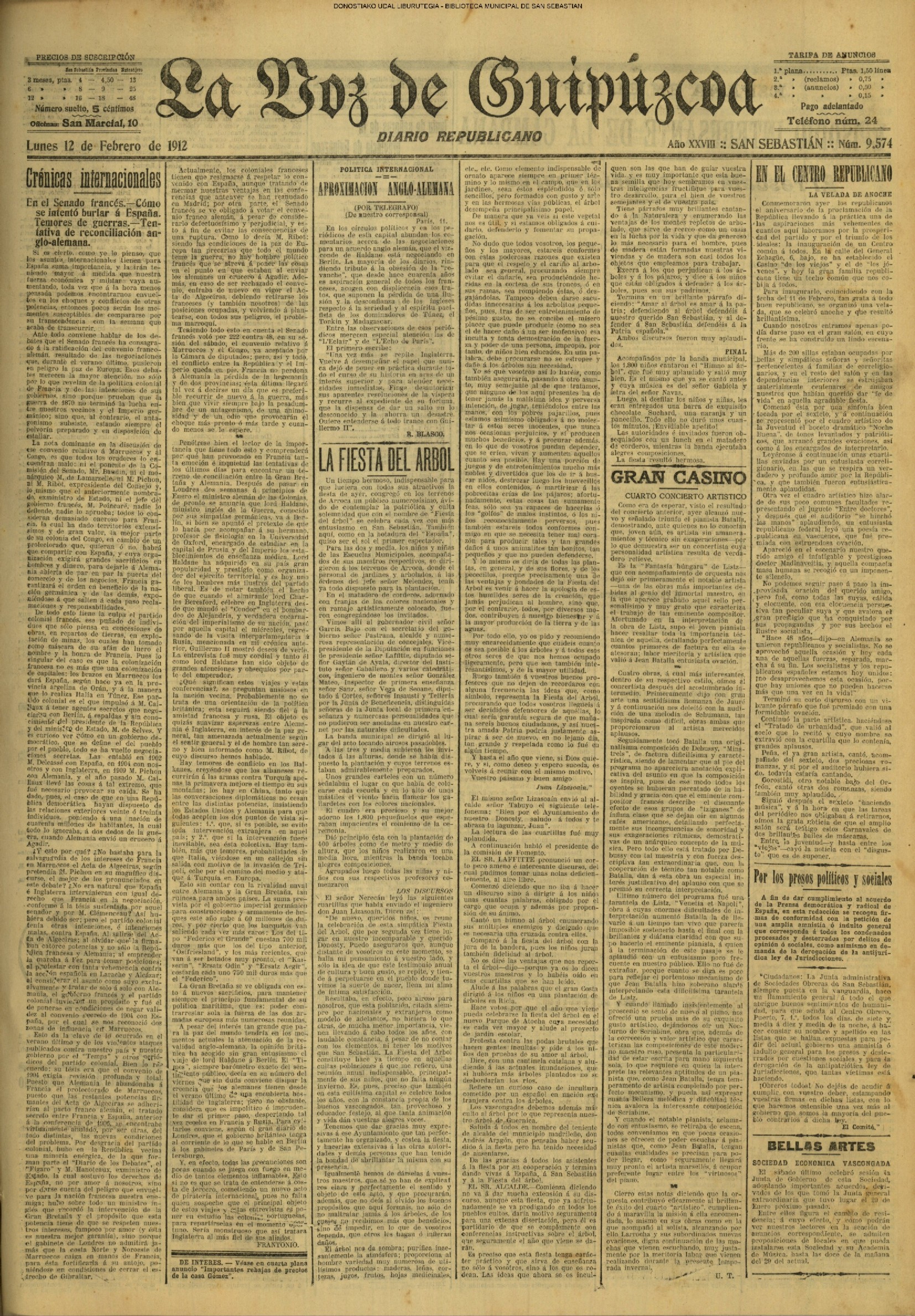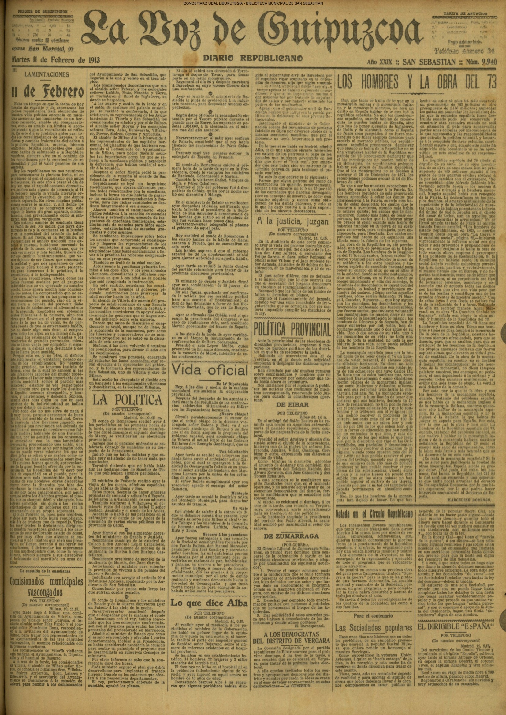 | 1904 | (JUEVES) (*).-Se inaugura la gruta de Lourdes Txiki, en la subida a Igueldo, creada por los frailes dominicos de Arcachon. (???) (*).- La Fiesta de la República. Se celebra la Proclamación de la Primera República en 1873. (LA VOZ DE GUIPÚZCOA. 12/02. p.01) (*).- MERCADO EN VILLAFRANCA (LA VOZ DE GUIPÚZCOA. 12/02. p.02) (*).- SESIÓN DE LA COMISIÓN PROVINCIAL DE LA DIPUTACIÓN (LA VOZ DE GUIPÚZCOA. 12/02. p.02) |