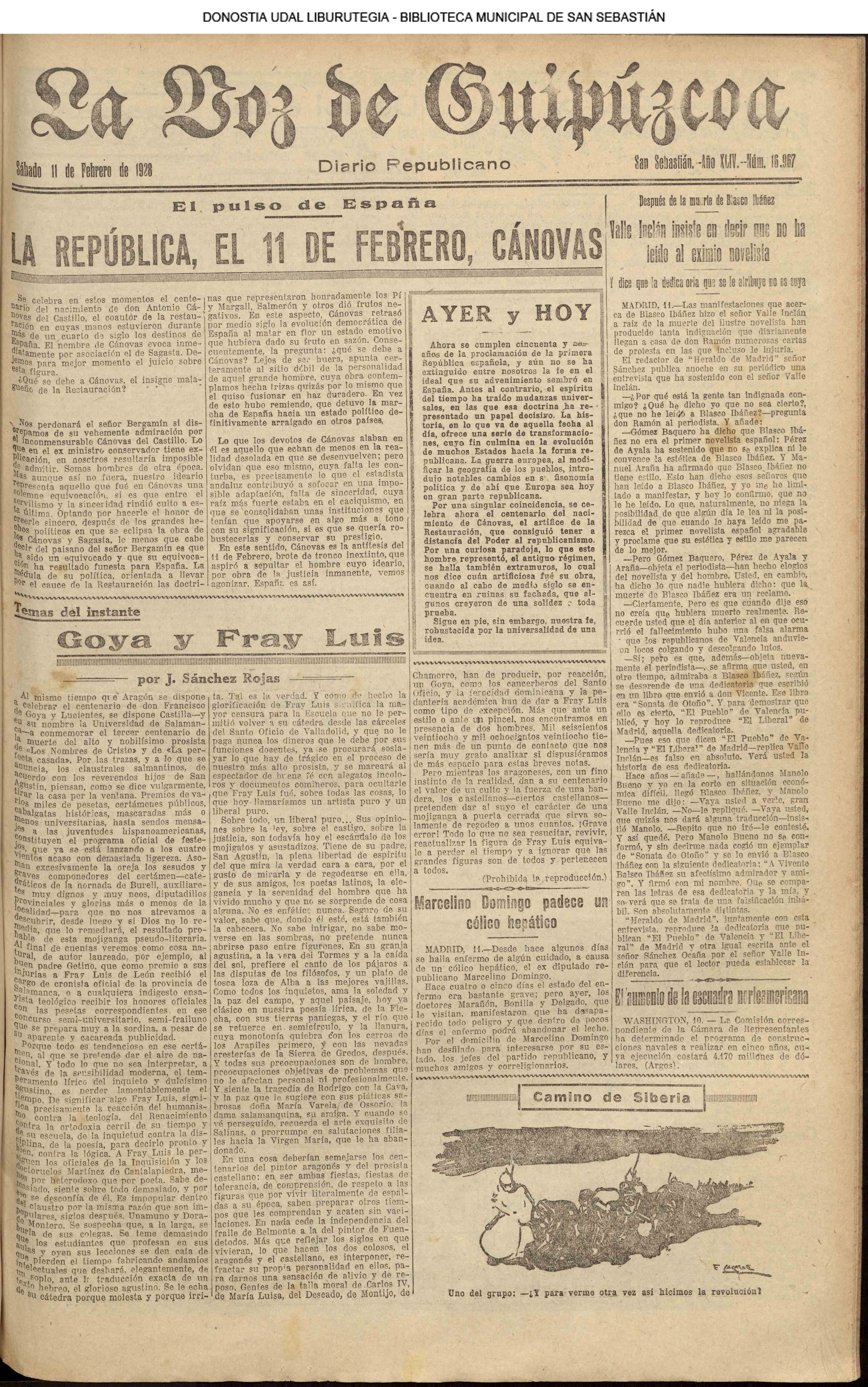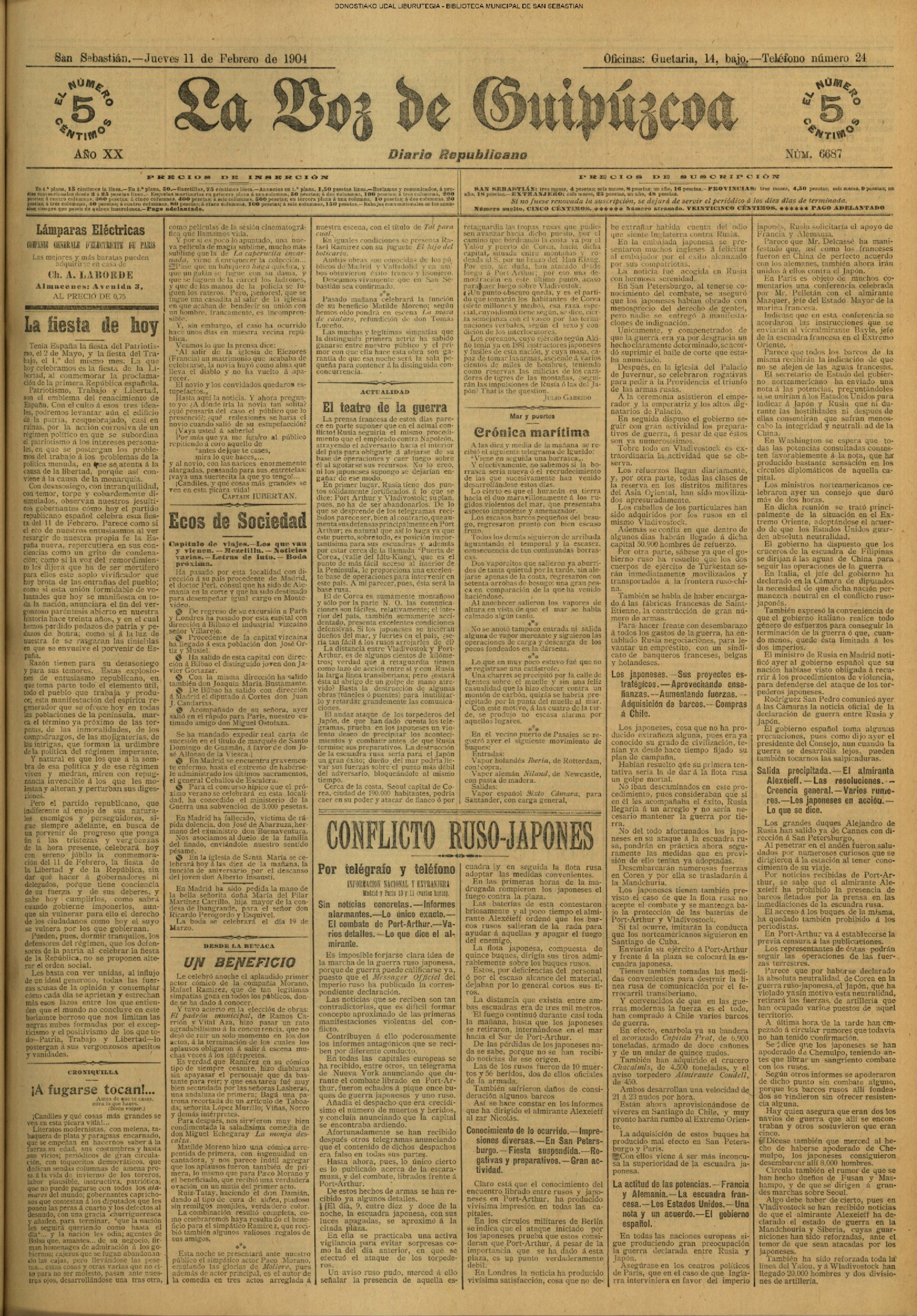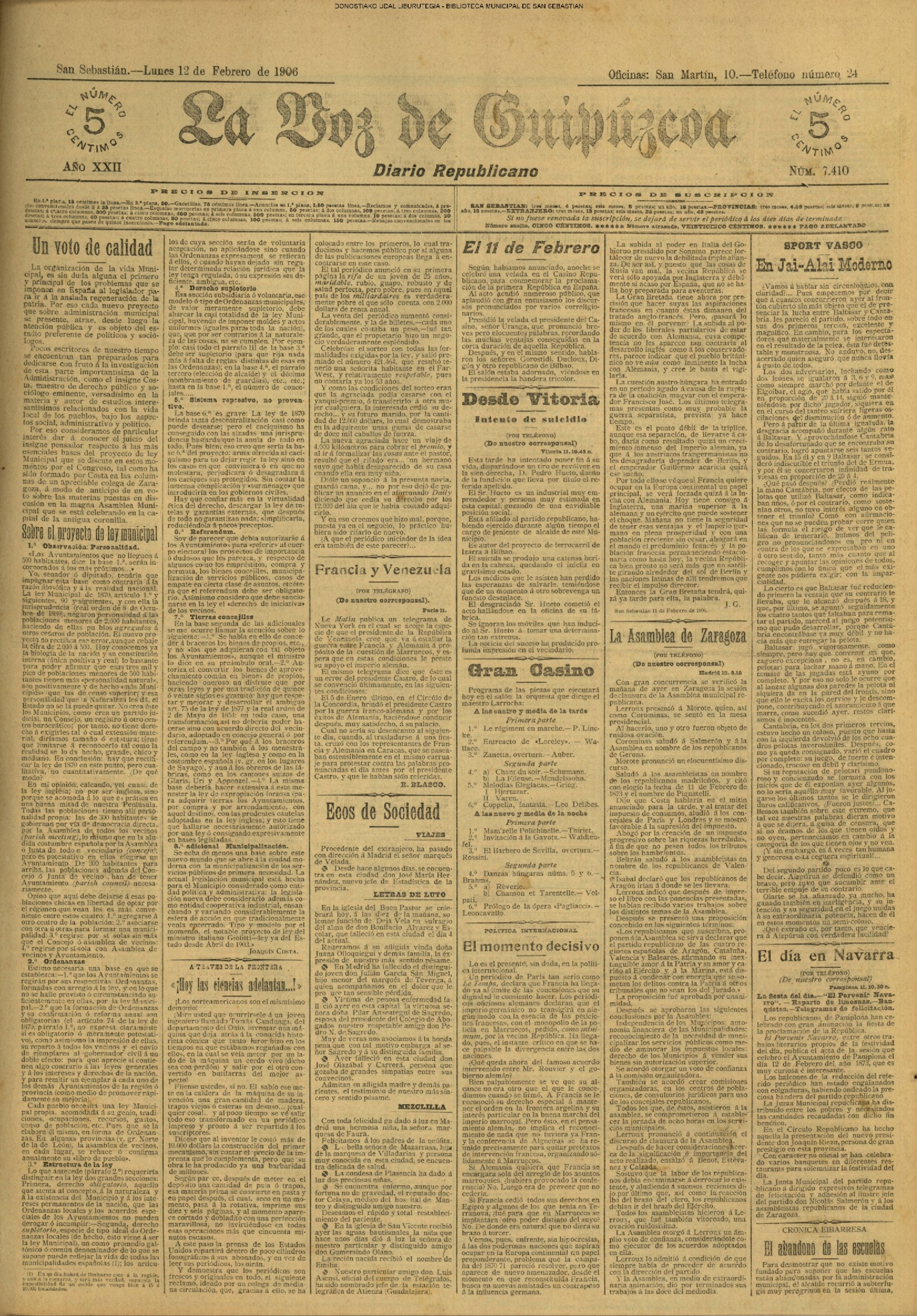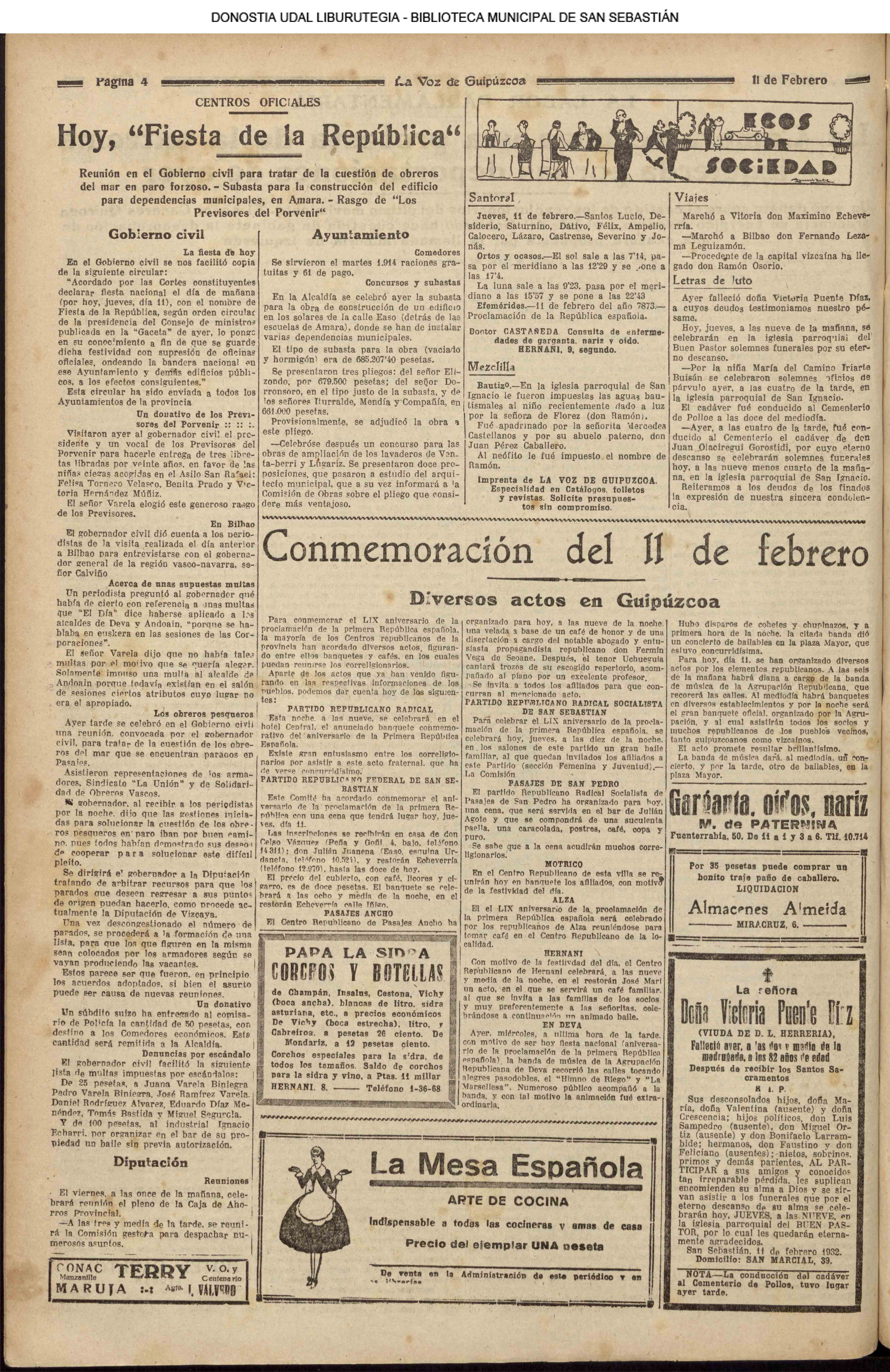 | 1904 | (JUEVES) (*).-Se inaugura la gruta de Lourdes Txiki, en la subida a Igueldo, creada por los frailes dominicos de Arcachon. (???) (*).- La Fiesta de la República. Se celebra la Proclamación de la Primera República en 1873. (LA VOZ DE GUIPÚZCOA. 12/02. p.01) (*).- MERCADO EN VILLAFRANCA (LA VOZ DE GUIPÚZCOA. 12/02. p.02) (*).- SESIÓN DE LA COMISIÓN PROVINCIAL DE LA DIPUTACIÓN (LA VOZ DE GUIPÚZCOA. 12/02. p.02) |