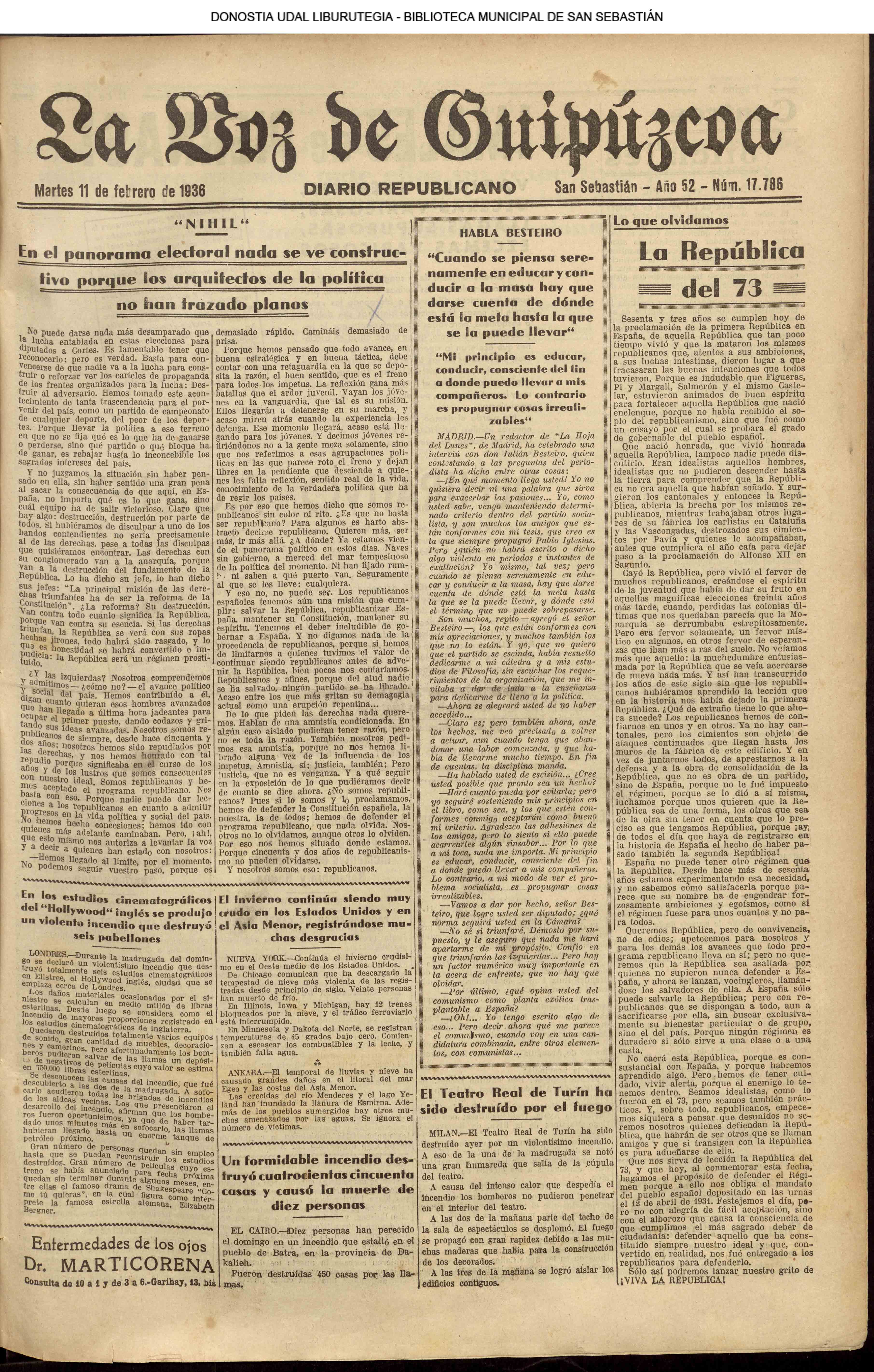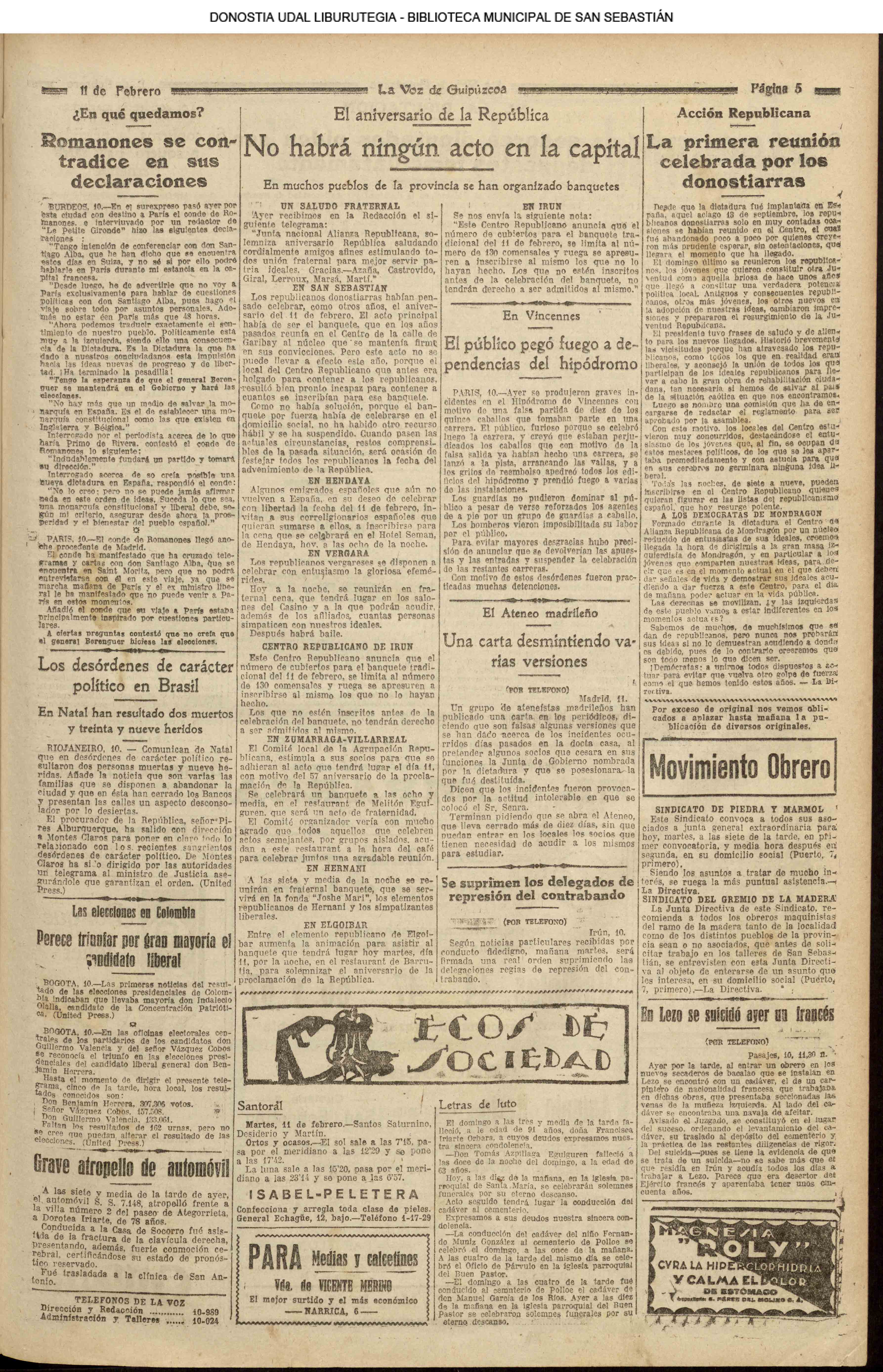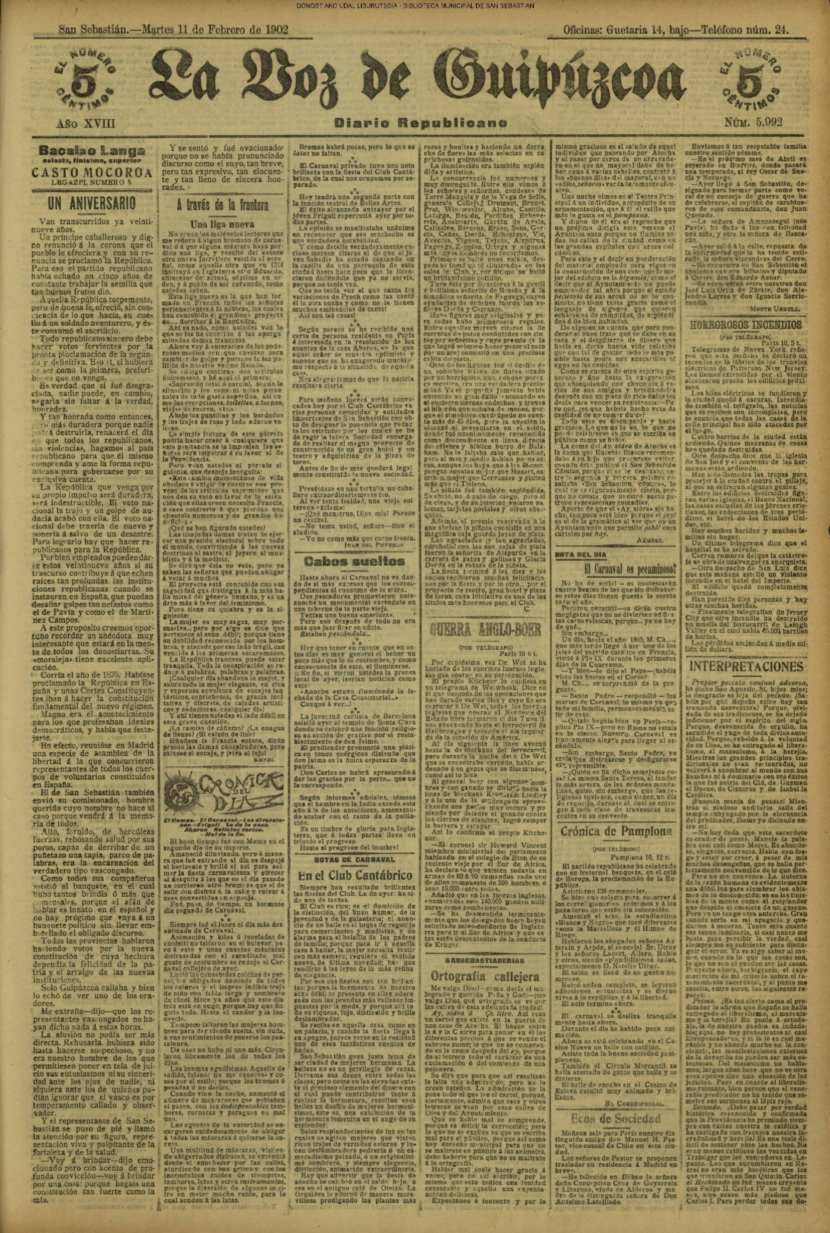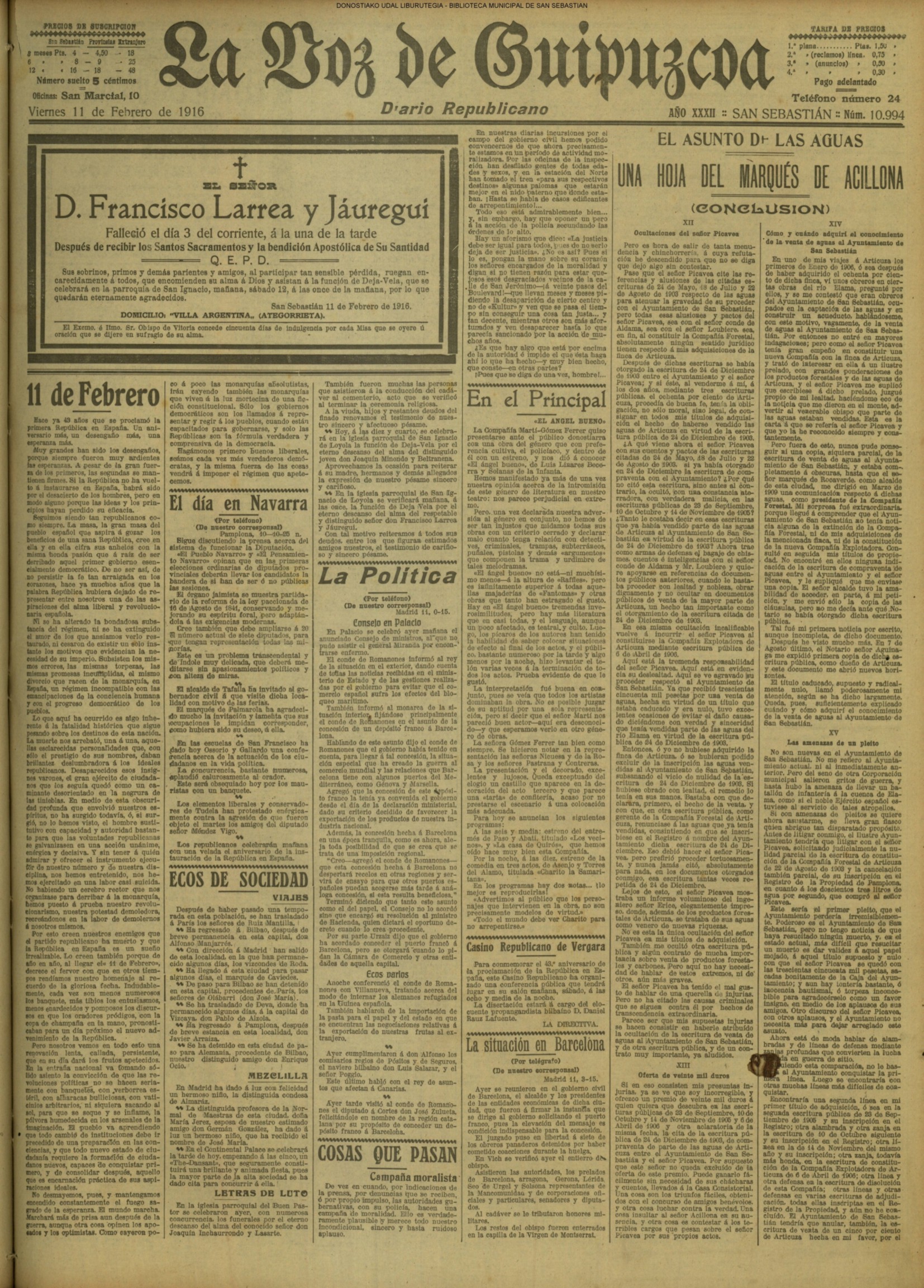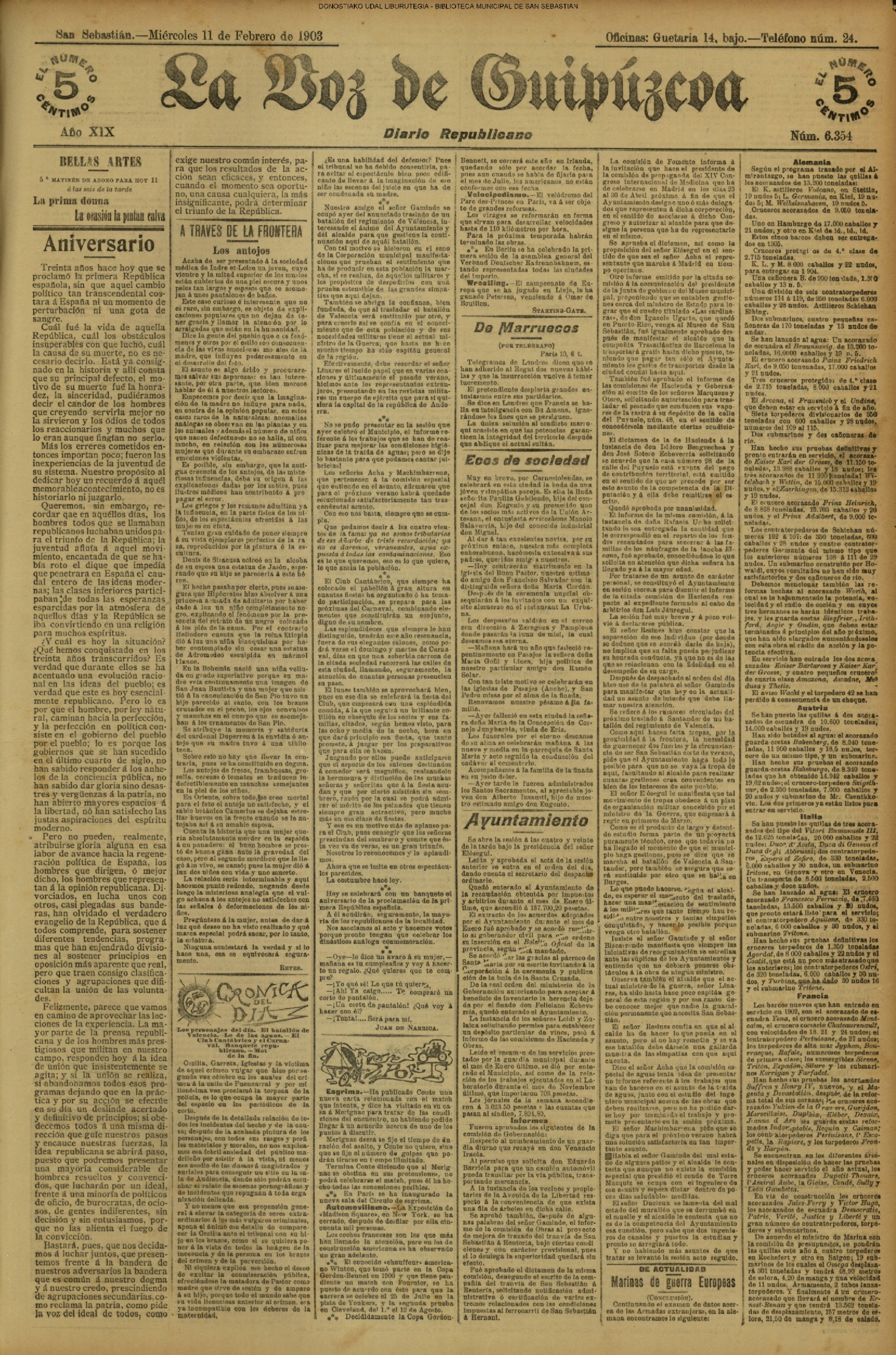 | 1904 | (JUEVES) (*).-Se inaugura la gruta de Lourdes Txiki, en la subida a Igueldo, creada por los frailes dominicos de Arcachon. (???) (*).- La Fiesta de la República. Se celebra la Proclamación de la Primera República en 1873. (LA VOZ DE GUIPÚZCOA. 12/02. p.01) (*).- MERCADO EN VILLAFRANCA (LA VOZ DE GUIPÚZCOA. 12/02. p.02) (*).- SESIÓN DE LA COMISIÓN PROVINCIAL DE LA DIPUTACIÓN (LA VOZ DE GUIPÚZCOA. 12/02. p.02) |