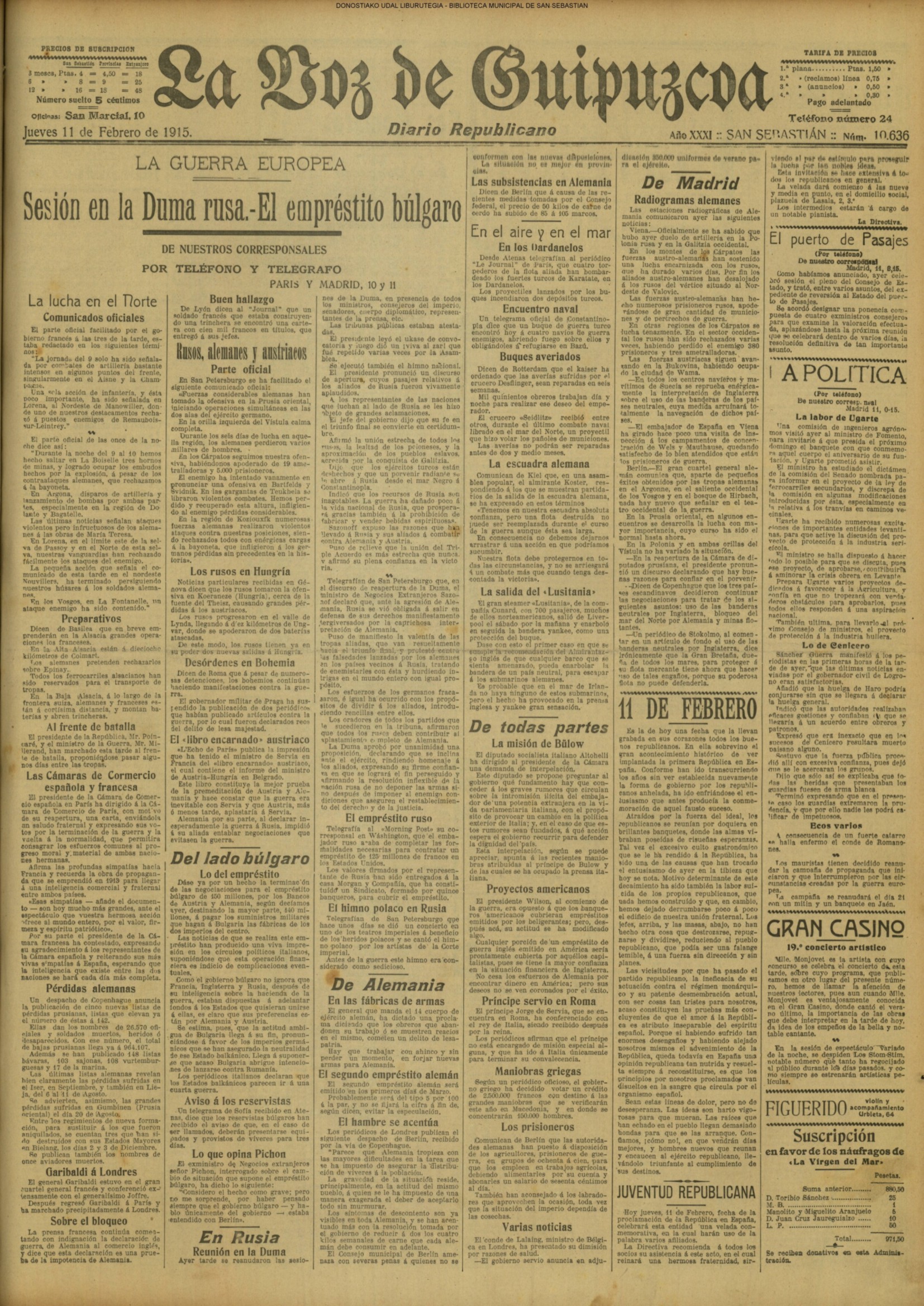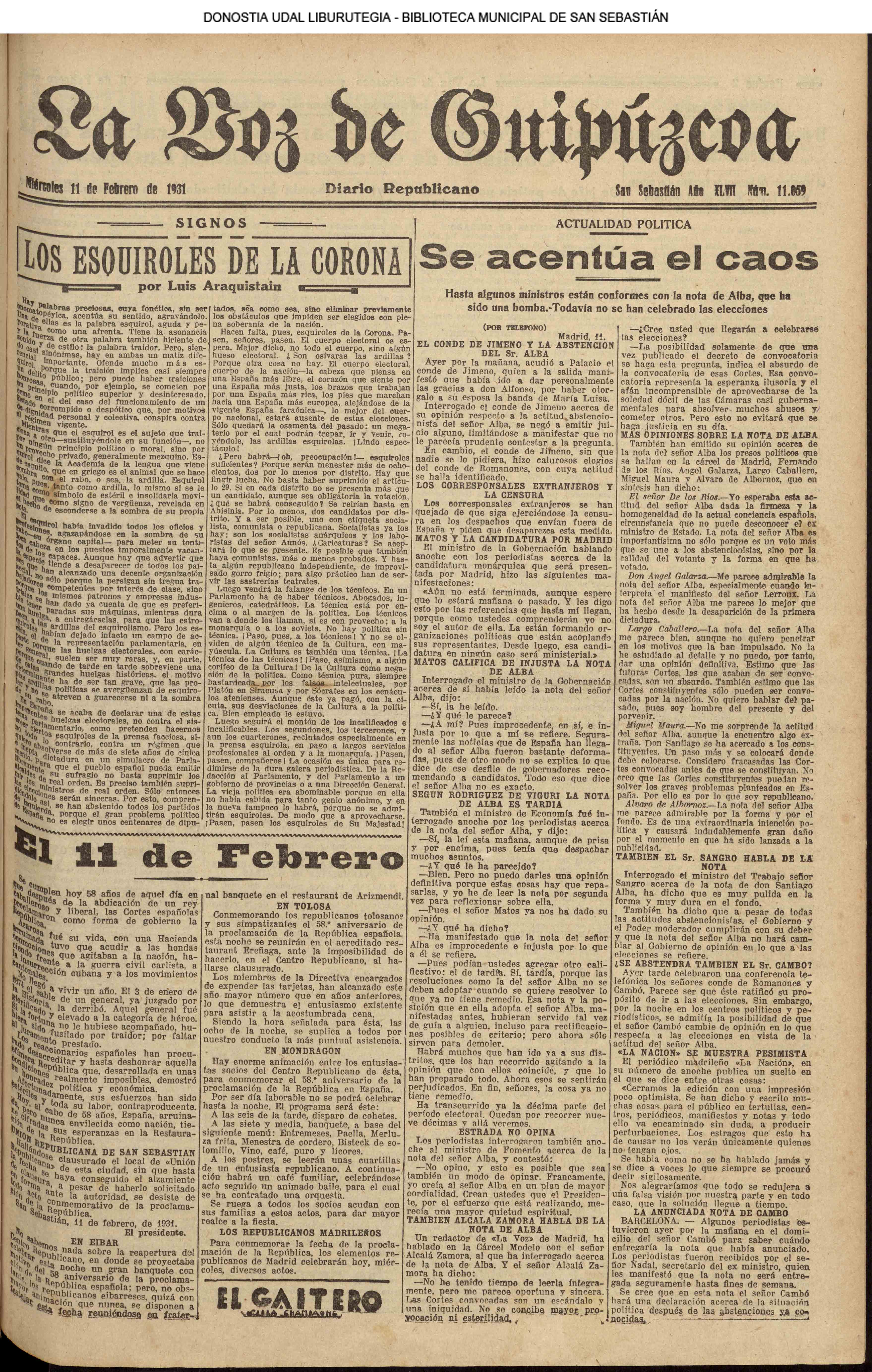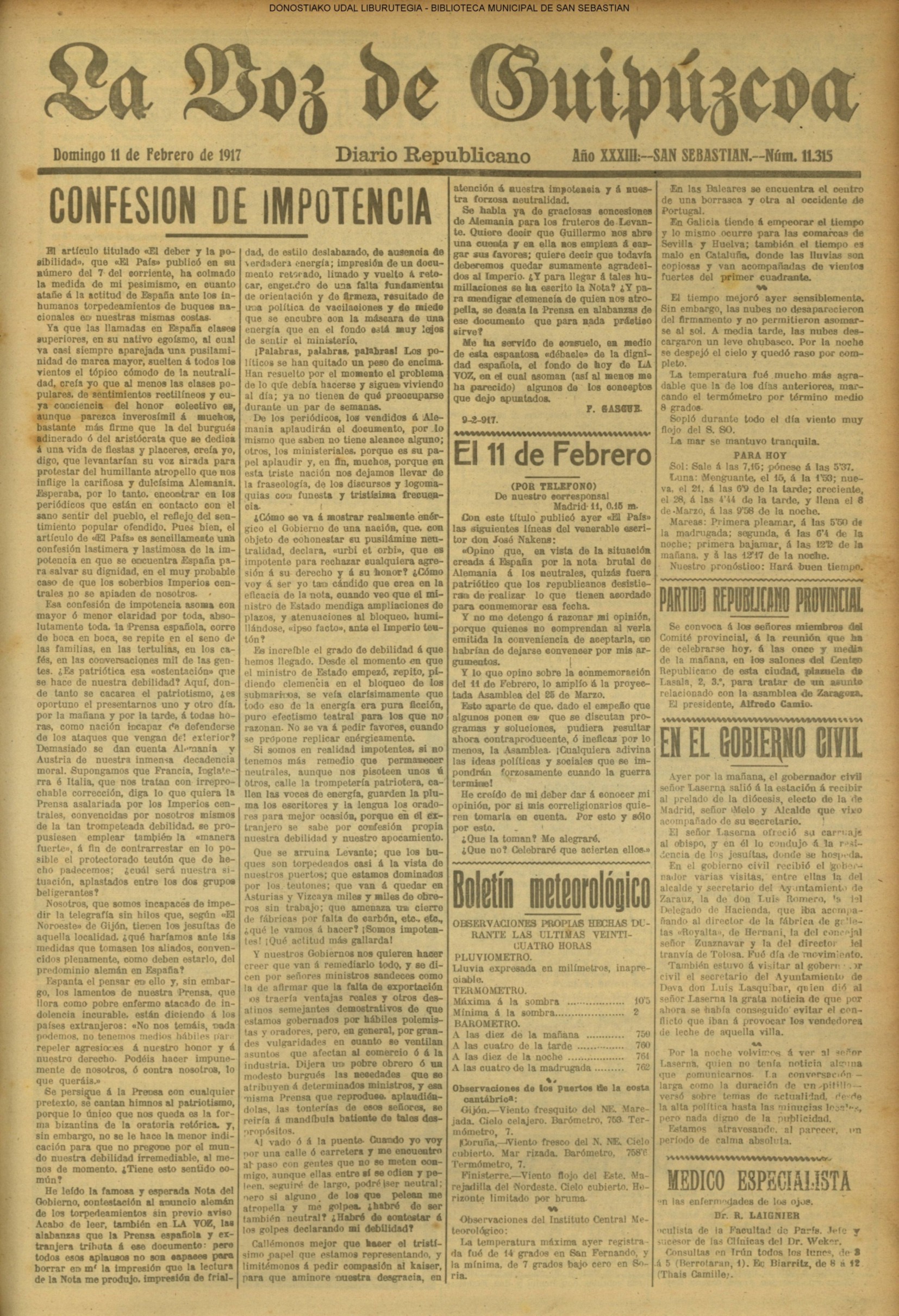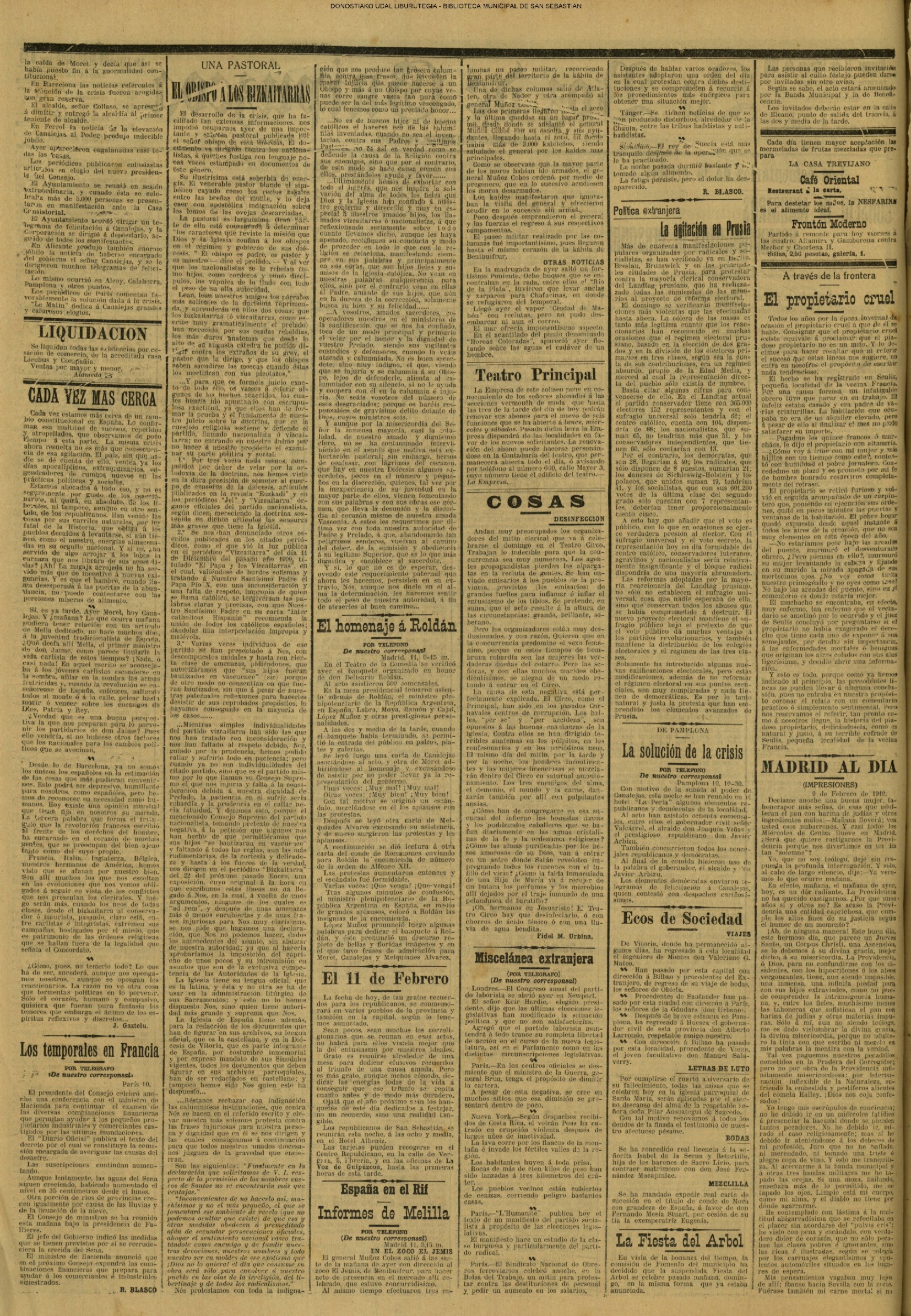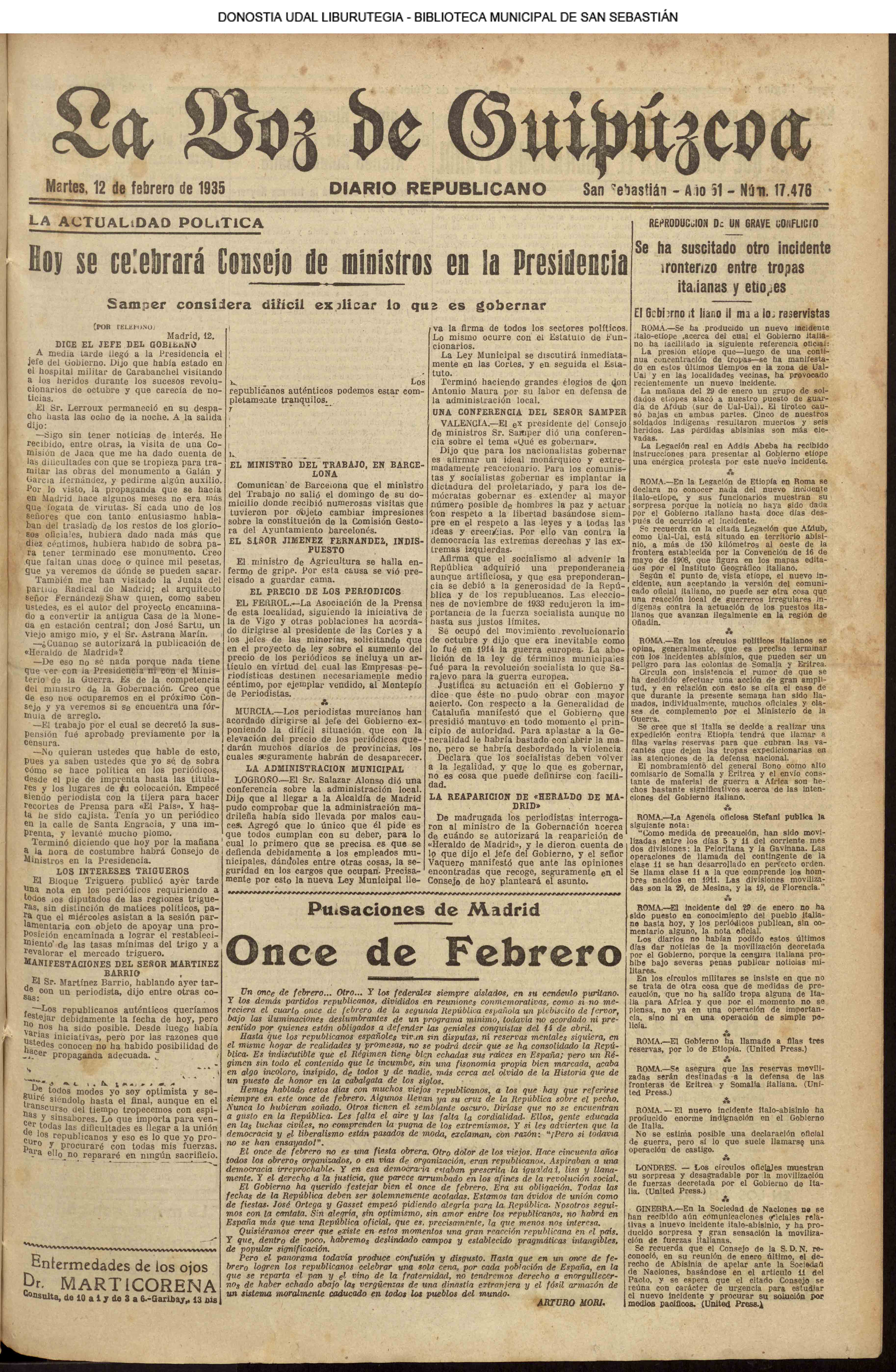 | 1904 | (JUEVES) (*).-Se inaugura la gruta de Lourdes Txiki, en la subida a Igueldo, creada por los frailes dominicos de Arcachon. (???) (*).- La Fiesta de la República. Se celebra la Proclamación de la Primera República en 1873. (LA VOZ DE GUIPÚZCOA. 12/02. p.01) (*).- MERCADO EN VILLAFRANCA (LA VOZ DE GUIPÚZCOA. 12/02. p.02) (*).- SESIÓN DE LA COMISIÓN PROVINCIAL DE LA DIPUTACIÓN (LA VOZ DE GUIPÚZCOA. 12/02. p.02) |