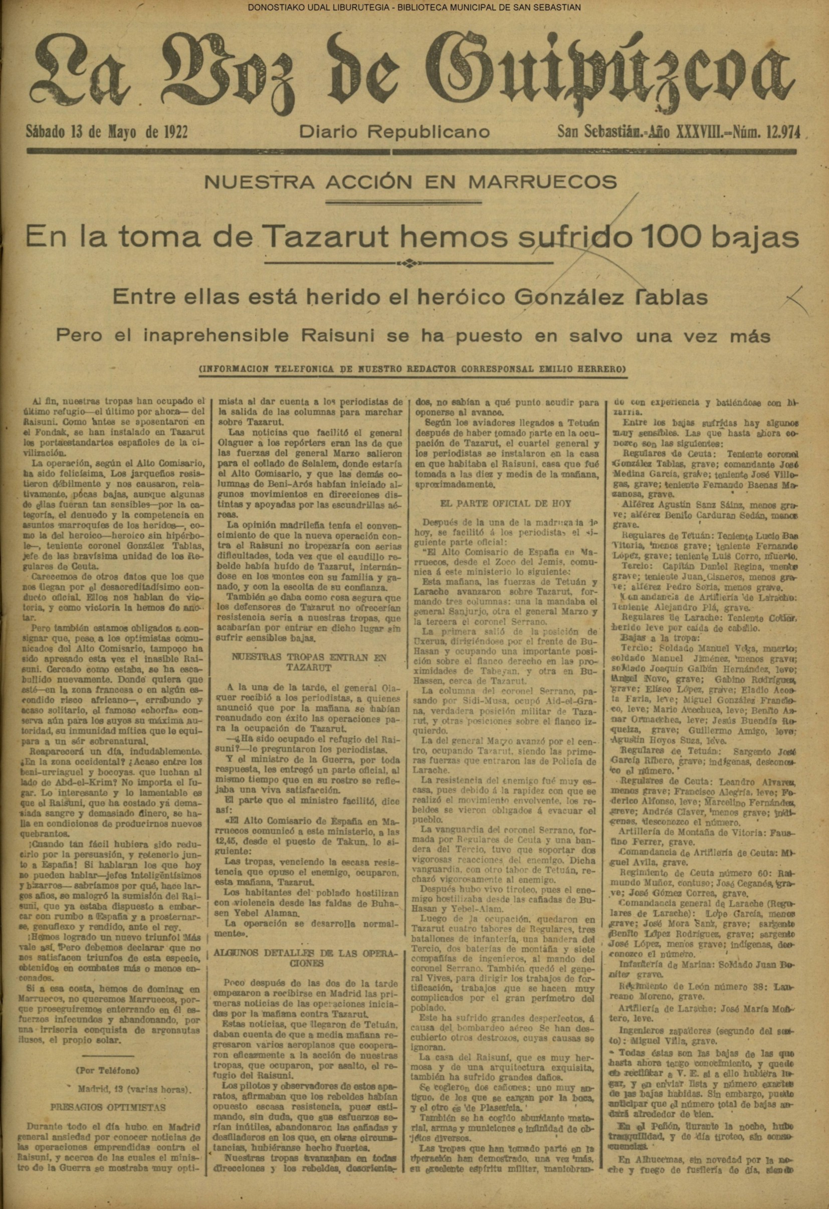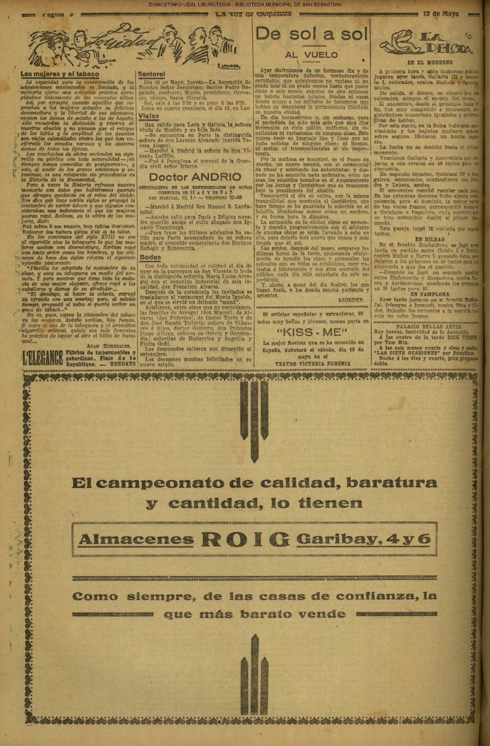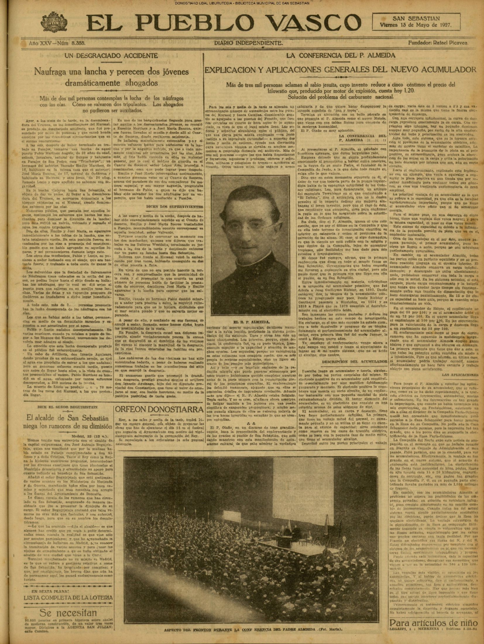 (1904) Aprovechando la circunstancia de ser jueves, la escuela de niños de D. Luis Inaraja, que funcionaba en el edificio de Artes y Oficios, es trasladada al recién construido de las Escuelas del Ensanche Oriental.(La Voz de Guipúzcoa) (1920).—Doña Antonia Cendoya es nombrada maestra del Grupo del Ensanche Oriental.(PLENO MUNICIPAL)(La Voz de Guipuzcoa) (1922) En la conquista de Tazarut, refugio del Raisuni —resuelta a las 10 de esta mañana— halla heroica muerte el teniente coronel jefe de los Regulares de Ceuta, D. Santiago González Tablas.Aunque nacido en Pamplona —tenía 43 años— el valeroso militar era conocidísimo y muy querido en San Sebastián, donde vivió mucho tiempo, hasta que marchó, voluntario, a África, afecto al Regimiento de "Sicilia".(La Voz de Guipúzcoa) (1923) Matrimonial enlace de don Luis Guinea, de distinguida familia alavesa, y Purificación Pérez Aristizábal, hija del Dr. Pérez Icazategui (Lezo). (La Voz de Guipuzcoa) (1926) Boda de D. Francisco Alvarez,conocido industrial, y María Luisa Arregui. (La Voz de Guipuzcoa) (1927) Las olas anegan, en plena Zurriola,una lancha tripulada por cuatro jóvenes, dos de los cuales, Pablo Martínez Ángulo y Lucio Urcarri —que se arrojan al agua— perecen, ahogados.(La Voz de Guipuzcoa)(El Pueblo Vasco) (1927) En el sorteo de la Lotería Nacional,«cayó» a San Sebastián un premio de 60.000 pesetas; y uno de los décimos estaba muy repartido en la sala del Hospital Civil que dirigía el doctor Eizaguirre. (1929) En reunión de esta fecha nace un Círculo Vallisoletano, que desapareció unos años después. (1929) Becerrada de la Euskal Billera (La Voz de Guipuzcoa)(LA BECERRADA DE EUSKAL BILLERA) |