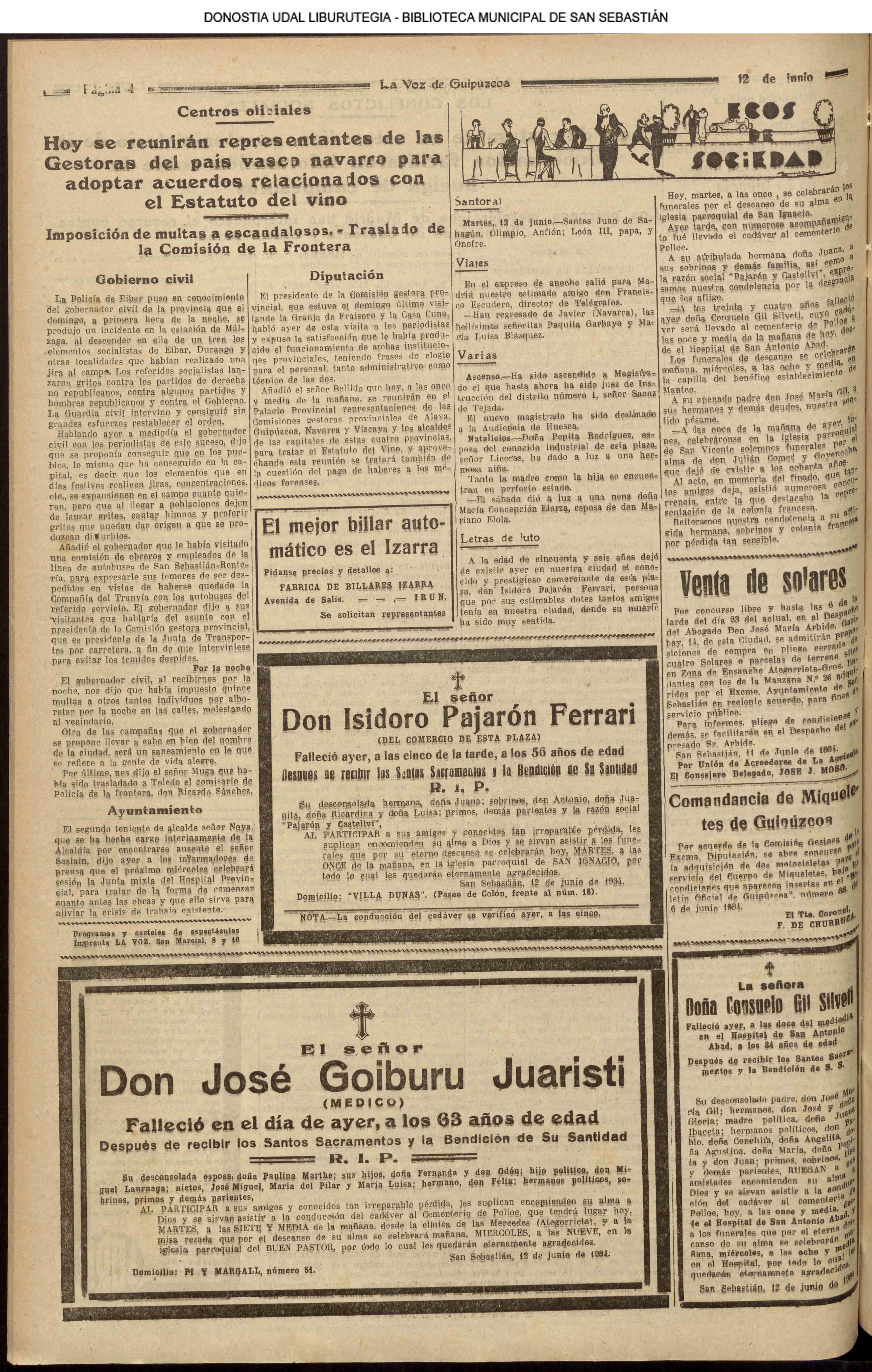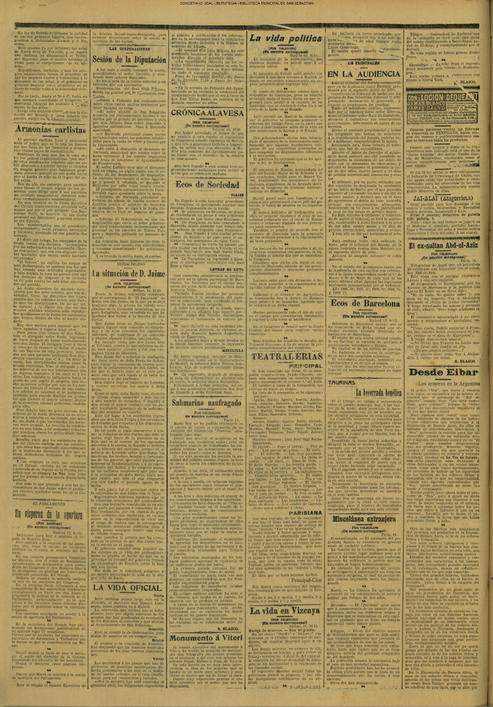 (*).- EL TIEMPO: Salvo la temperatura, cálida, dentro de la humedad propia de tantas horas de lluvia, el día fue casi invernal. No hubo claro en la copiosidad de la lluvia. Durante muchas horas no cesó de llover y al amanecer y en las horas iniciales de la tarde aumentó el caudal líquido descendente y envolvió a la Provincia en cortinas tupidísimas de agua. (EL PAIS VASCO. Descargar ) (*).- EN EPELEKO ETXEBERRI, la Fiesta de los dueños de bares. Ciento cincuenta socios e invitados pasaron unas horas deliciosas.- Homenaje al doctor Asuero .- Varios discursos. (EL PAIS VASCO. Descargar ) (*).- EN EL VICTORIA EUGENIA. Gran función organizada por una Sociedad benefactora. (EL PAIS VASCO. Descargar ) (*).- LA VIDA OFICIAL DONOSTIARRA # Volvemos a lo pasado, en cuanto concierne al Teatro Principal .-Para la constitución de los Comités Paritarios .- Oposiciones en la Diputación .- La Junta de Protección a la Infancia (EL PAIS VASCO. Descargar )
