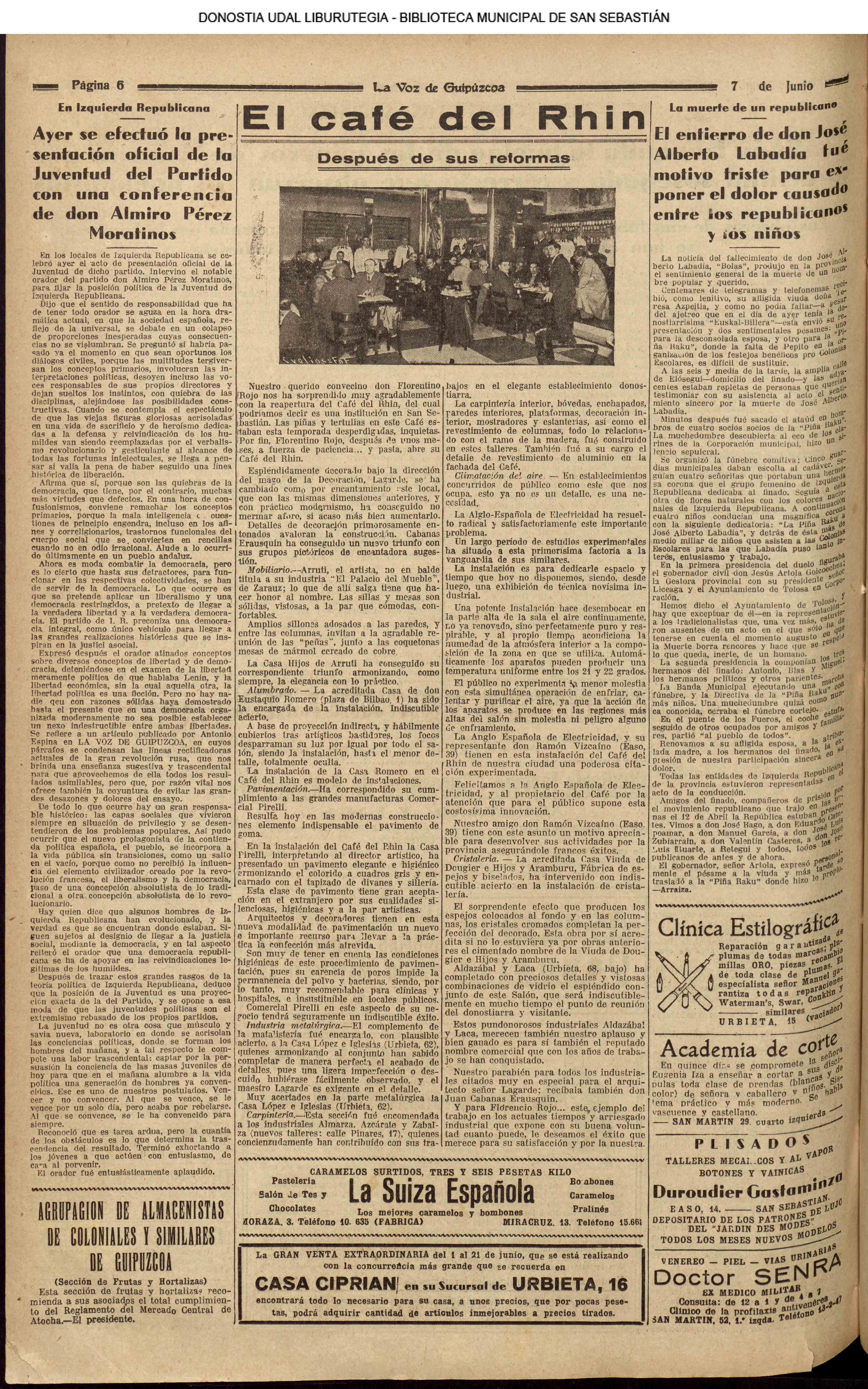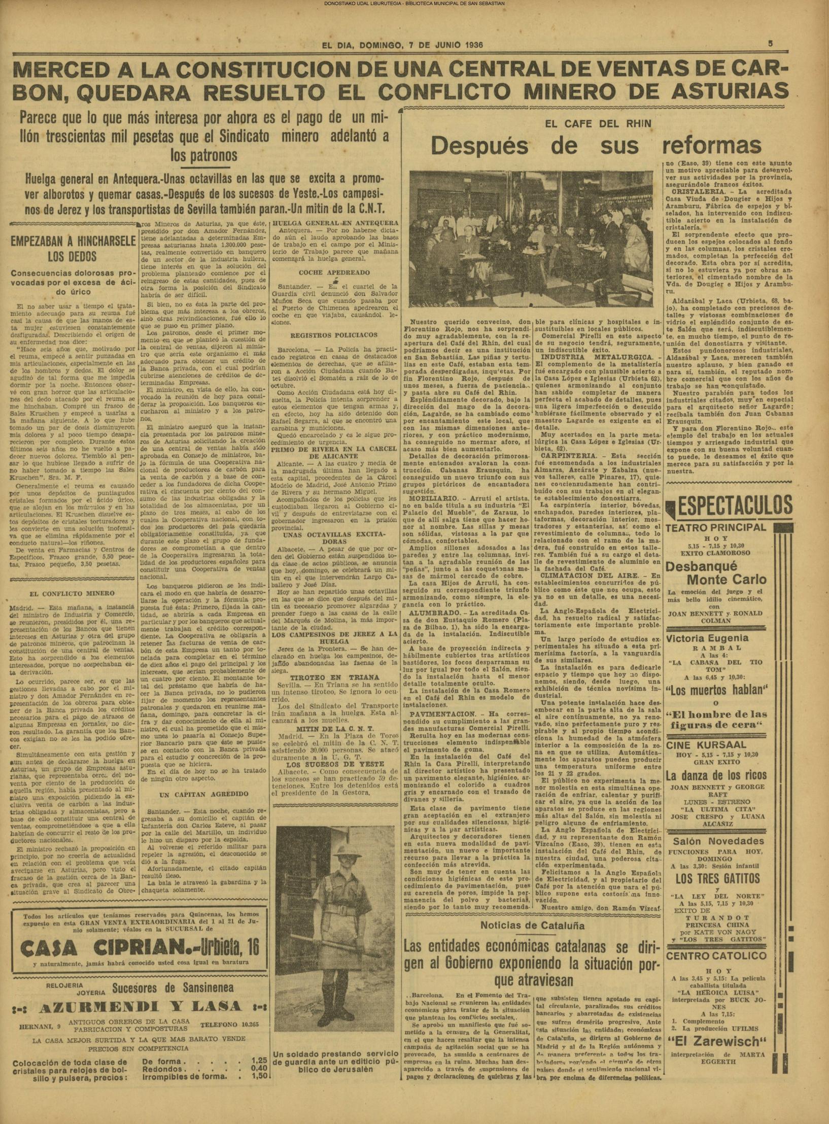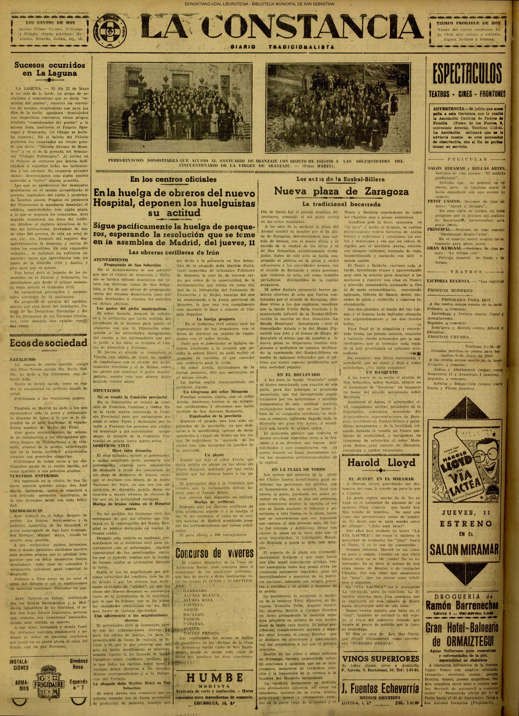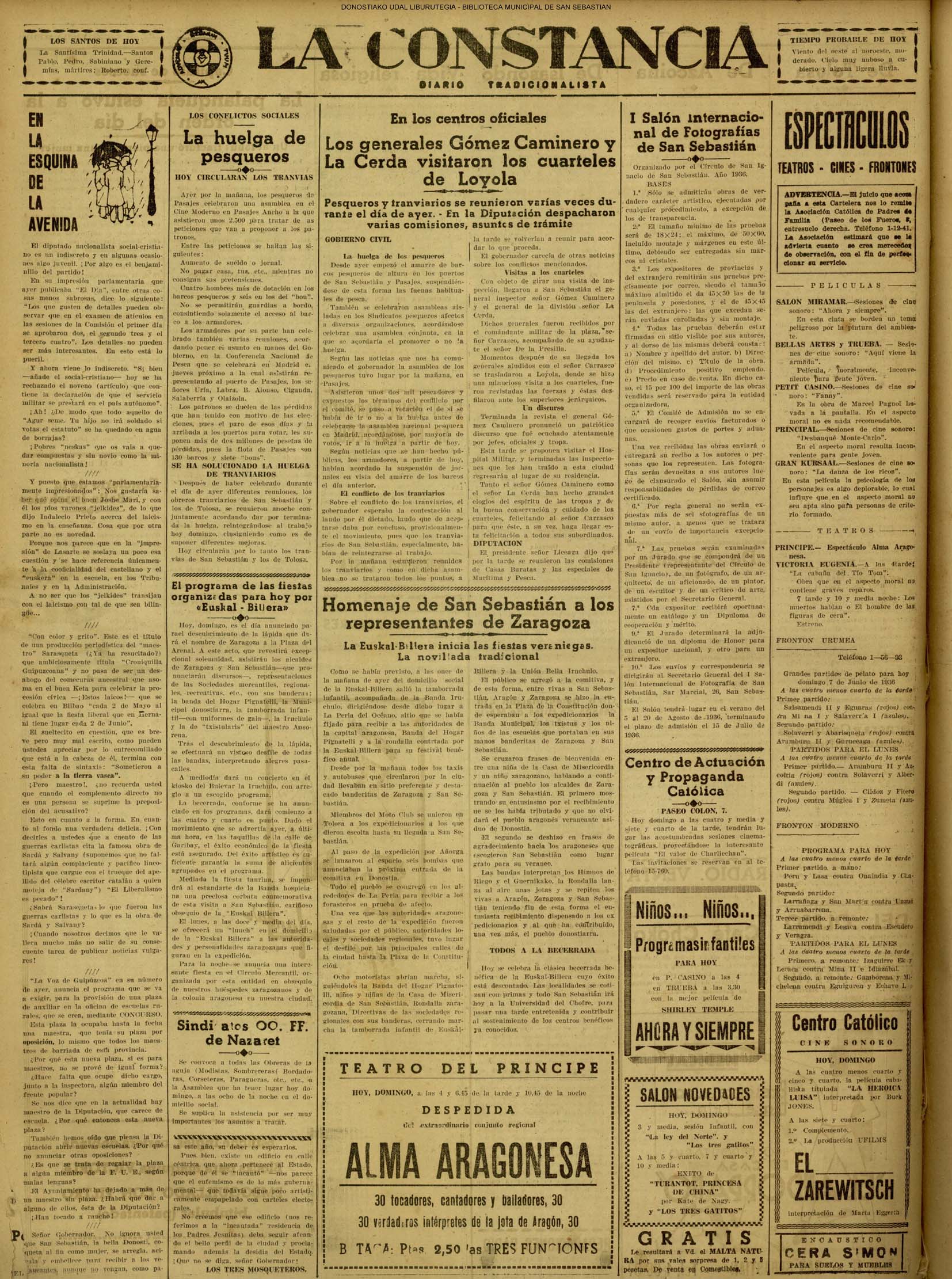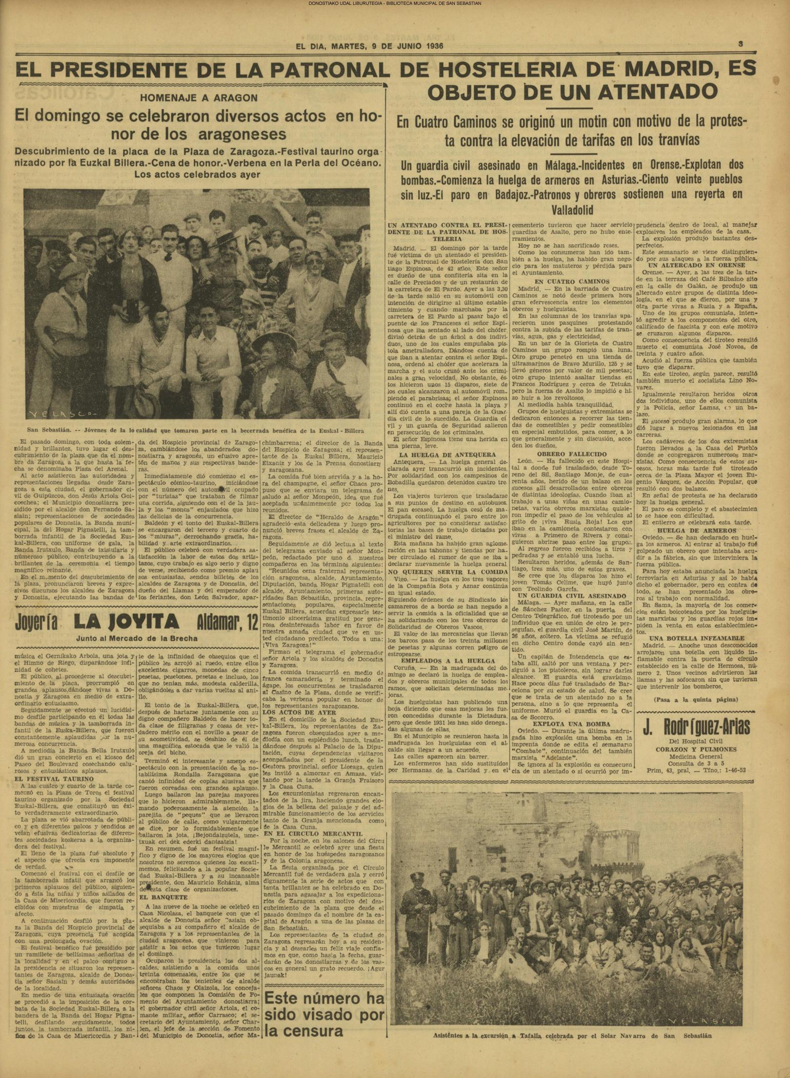 (*).- A partir de hoy,EL DIARIO VASCO se venderá al precio de 35 pesetas. La subida que afecta a todos los diarios de información general de la región, se debe al alza experimentada en los precios de las materias primas y al encarecimiento de los costes de producción y distribución. (*).- DANTZARI EGUNA, en el Velódromo (*).- Minutos después de las dos de la madrugada de hoy se escucharon en el barrio de GROS, dos fuertes explosiones, que alarmaron al vecindario y produjeron un herido y la rotura de cristales de establecimientos comerciales y viviendas en las zonas de Paseo de Colón y Padre Larroca...... |
