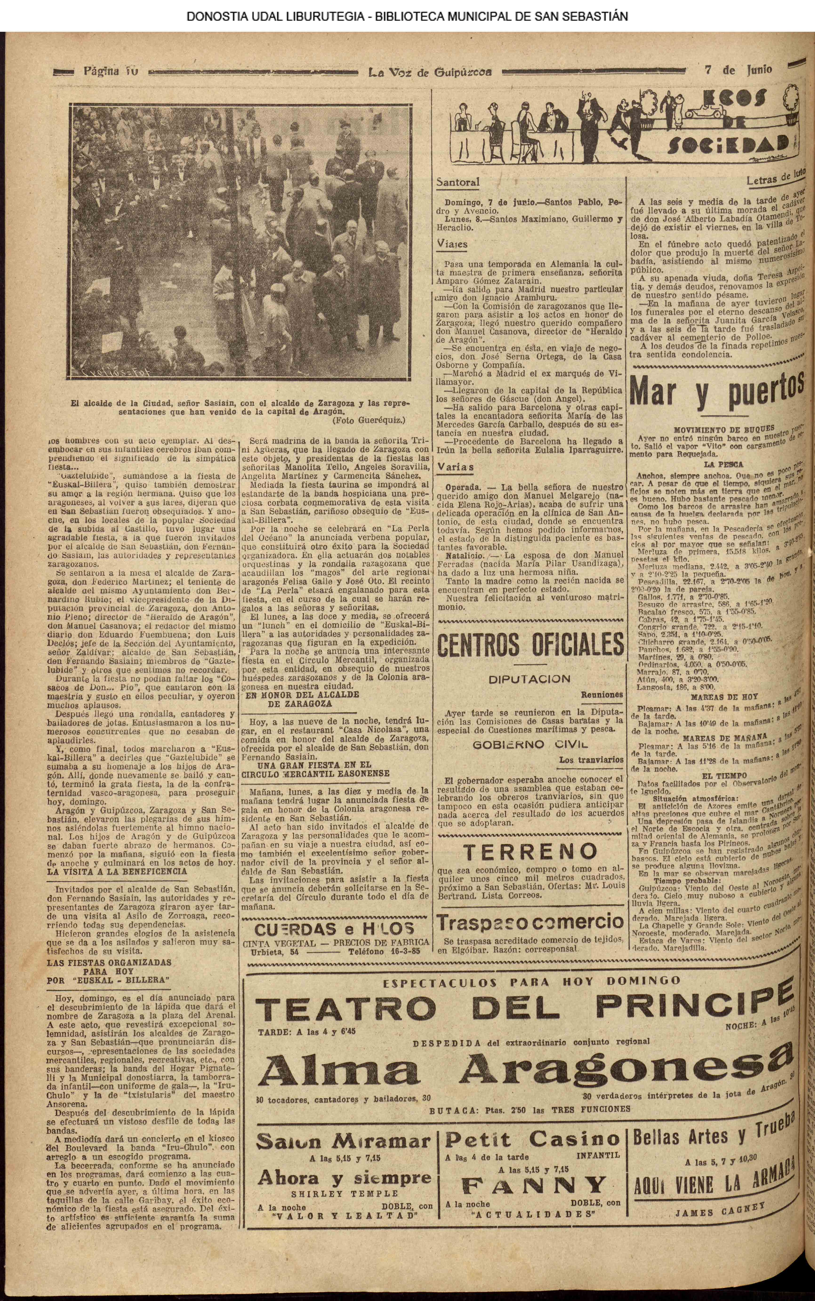 (*) .- Se estrena, a las 5,30 de la tarde, en el Teatro Victoria Eugenia "GIPUZKOA" : Una mirada poética al pasado, película realizada por Pío Caro Baroja, con textos de Julio Caro Baroja, que ha sido realizado por encargo de la Caja de Ahorros Municipal, para celebrar su Centenario.... (*).- Los compromisarios de la Real Sociedad dan en "SI" a Zubieta EL DIARIO VASCO .- (07/06).- PORTADA (Inspector de policía agredido anoche en la parte vieja....).- p.05 . ( Inspector de policía herido anoche en la parte vieja al ser reconocido...).- p.11 . ( La película realizada por Pío Caro Baroja se estrenó ayer. "GIPUZKOA": Una mirada poética al pasado......).- p.29. ( Aunque solo participó la tercera parte. Los compromisarios dieron el "sí" a Zubieta.... )