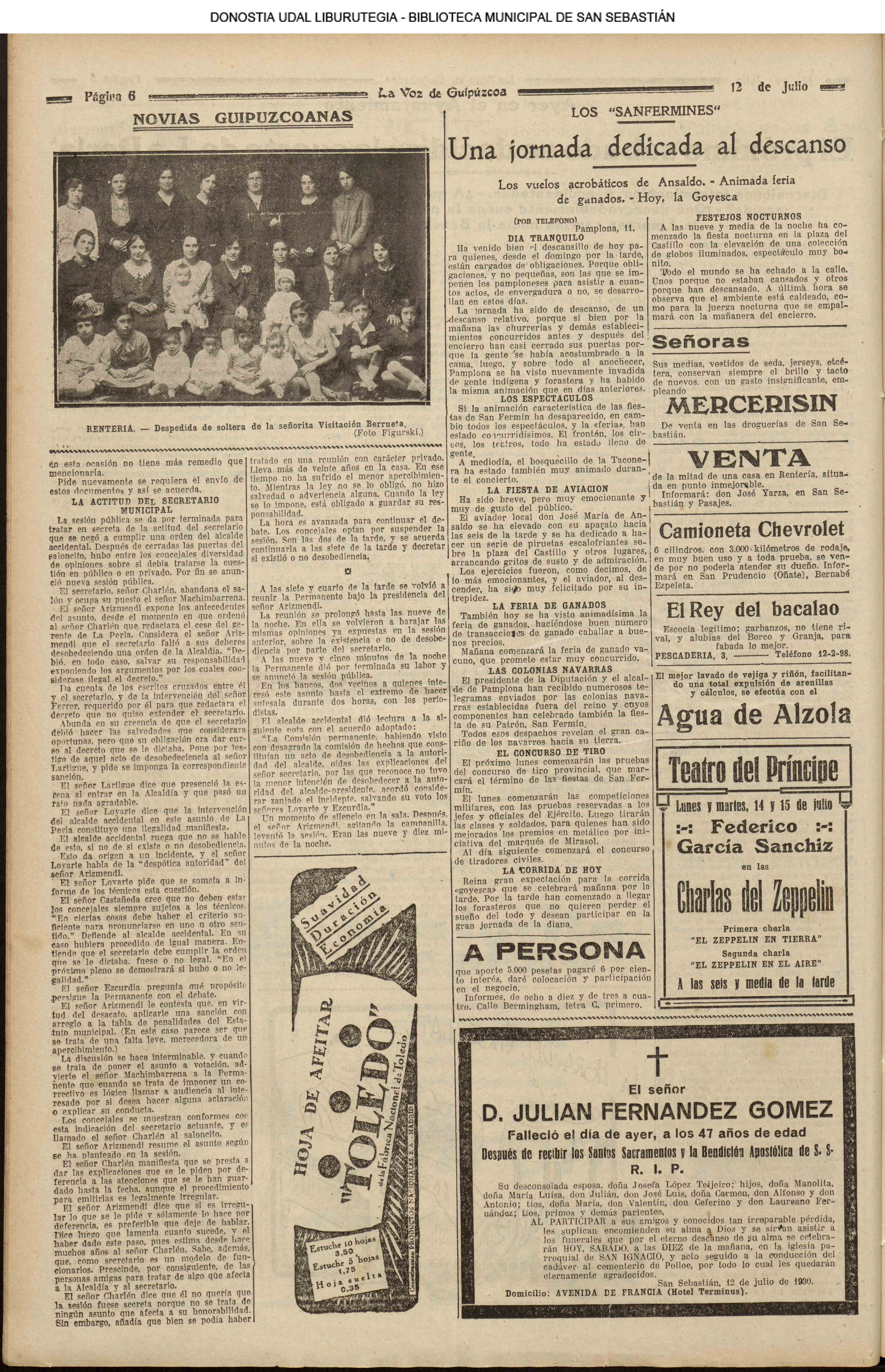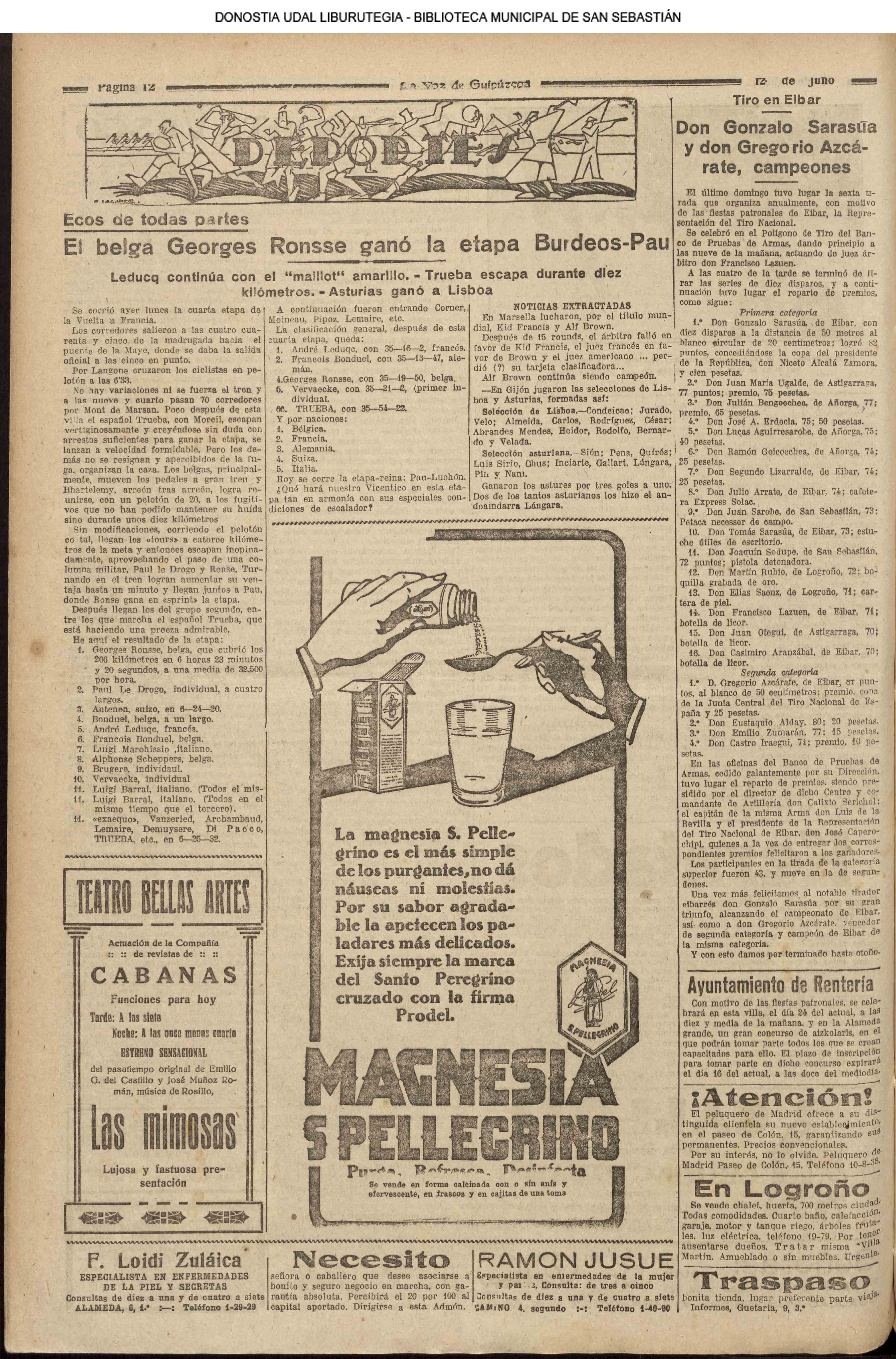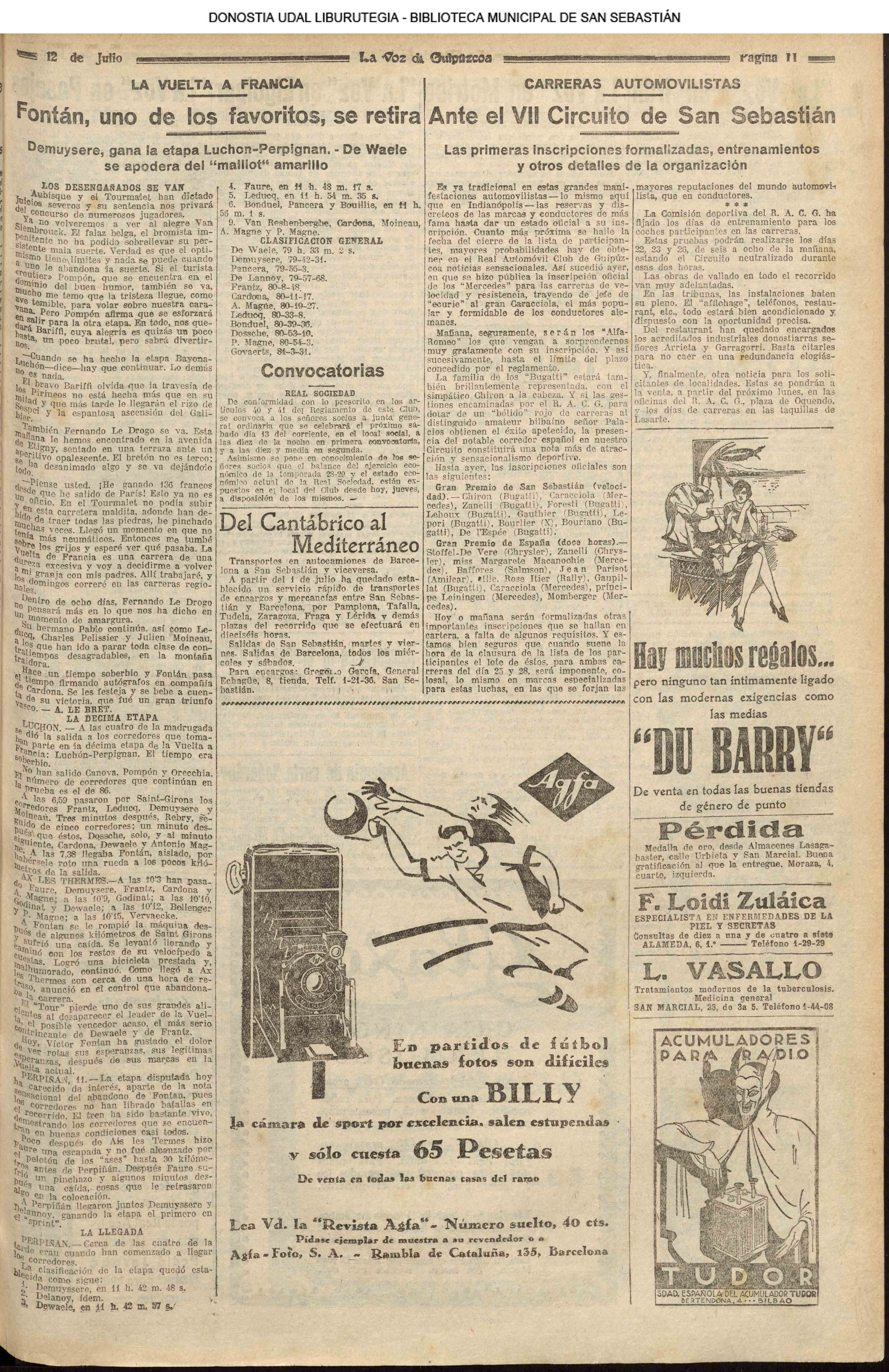 | 1945 Rafael Lataillade (1942-5-28, 1947-12-15) | (MIÉRCOLES) (*).- SIRIMIRI.- El de hoy si que fue un día delicioso. El sol cuando le da la real gana, sabe lucirse sin achicharrar a la gente; y la gente se lo agradece de veras. Como quien hace un cesto hace ciento, ya nos está sirviendo un trimestre de días iguales; o sea hasta principios de octubre, con o cual el verano donostiarra, será de los que no se olvidan. Y que no nos vengan hablando de que hace falta agua.... Funcionando bien el servicio hidráulico nocturno de las nubes, el diurno es obligatorio de Febo. Aparte de que, llueva o no, ya tenemos tragado que el que no va a servirnos es el ascensor (DV) (*).- SUCESOS : JOVEN MUERTO. # El joven José Gárate , de 17 años, se dirigía, a las tres y media de la tarde, montado en bicicleta, a la farmacia de Tellería, donde prestaba sus servicios, cuando en el cruce de las calles San Martín y Victor Pradera (hoy Easo) fue arrollado por un auto del servicio municipal. Una de las ruedas pasó por la cabeza, destrozándole. Trasladado a la Casa de Socorro, el médico de guardia solo pudo certificar la defunción. Era un excelente muchacho, hijo de un chófer muy conocido en San Sebastián, a quien expresamos nuestro sentimiento por la tremenda desgracia.(DV) (*).- TRAINERAS. # La nueva reglamentación de traineras definitivamente no se implantará este año. (DV)