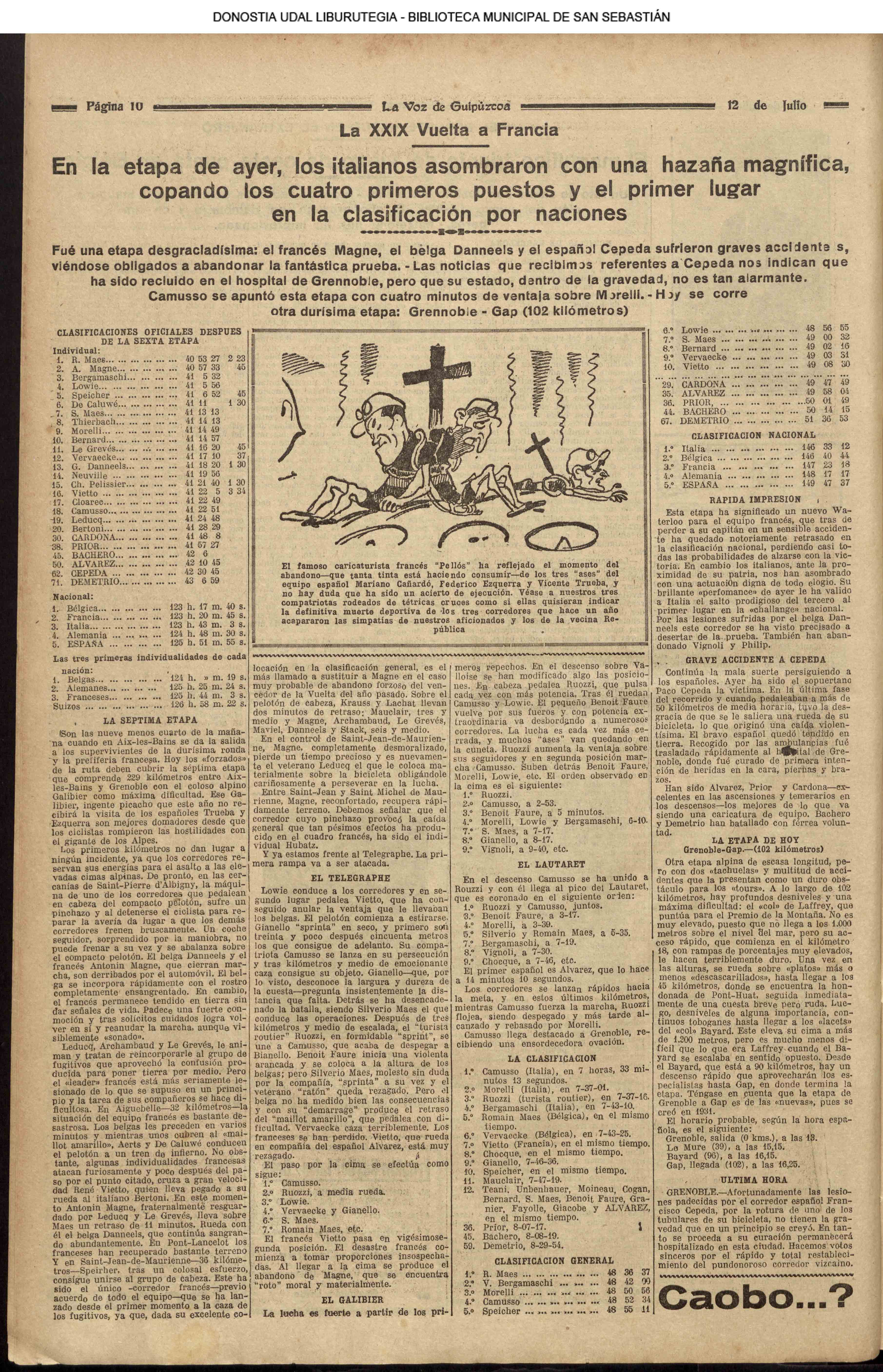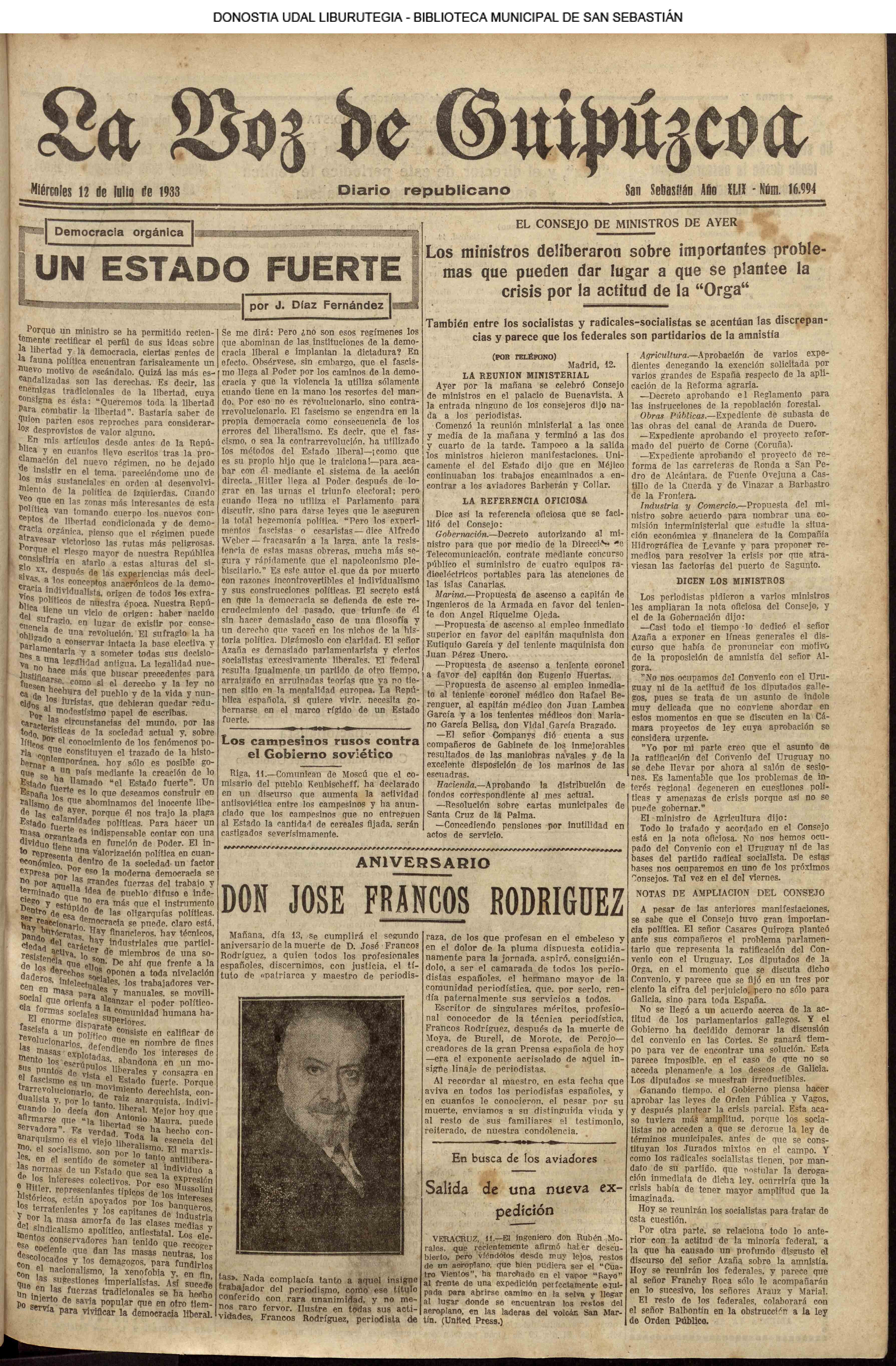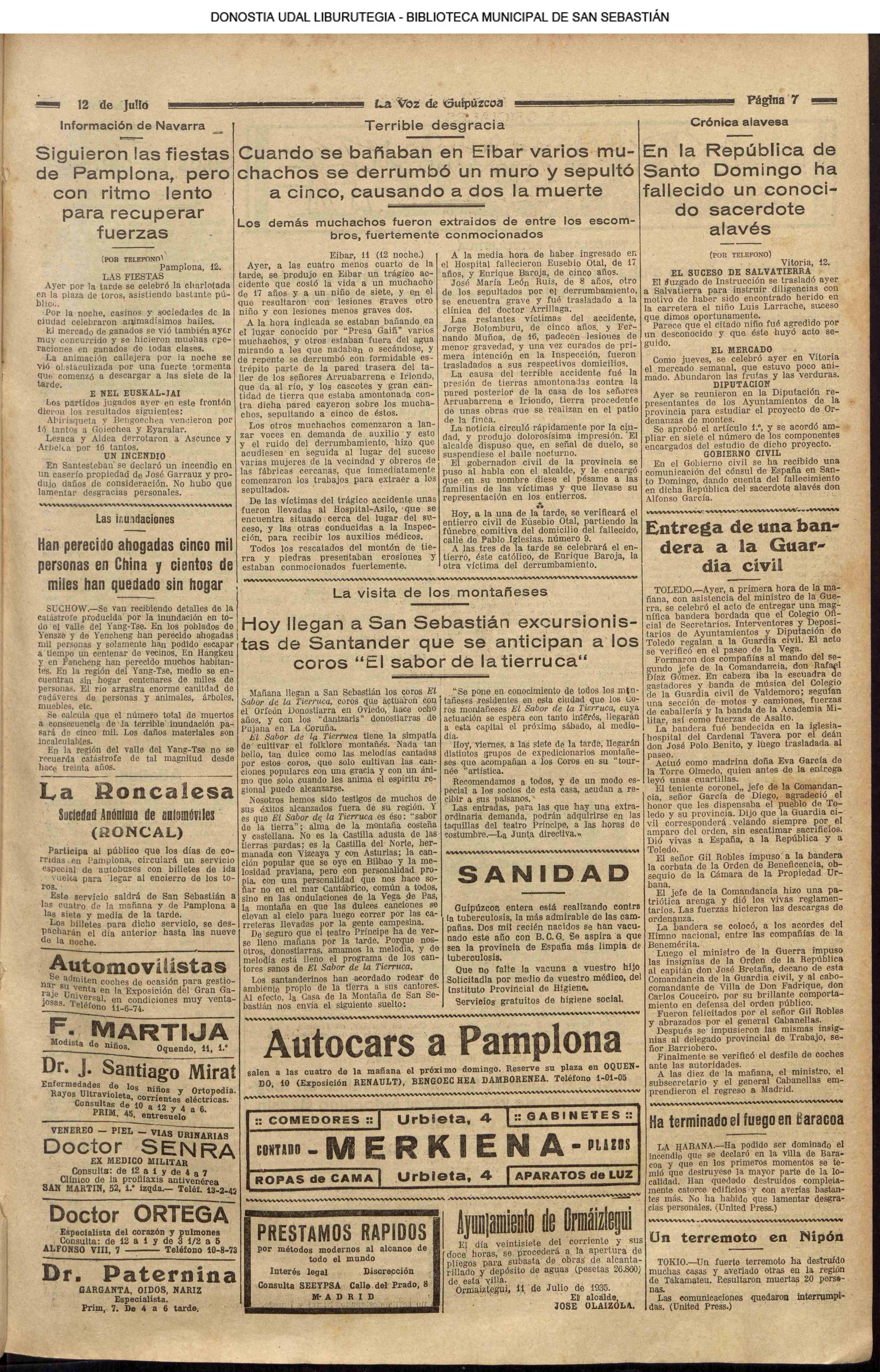 | 1996 Odón Elorza, 1991 - 2011, PSE-EE ![]() ![]() | (JUEVES) (*).- EL TIEMPO .- Otro día tristón. En algún momento pareció que iba a abrirse algún claro entre las nubes, pero fue un espejismo. Entre los hoteleros y bareros cunde cierta alarma, ya que esta situación espanta a los turistas.(19960712.pdf) (*).- Fallece en Urrugne, de una parada cardiaca, el histórico dirigente de ETA Juan José Etxabe. (19960713.pdf) 19960712.pdf
