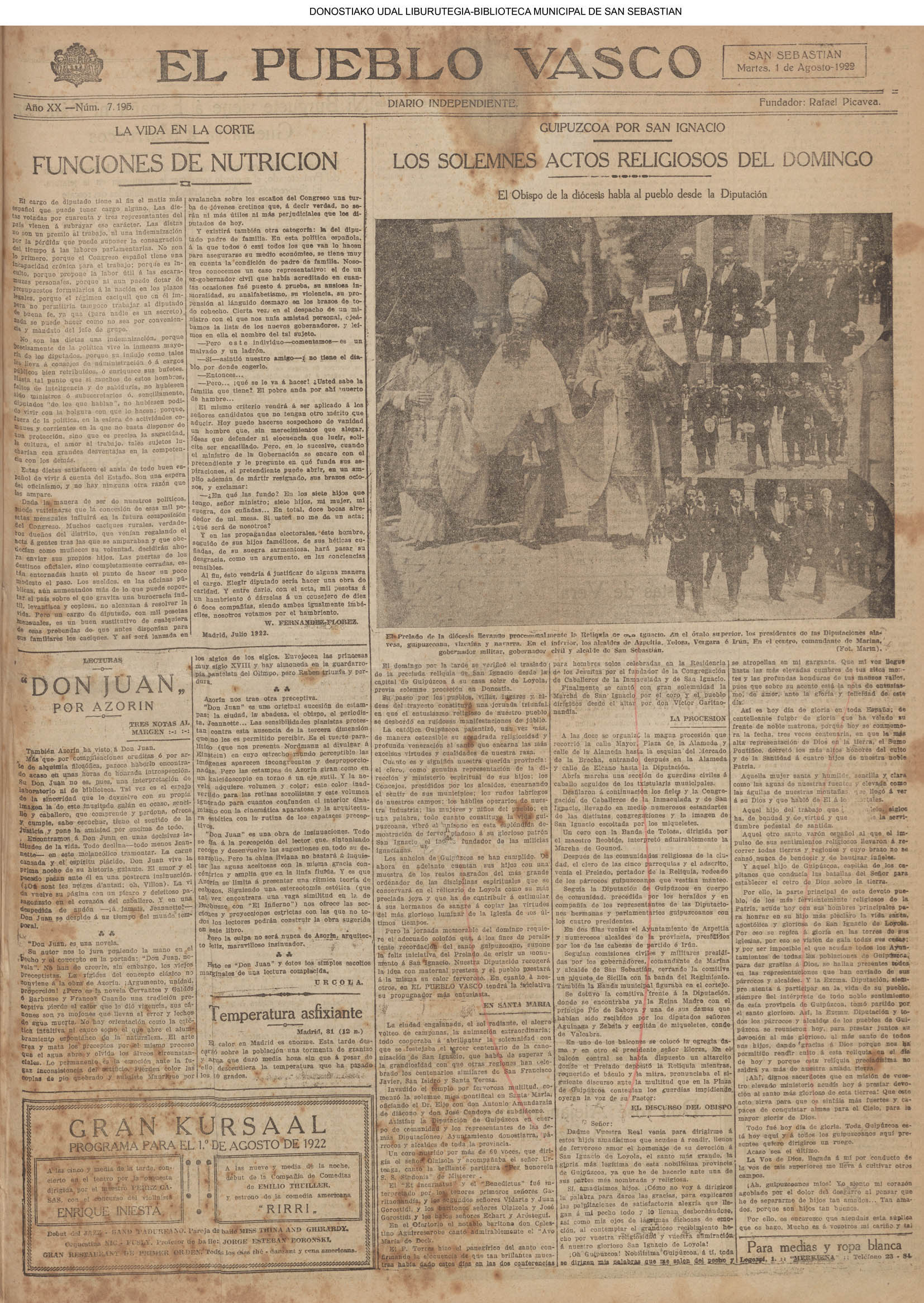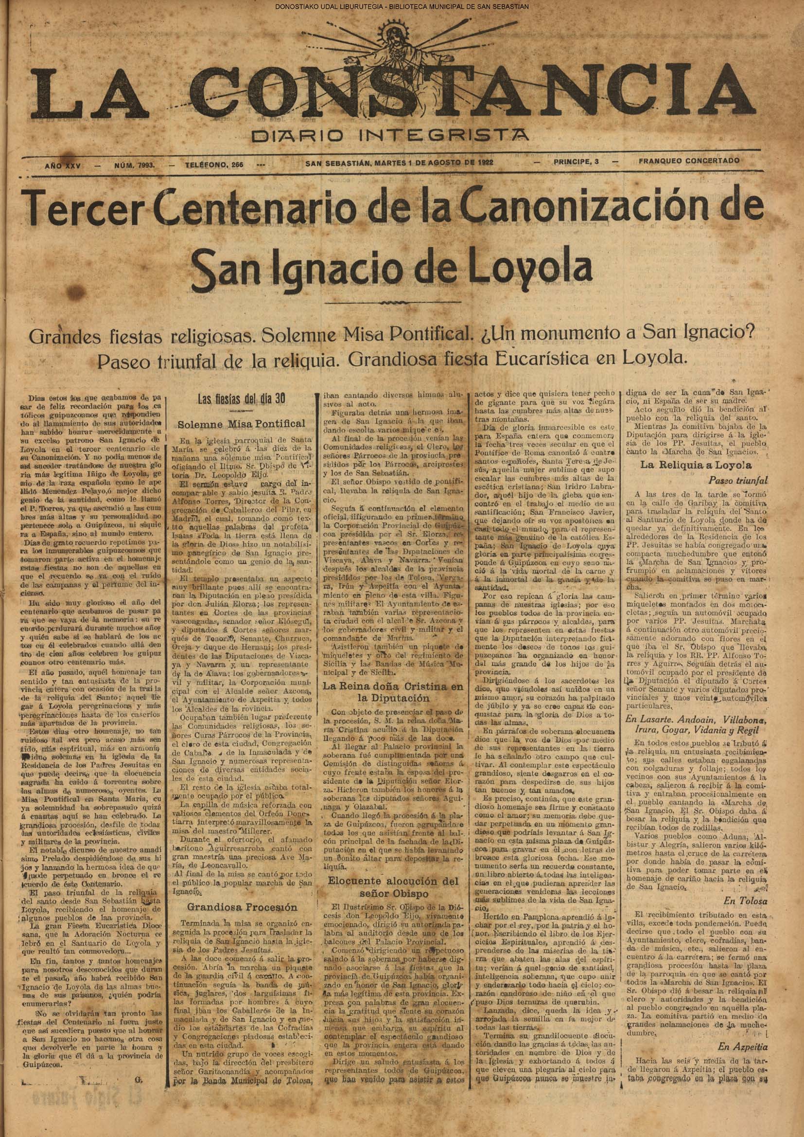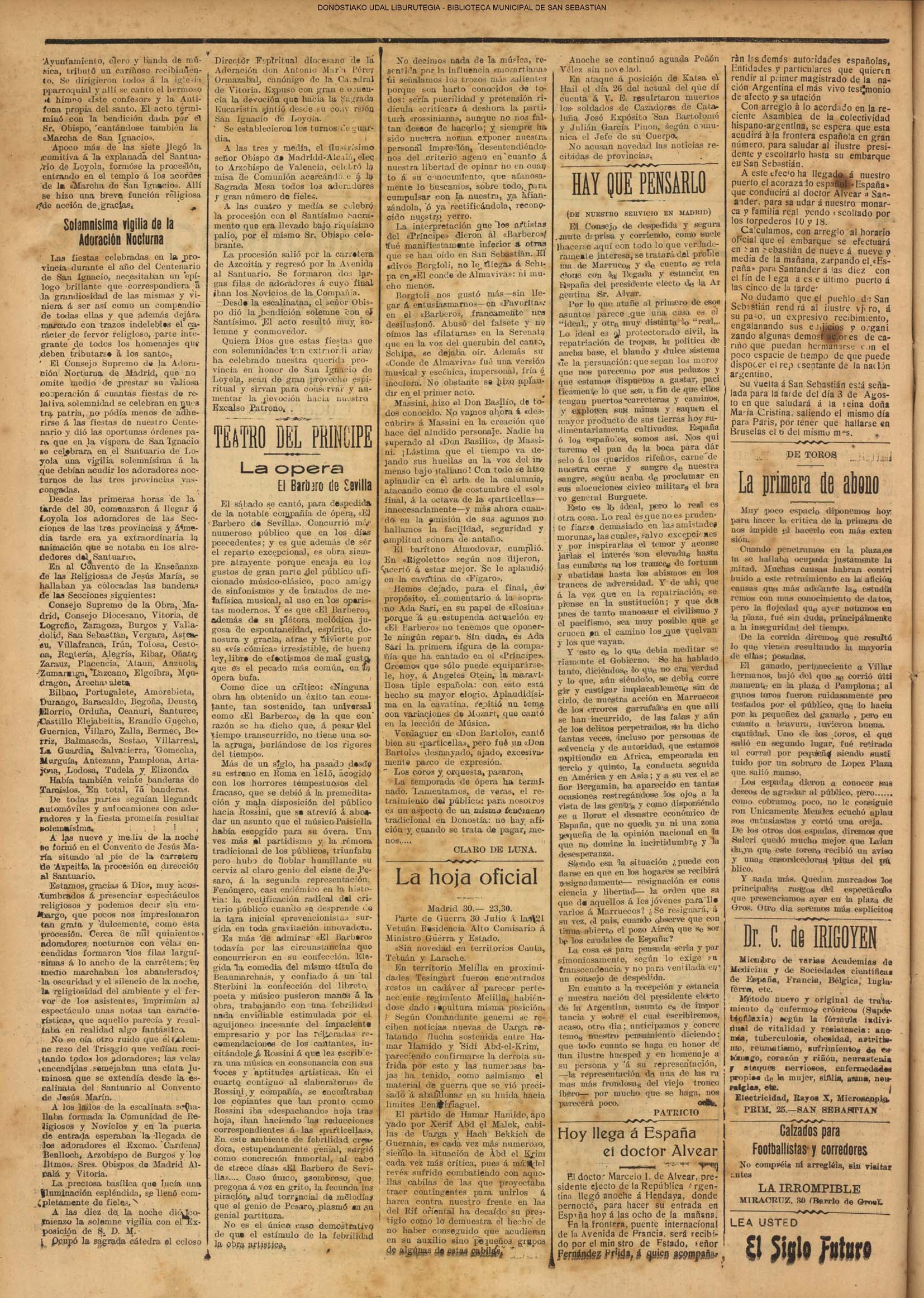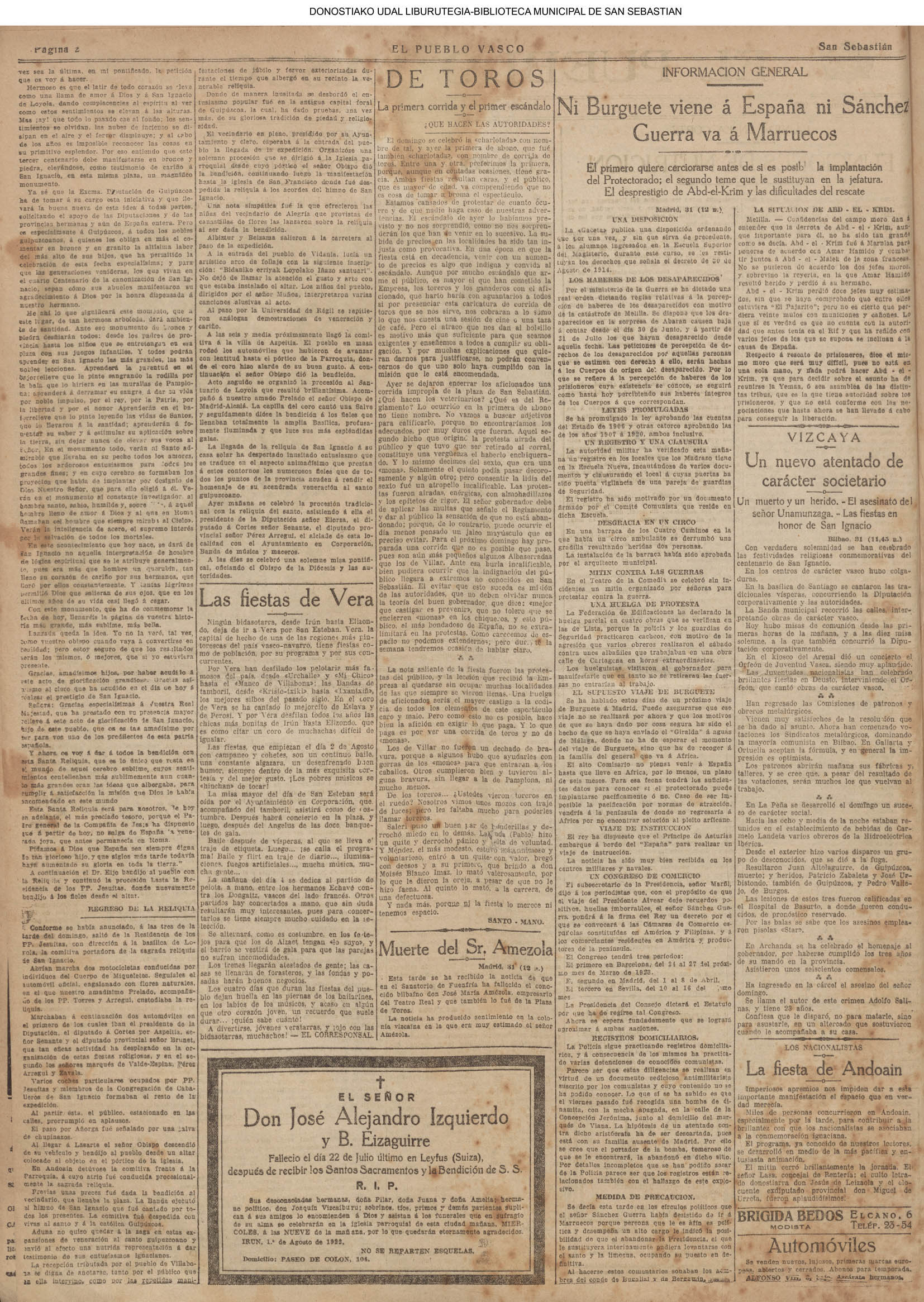 Las baterías de San Marcos y los fusileros milicianos obligan a retirarse a los grupos más avanzados de requetés a los montes de Oyarzun, donde serán batidos. A los rebeldes que llegaron a Beasain se les bate duramente y a los refugiados en la fábrica de vagones se les bombardea eficazmente. Columnas combinadas les atacan por varios puntos para envolverlos. (*).- INFORMACIÓN OFICIAL DE LAS COMISARIAS. # TRANSPORTES Y ORDEN PÚBLICO.- Las autorizaciones de circulación de vehículos deben ser renovadas. Se gestiona la reanudación de nuevos servicios ferroviarios Los serenos de comercio y los trabajadores de la Fábrica de Gas a sus respectivos puestos. Se pagan los haberes pasivos a los pensionistas Municipales. (FRENTE POPULAR.Descargar ) # GUERRA Y SANIDAD. Se ha decretado la vuelta al trabajo de una manera parcial. Se exceptúan en aquellos sitios en que subsisten elementos facciosos, quedando relevados los obreros pertenecientes a las milicias. Se ha constituido el Comisariado de Sanidad. (FRENTE POPULAR.Descargar ) (*).- Son ejecutadas en la cárcel de Ondarreta 53 personas (DV)(DV) |