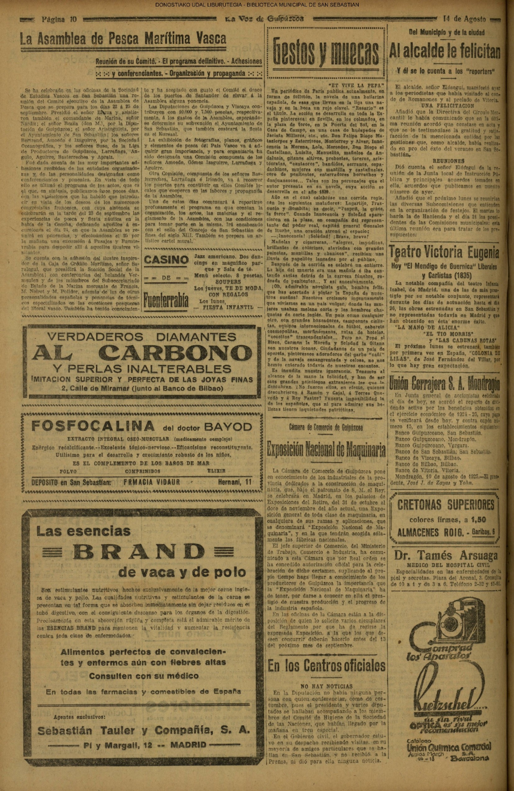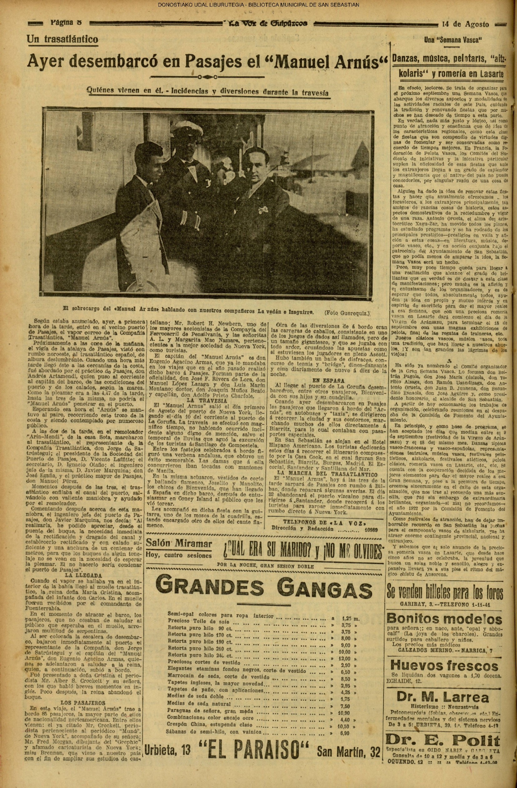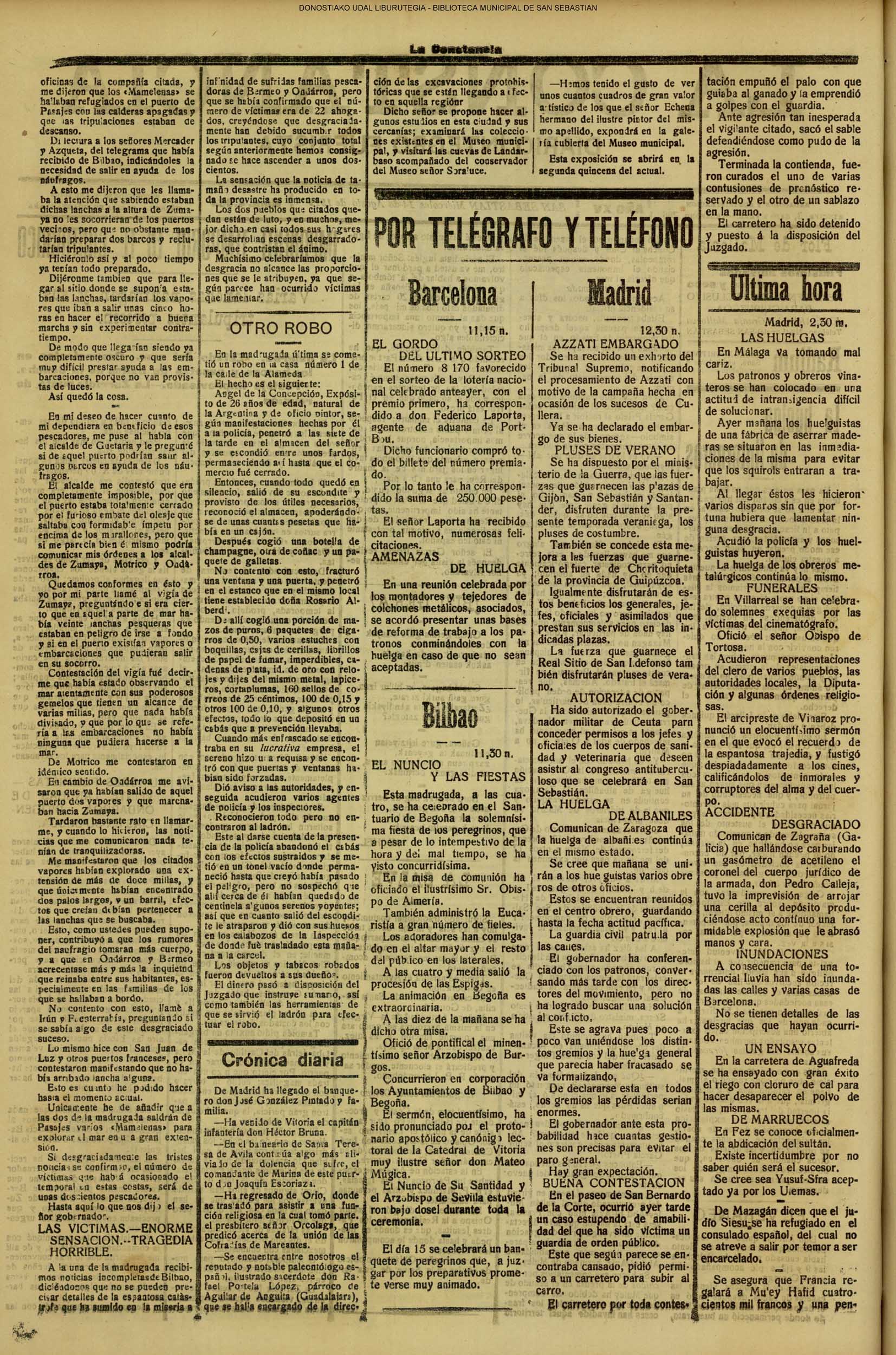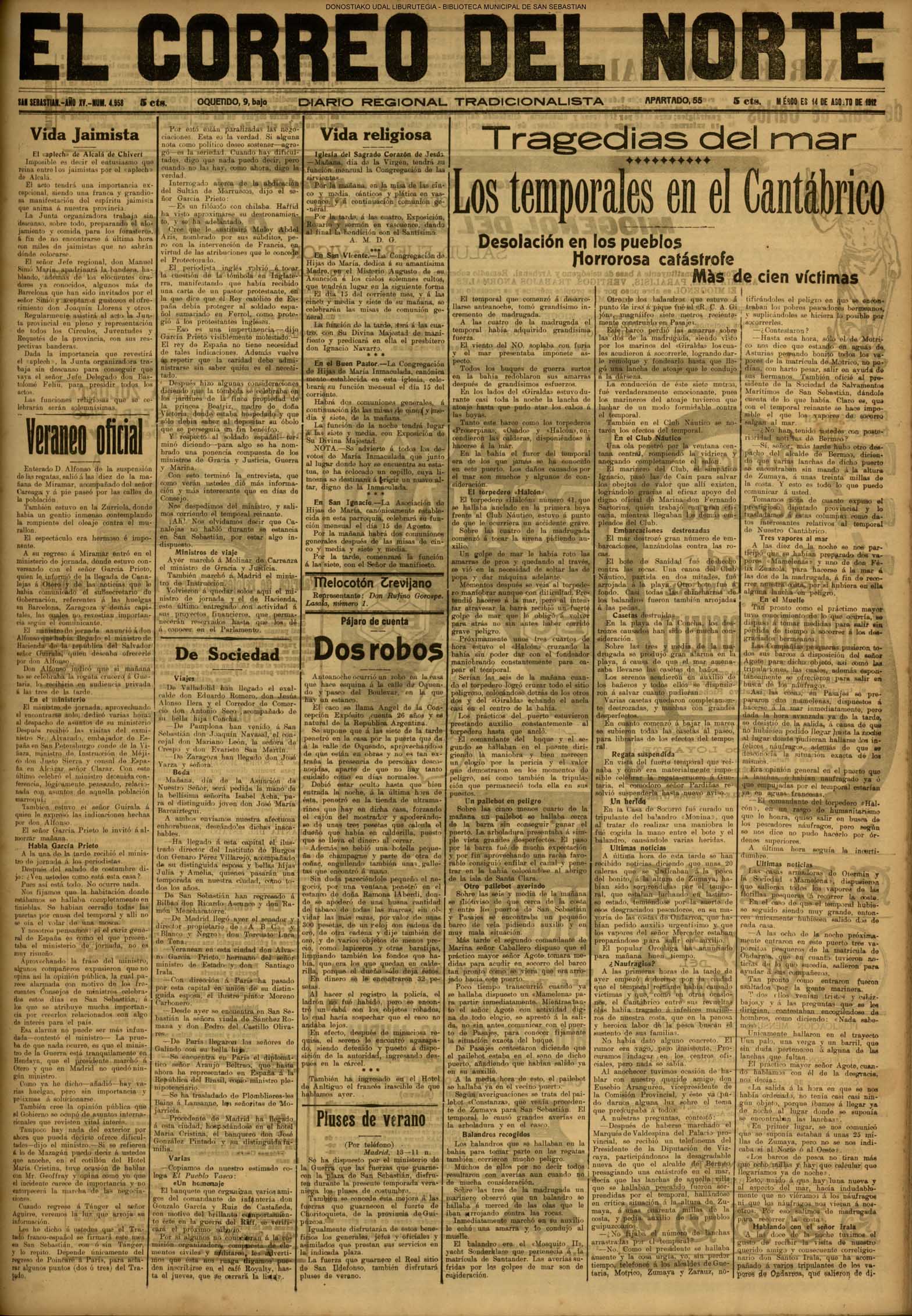 (*).- LA PESCA.- Hermosa, rica sardina trajeron los vaporcitos y motoras que saleron a esa pesca. Y se vendió a precios baratos, constituyendo, por tanto, entre los veraneantes sobre todo, el plato del día (*).- SUCESOS. - CUATRO HERIDOS EN UN CHOQUE. A las cinco y cuarto de la tarde, un tranvía que se dirigía de San Sebastián a Pasajes chocó cerca del depósito del Benedictine, en término de Alza, con dos vagones que, cargados de piedra destinada a la Compañía del Norte, cruzaban en dicho momento la carretera. Como el tranvía marchaba a buena velocidad, el encontronazo fue violentísimo y la plataforma delantera del coche quedó destrozada, saltando también varios cristales de las ventanillas. El conductor del tranvía, Mario Cestao, resultó con constusiones en el cuerpo y lesiones en la cara, y fue conducido en un automóvil a una clínica de la capital. Las lesiones que sufre no parecen revestir gravedad. También resultaron heridas levemente, por los trozos de cristal de las ventanillas que saltaron al producirse el choque, las viajeras del tranvía Manuela Berrondo, Concepción Huarte y María Huarte, todas domiciliadas en San Sebastián. Estas lesionadas fueron curadas de primera intención en el Cuarto de Socorro de Pasajes, por el médico señor Otaño. |