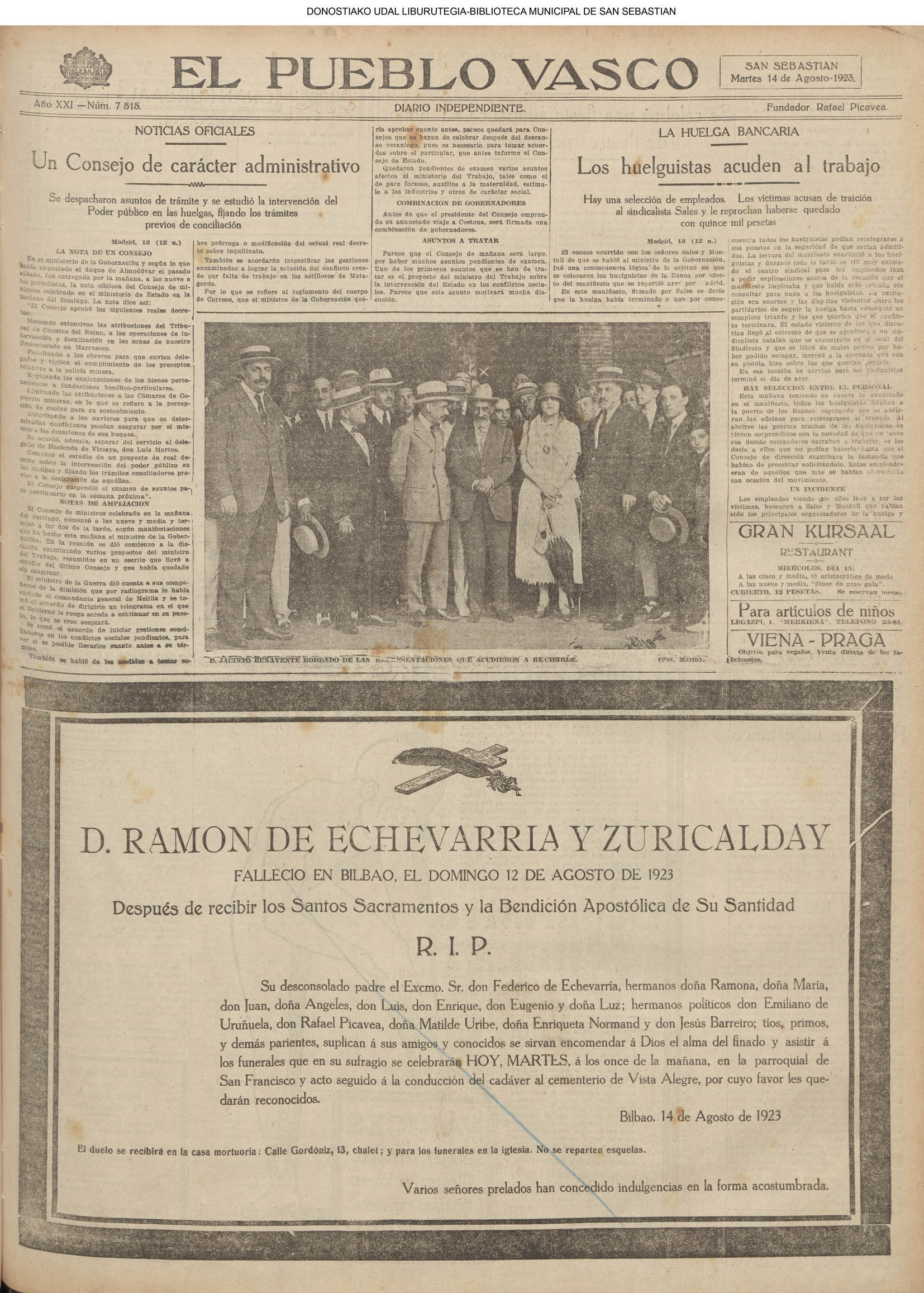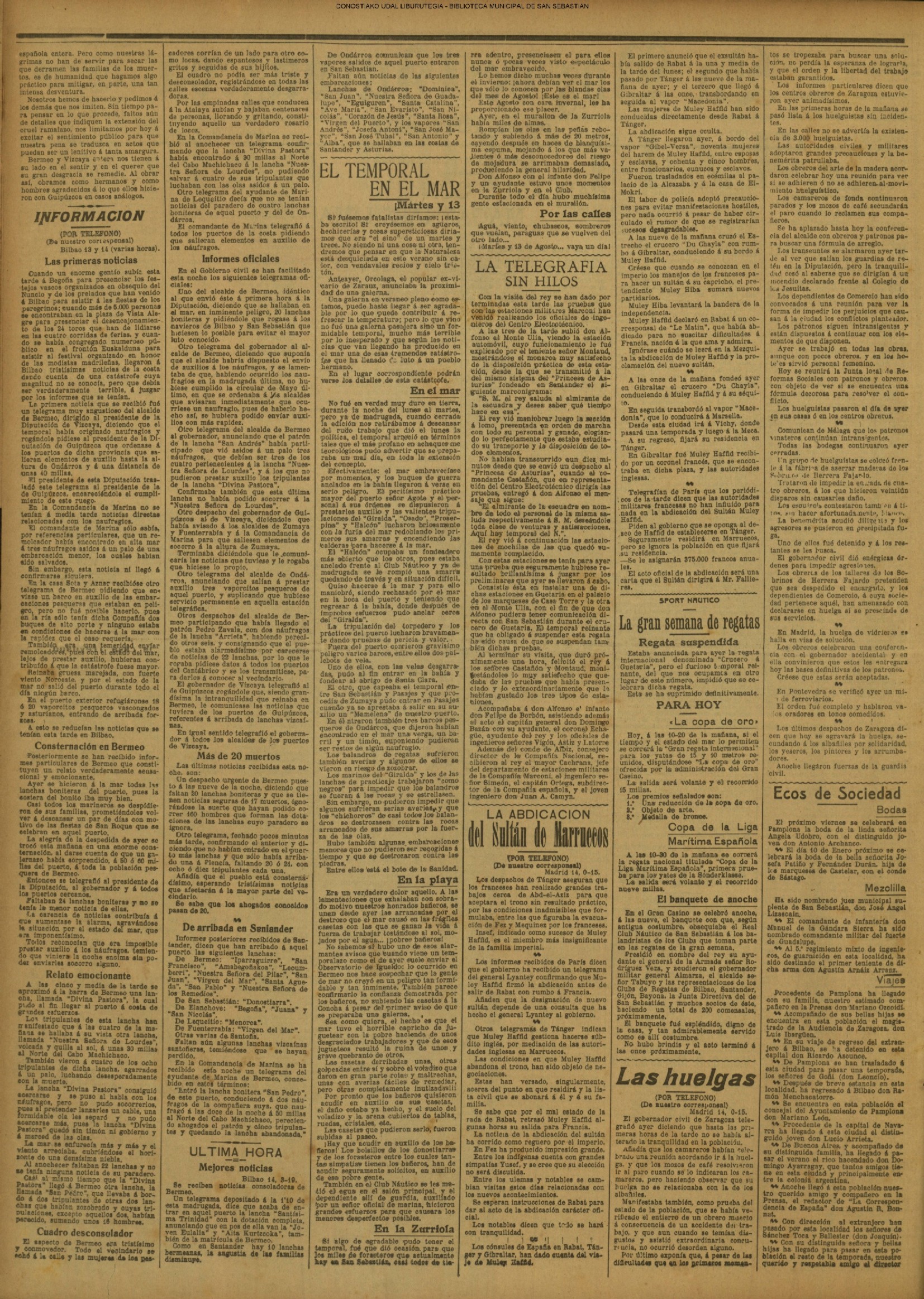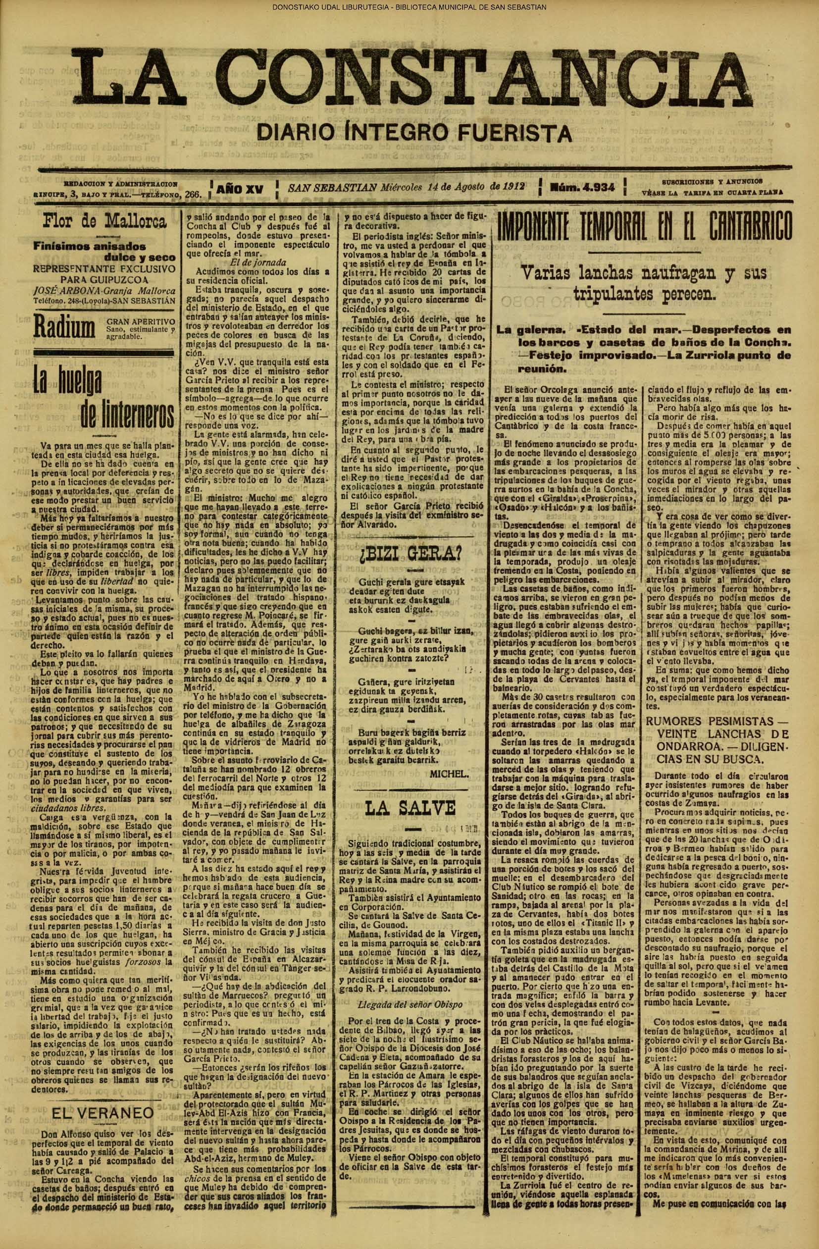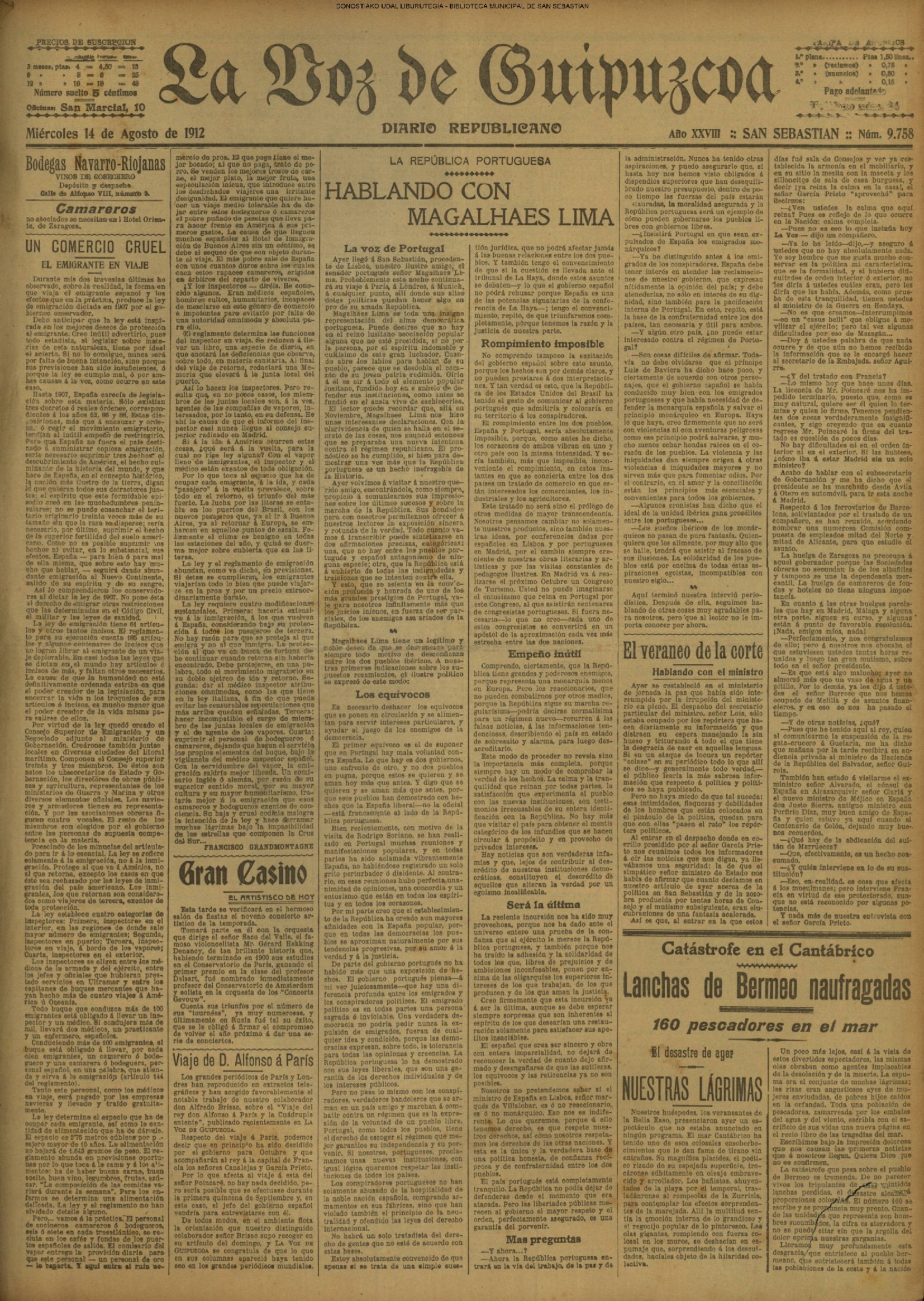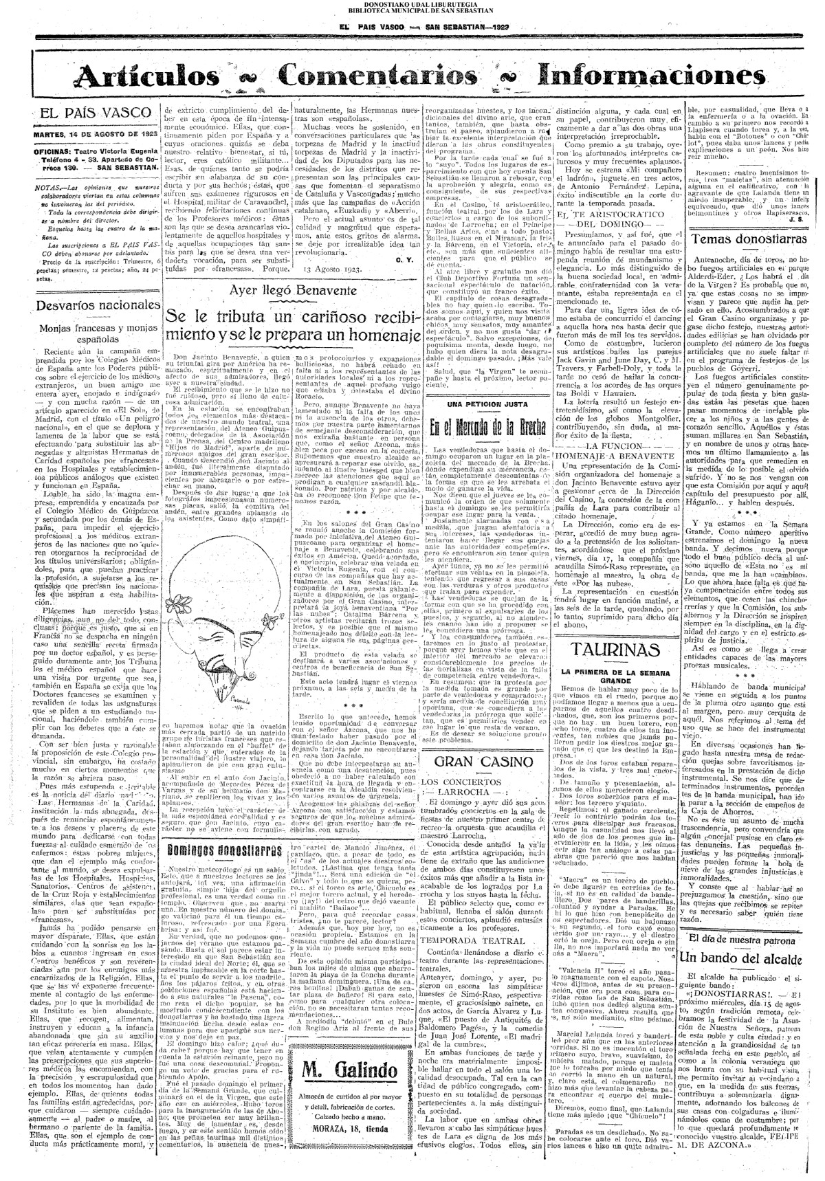 (*).- LA PESCA.- Hermosa, rica sardina trajeron los vaporcitos y motoras que saleron a esa pesca. Y se vendió a precios baratos, constituyendo, por tanto, entre los veraneantes sobre todo, el plato del día (*).- SUCESOS. - CUATRO HERIDOS EN UN CHOQUE. A las cinco y cuarto de la tarde, un tranvía que se dirigía de San Sebastián a Pasajes chocó cerca del depósito del Benedictine, en término de Alza, con dos vagones que, cargados de piedra destinada a la Compañía del Norte, cruzaban en dicho momento la carretera. Como el tranvía marchaba a buena velocidad, el encontronazo fue violentísimo y la plataforma delantera del coche quedó destrozada, saltando también varios cristales de las ventanillas. El conductor del tranvía, Mario Cestao, resultó con constusiones en el cuerpo y lesiones en la cara, y fue conducido en un automóvil a una clínica de la capital. Las lesiones que sufre no parecen revestir gravedad. También resultaron heridas levemente, por los trozos de cristal de las ventanillas que saltaron al producirse el choque, las viajeras del tranvía Manuela Berrondo, Concepción Huarte y María Huarte, todas domiciliadas en San Sebastián. Estas lesionadas fueron curadas de primera intención en el Cuarto de Socorro de Pasajes, por el médico señor Otaño. |