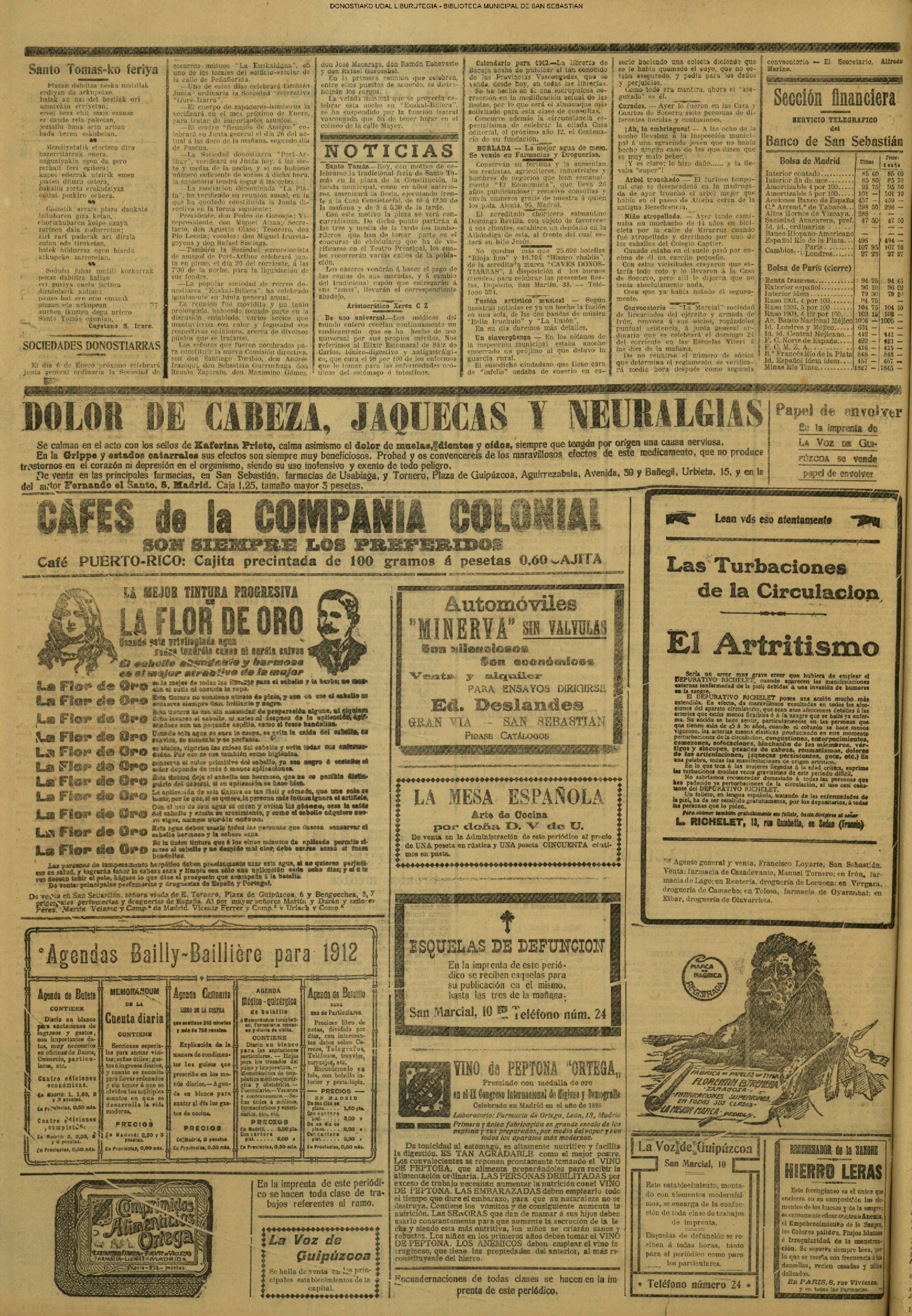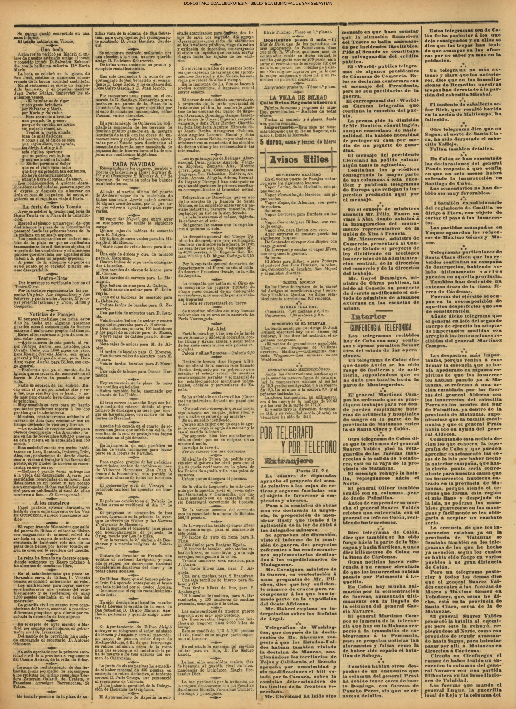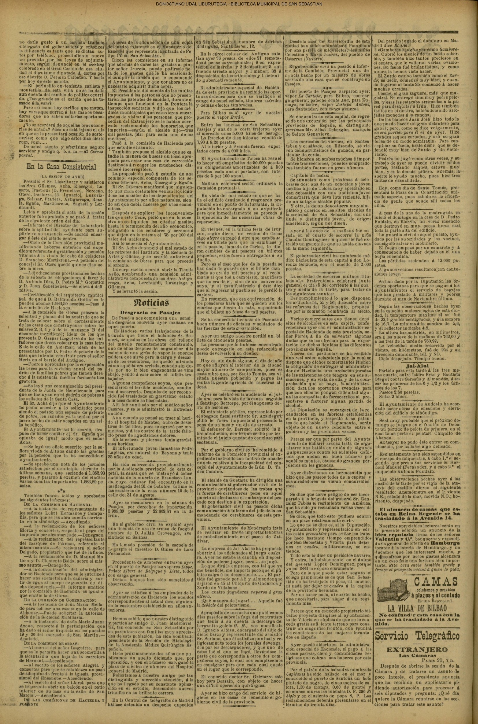 Santo Tomás Concurrida, como pocos años, estuvo ayer la feria de Santo Tomás, pues el tiempo se aguanto los chaparrones que son como de rúbrica en este dis, primero del invierno. La plaza de la Constitución presentaba na cuadro suimadísimo con sus puestos de frutas, cacharros, telas y cachivaches originales, y una abigarrada multitud, on que so entremezclaba el elemento casero, de legitima y genuina cepa guipuzcoaua, con el coshquero que no perdons esta fies ta de las de se mayor calto, Los caseros, que habían cumplido la tradicional costumbre de la visita al amo, para Hevarle el par de óticos capones en Jefiul de pleitesía, se proveian en la plaza de todas las golosinas para celebrar las fiestas de la Passia. Mucho barullo, macha animación, sin quo se turbara el boen orden, ni habiose que lamentar más que alguna i otra baja... por cuestión de la escala de los alcoholes Un pastor de Vallaercanos (Burgos) iné mordido haze seis o slete meses en el bra-zo por an perro hidrófobo. Pretendieron algunas personas que fae-ra á. Baraslona al laboratorio del doctor Forrón para ser carado, pero él prefirió ir ὁ ατια κululadora. El desgraciado pastor murió el lunes después de horribles padecimientos.