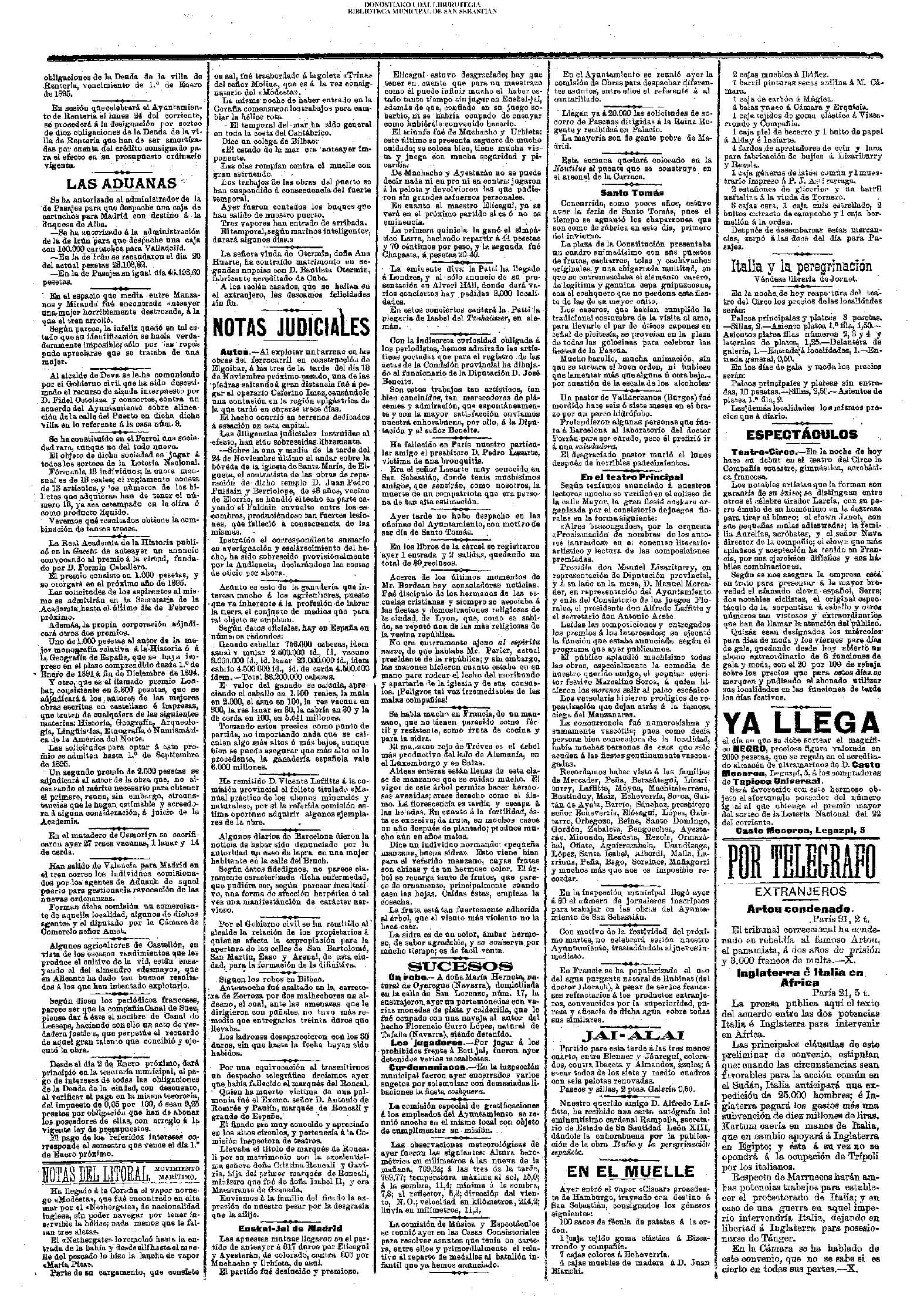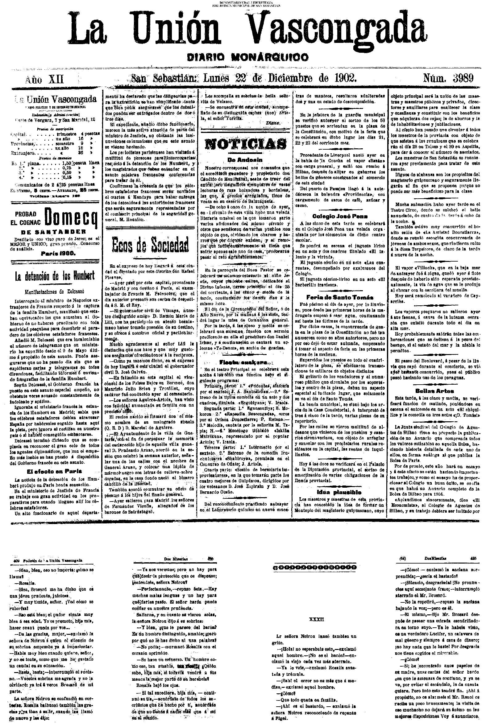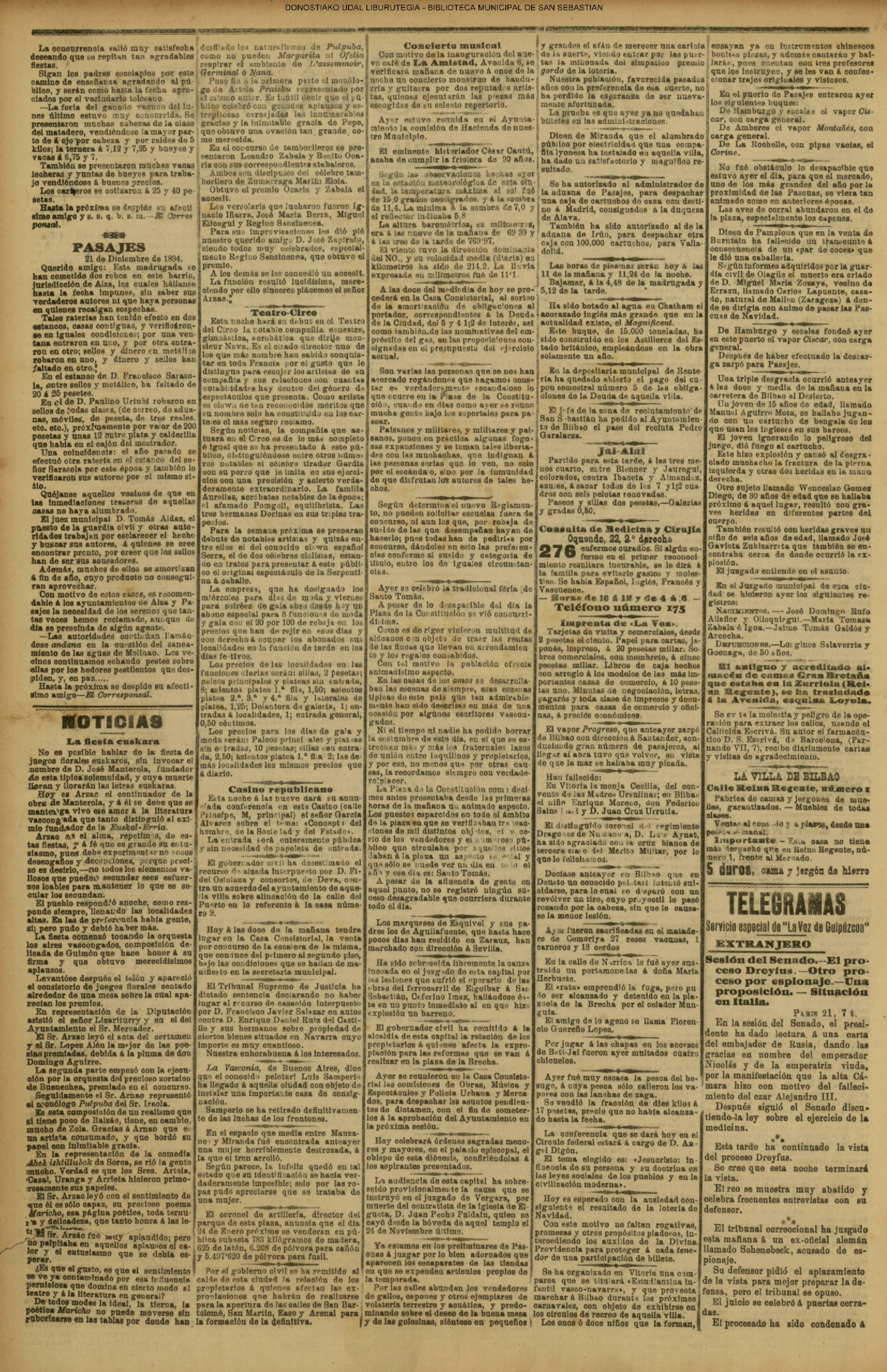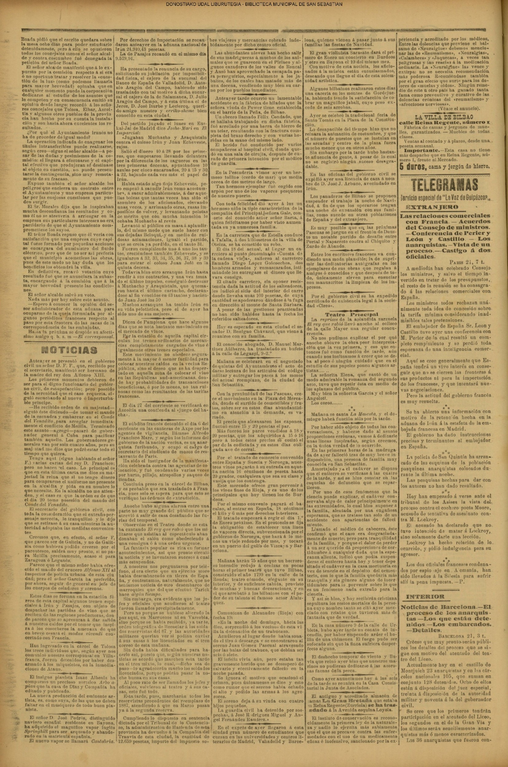 Santo Tomás Concurrida, como pocos años, estuvo ayer la feria de Santo Tomás, pues el tiempo se aguanto los chaparrones que son como de rúbrica en este dis, primero del invierno. La plaza de la Constitución presentaba na cuadro suimadísimo con sus puestos de frutas, cacharros, telas y cachivaches originales, y una abigarrada multitud, on que so entremezclaba el elemento casero, de legitima y genuina cepa guipuzcoaua, con el coshquero que no perdons esta fies ta de las de se mayor calto, Los caseros, que habían cumplido la tradicional costumbre de la visita al amo, para Hevarle el par de óticos capones en Jefiul de pleitesía, se proveian en la plaza de todas las golosinas para celebrar las fiestas de la Passia. Mucho barullo, macha animación, sin quo se turbara el boen orden, ni habiose que lamentar más que alguna i otra baja... por cuestión de la escala de los alcoholes Un pastor de Vallaercanos (Burgos) iné mordido haze seis o slete meses en el bra-zo por an perro hidrófobo. Pretendieron algunas personas que fae-ra á. Baraslona al laboratorio del doctor Forrón para ser carado, pero él prefirió ir ὁ ατια κululadora. El desgraciado pastor murió el lunes después de horribles padecimientos.