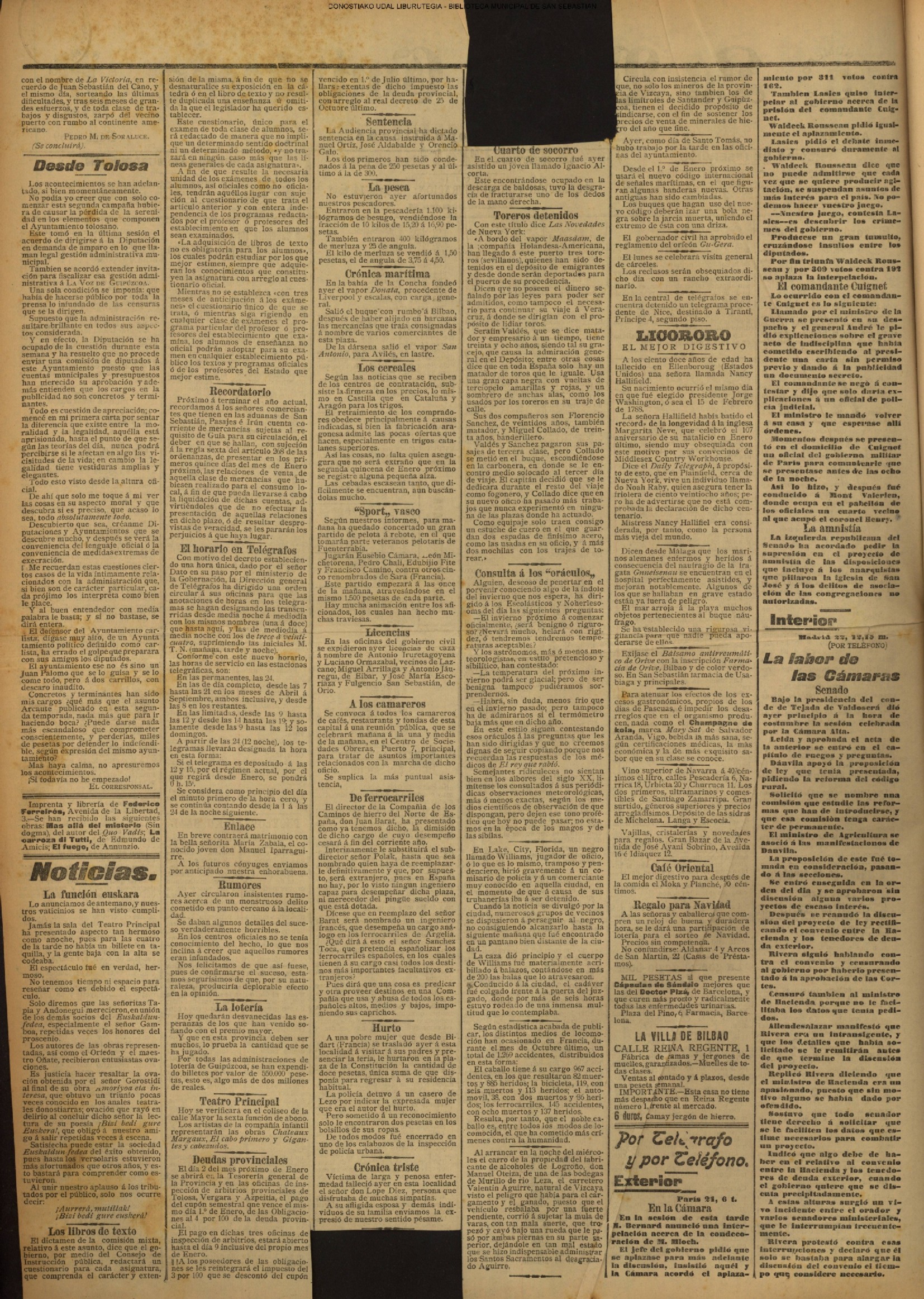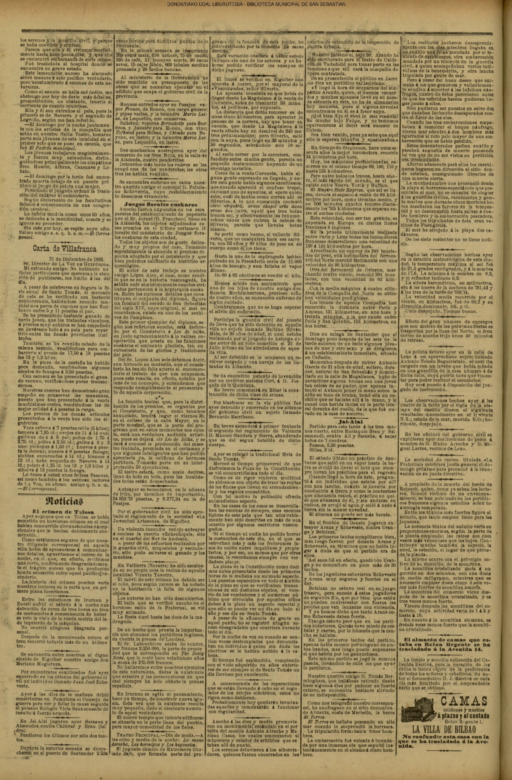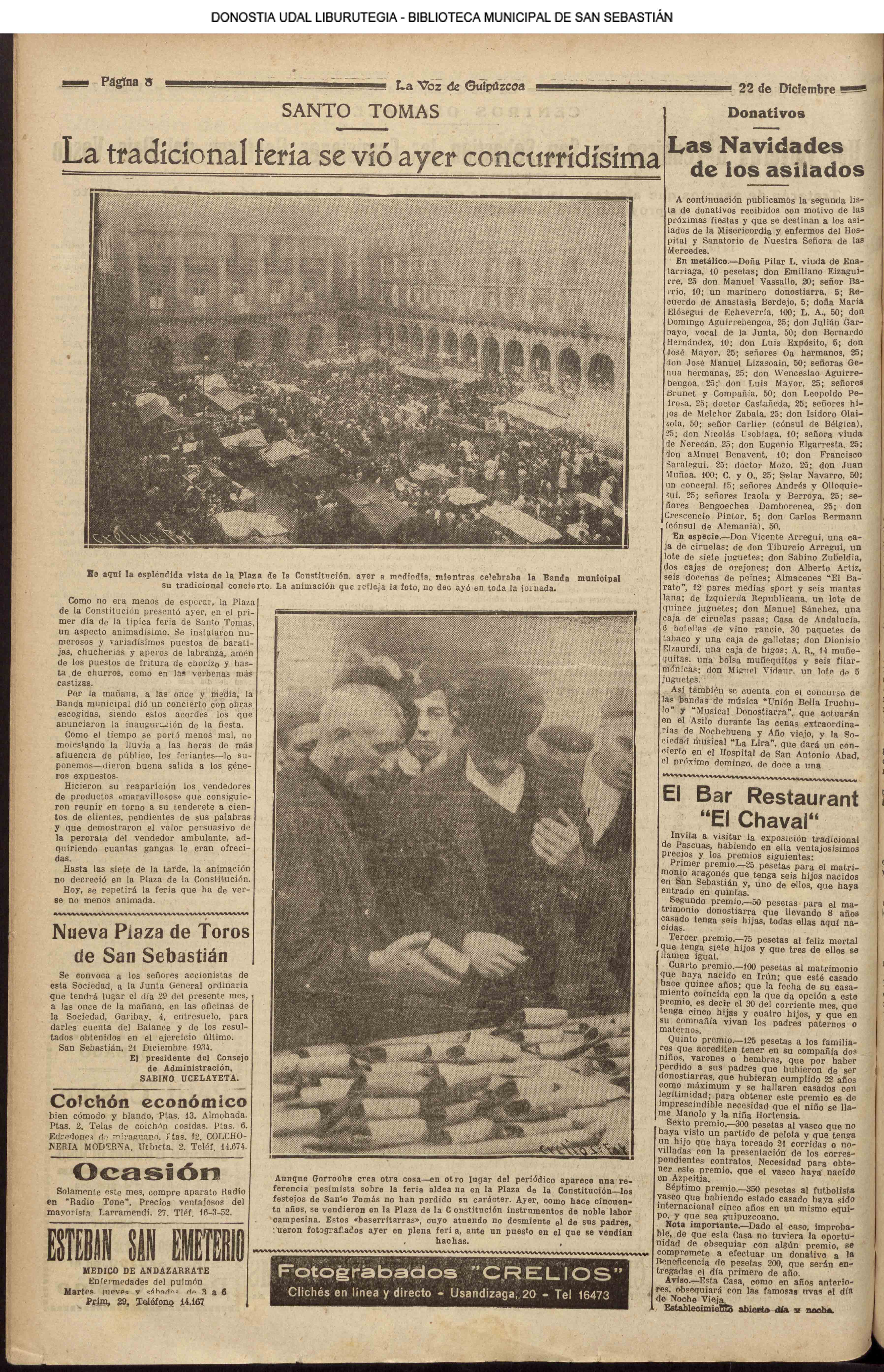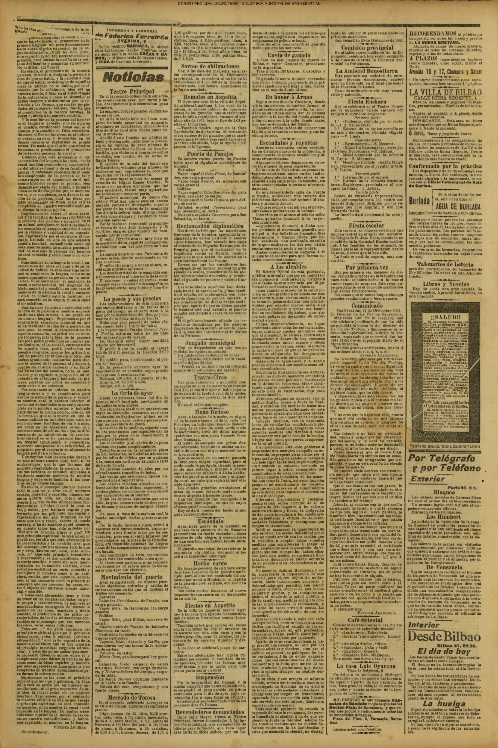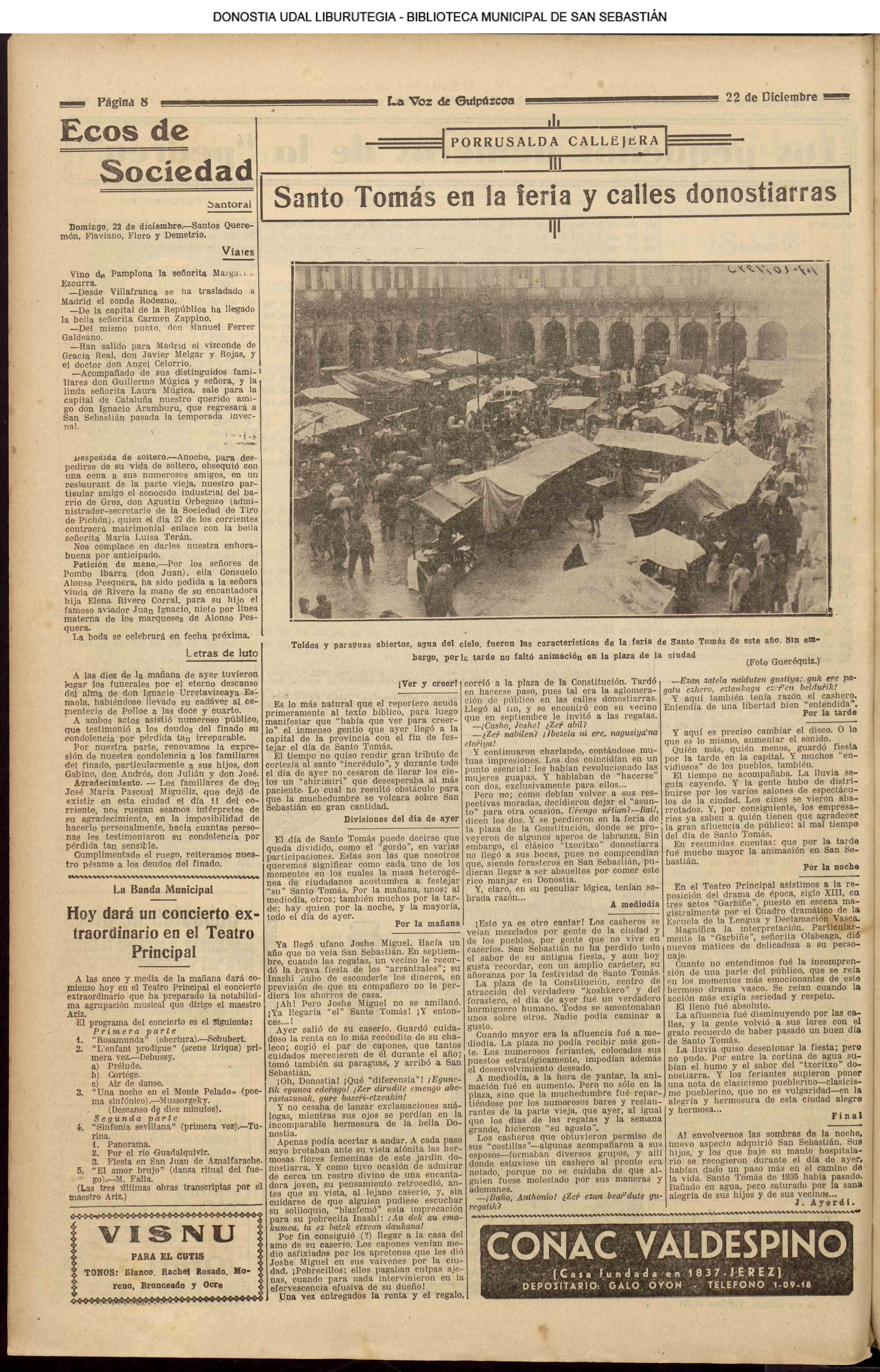 22.12 - Ayer(21.12) se celebró la tradicional feria de Santo Tomás. A pesar de lo desapacible del dia la Plaza de la Constitución se vió consueri-disima. Como es de rigor vinieron multitud de aldeanos en objeto de traer las rentse de las fincas que llevan en arrendamien to y los regalos consabidos. Con tal motivo la población ofrecim animadísimo aspecto. En las onsas de los amos sa desarrolla-ban las escenas de siempre, 6588 690anas tipicas de este país que tan admirabis mente han sido deseritas en más de una ocasión por algunos escritores vascou-gados. Ni el tiempo ni nadie ha podido borrar la cestumbre de este día, en el que se es-trechan más y más los fraternales lazos de unión entre Inquilinos y propietarios, y por eso, no menos que por otras cau-sas, la recordamos slempro con verdade-ro placer. La Piaza de la Constitución com deci mos antes presentaba desde las primeras horas de la mañana uu animado aspecto. Los puestos esparcidos en todo el ámbito de la plaza en que se verifiasban tre tsag efones de mil distintos objetos, el v ce rio de los vendedores y el amoroso pů blico que circulaba por aquellos sitios daban á la pisza un aspecto al y que sólo se puede ver un dis en to io el aña y can dia es: Sauto Tomás. A pesar de la afluencia de gente en aquel punto, no se registró ningún su-ceso desagradable que ocurriera durante todo el dias. |