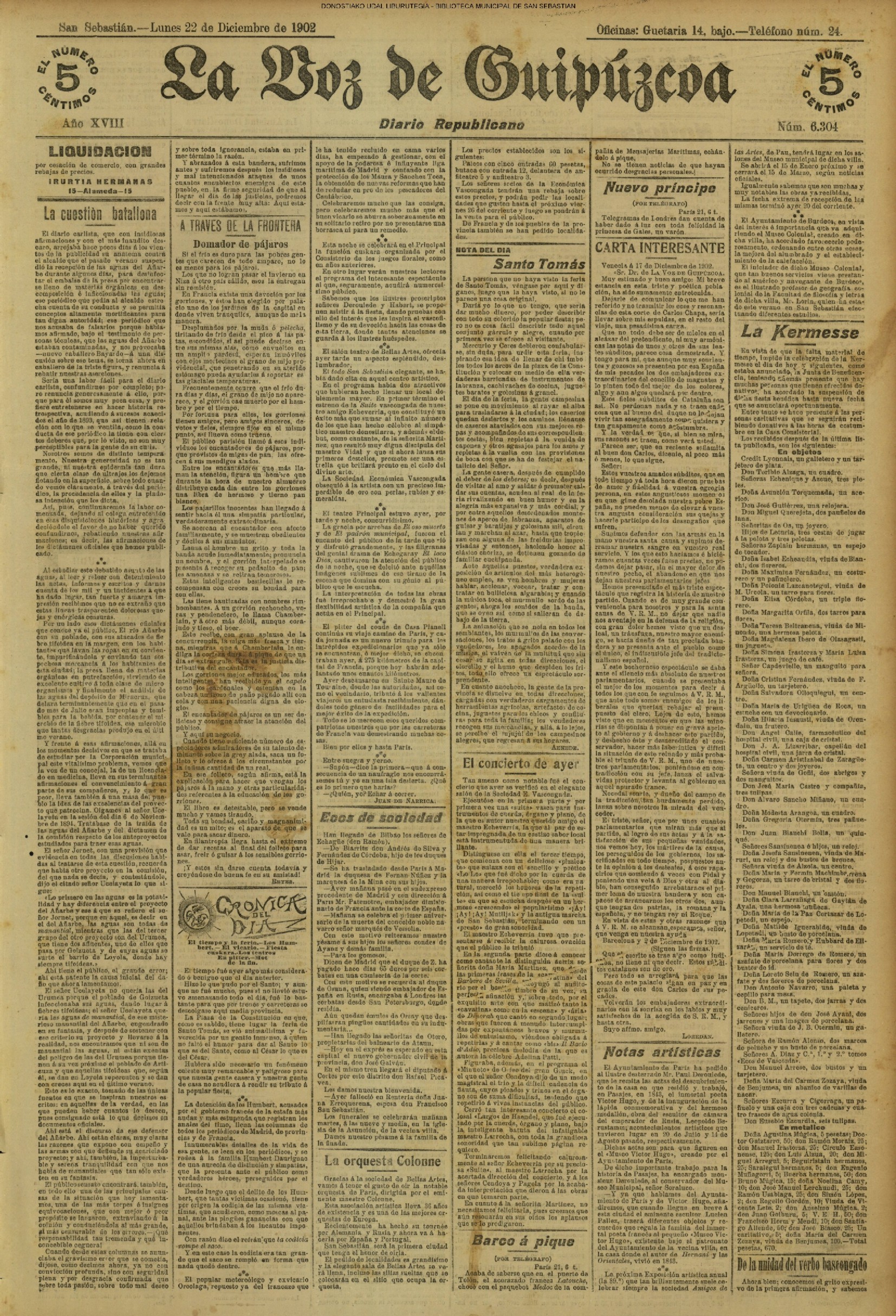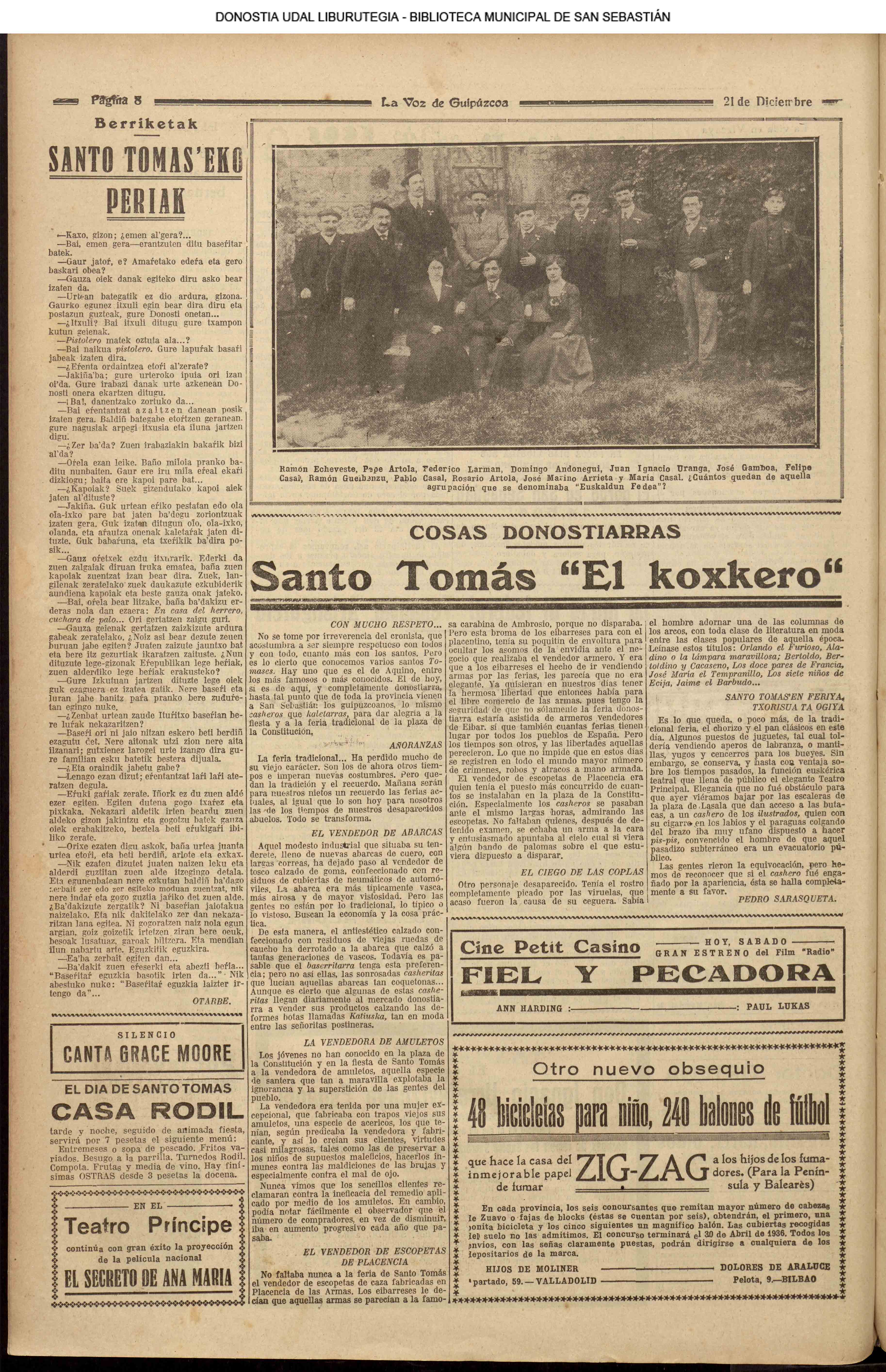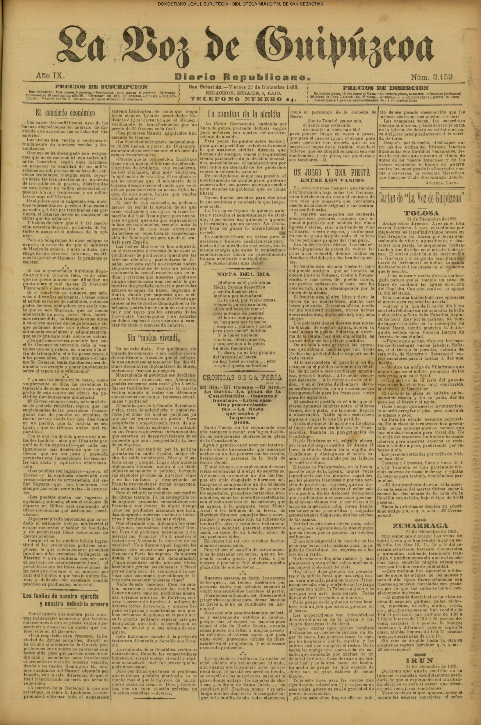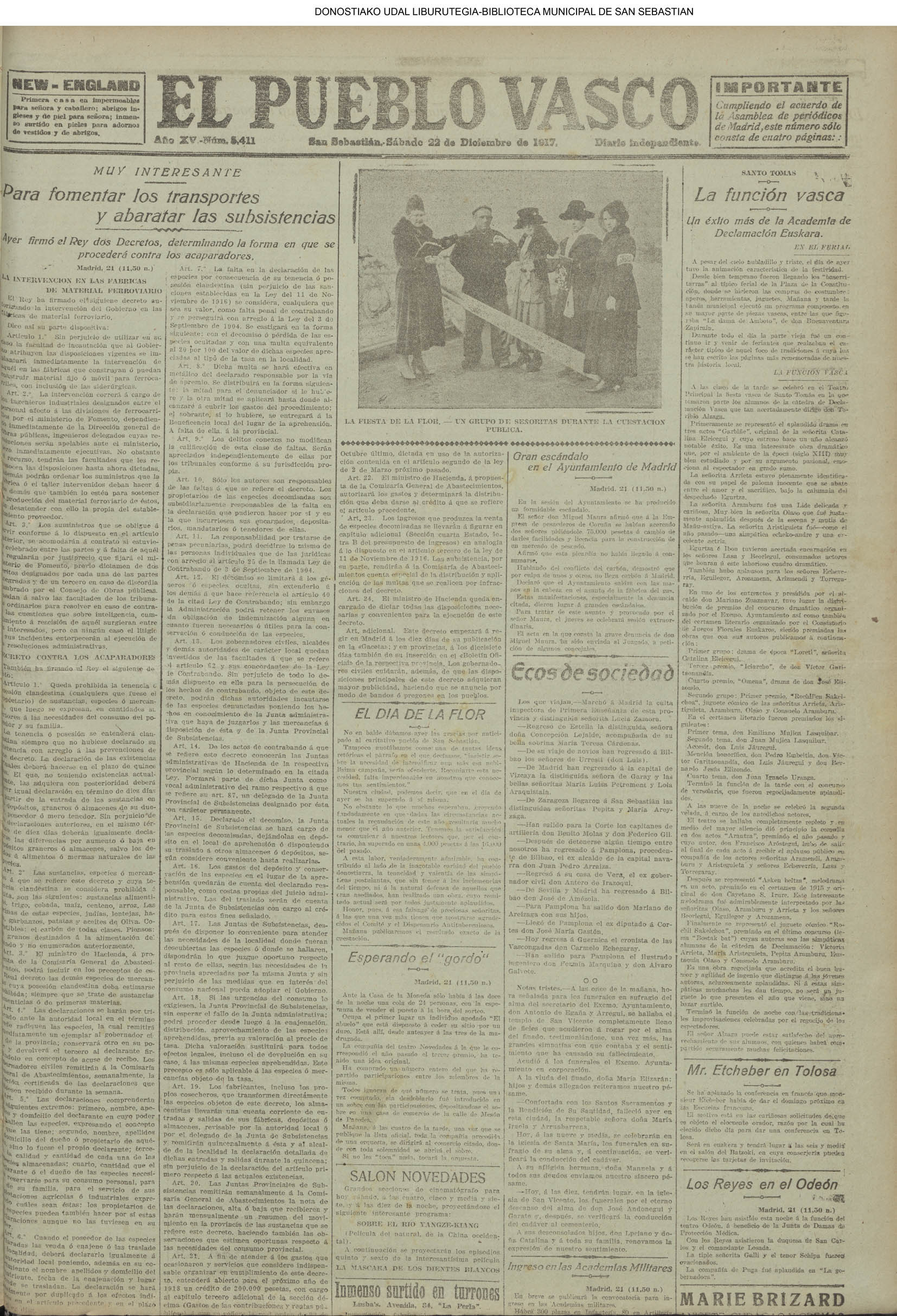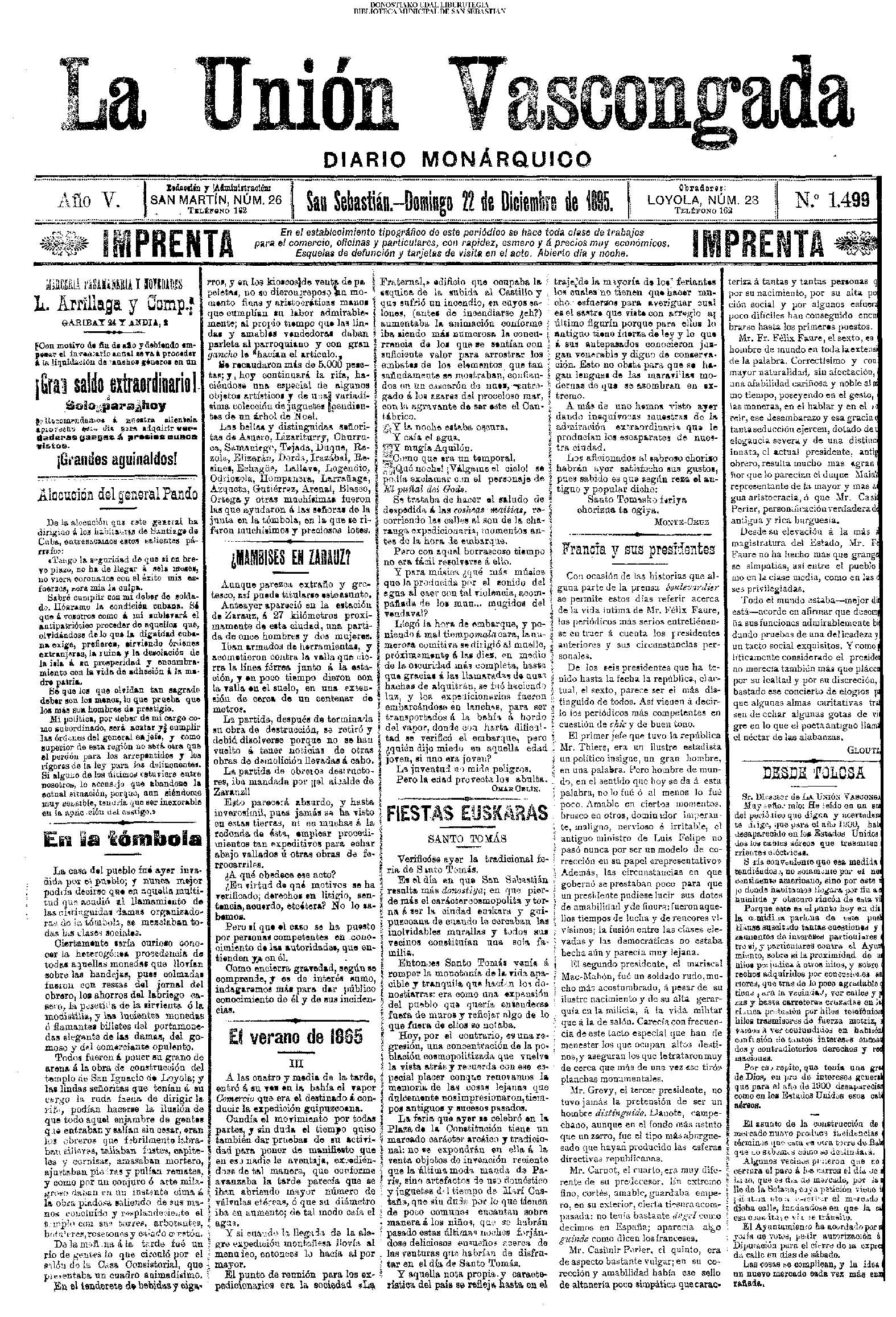 22.12 - Ayer(21.12) se celebró la tradicional feria de Santo Tomás. A pesar de lo desapacible del dia la Plaza de la Constitución se vió consueri-disima. Como es de rigor vinieron multitud de aldeanos en objeto de traer las rentse de las fincas que llevan en arrendamien to y los regalos consabidos. Con tal motivo la población ofrecim animadísimo aspecto. En las onsas de los amos sa desarrolla-ban las escenas de siempre, 6588 690anas tipicas de este país que tan admirabis mente han sido deseritas en más de una ocasión por algunos escritores vascou-gados. Ni el tiempo ni nadie ha podido borrar la cestumbre de este día, en el que se es-trechan más y más los fraternales lazos de unión entre Inquilinos y propietarios, y por eso, no menos que por otras cau-sas, la recordamos slempro con verdade-ro placer. La Piaza de la Constitución com deci mos antes presentaba desde las primeras horas de la mañana uu animado aspecto. Los puestos esparcidos en todo el ámbito de la plaza en que se verifiasban tre tsag efones de mil distintos objetos, el v ce rio de los vendedores y el amoroso pů blico que circulaba por aquellos sitios daban á la pisza un aspecto al y que sólo se puede ver un dis en to io el aña y can dia es: Sauto Tomás. A pesar de la afluencia de gente en aquel punto, no se registró ningún su-ceso desagradable que ocurriera durante todo el dias. |