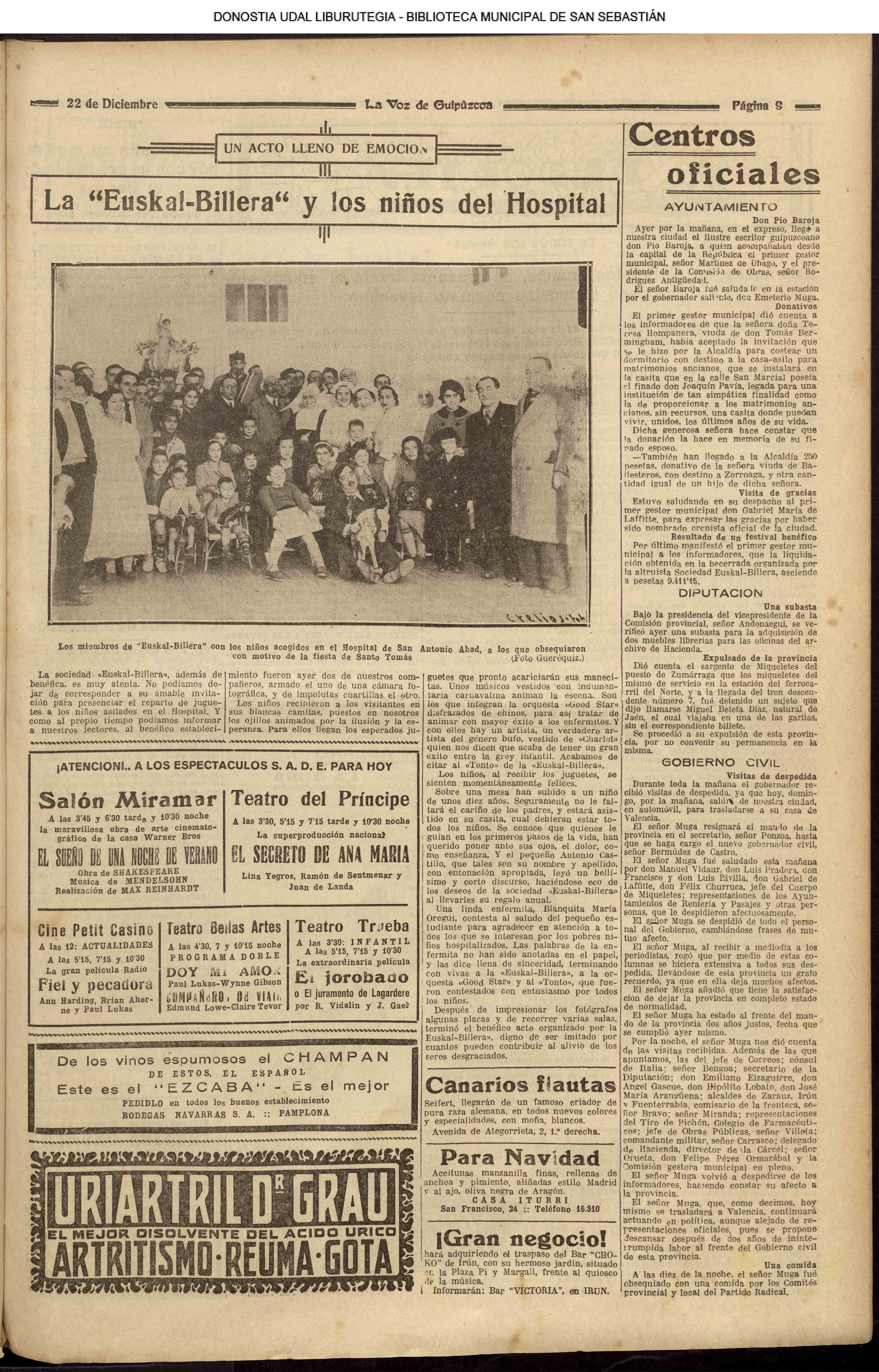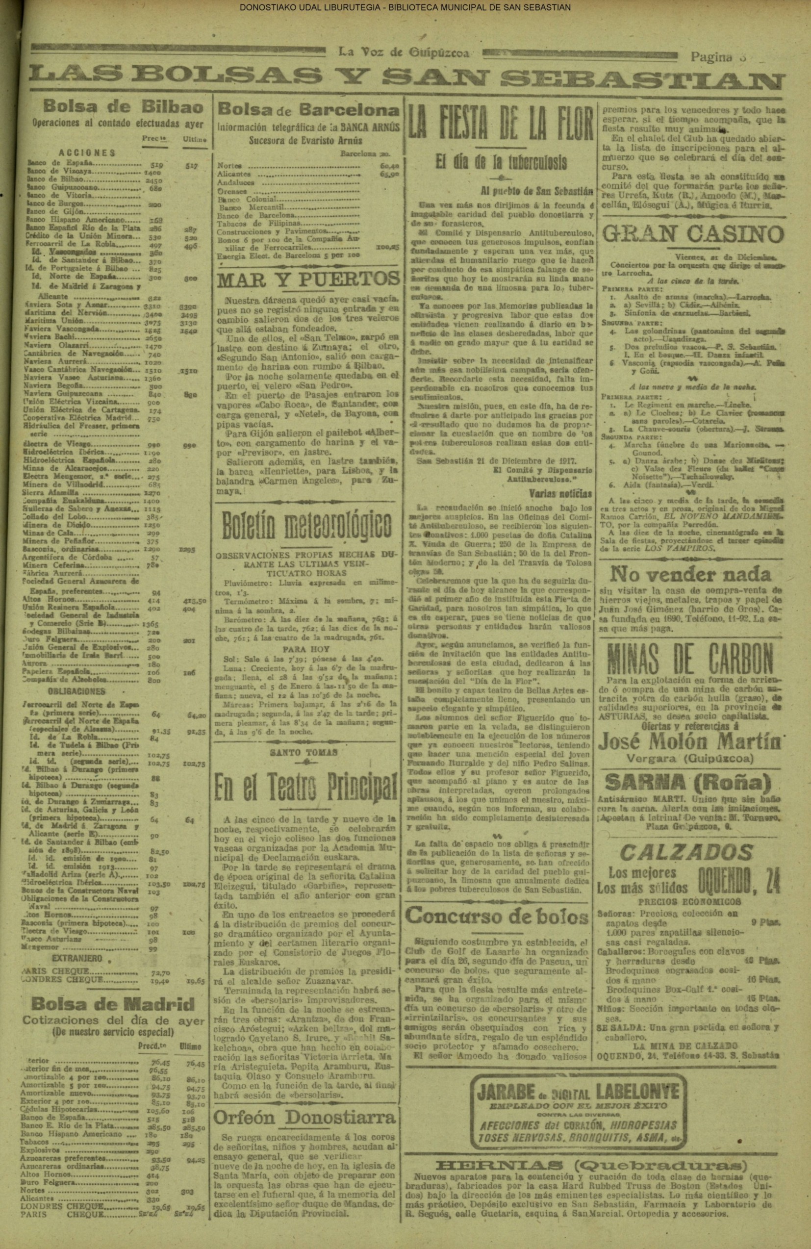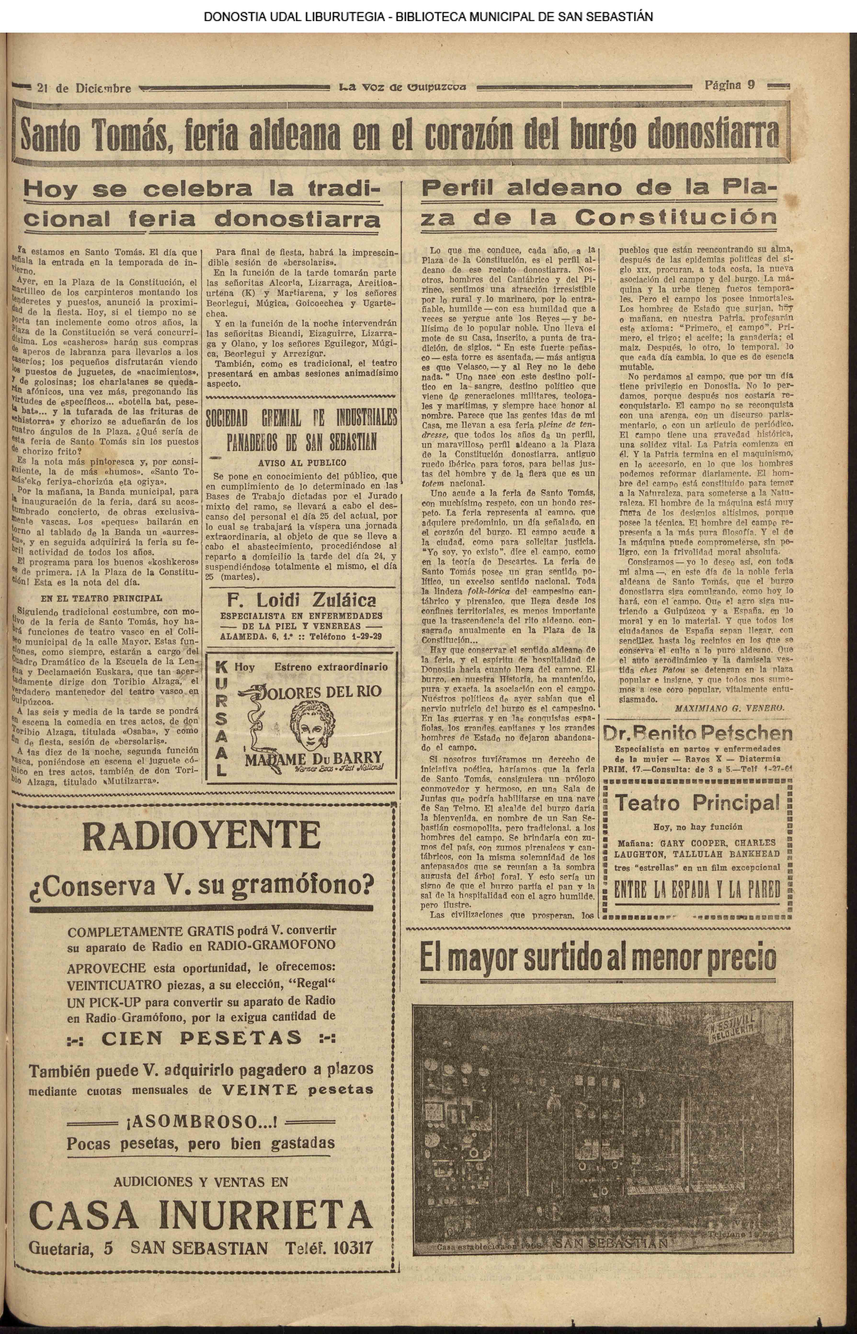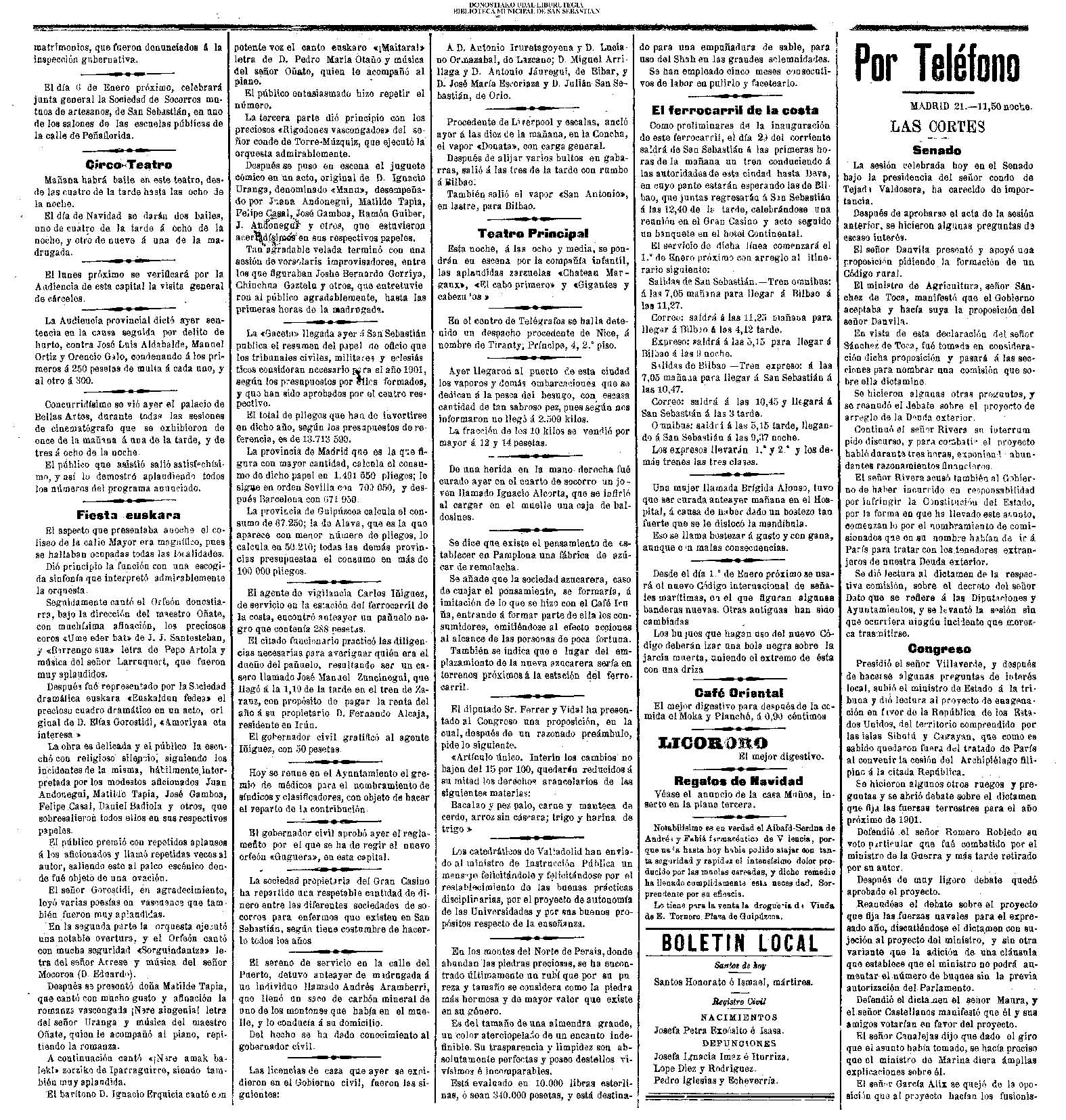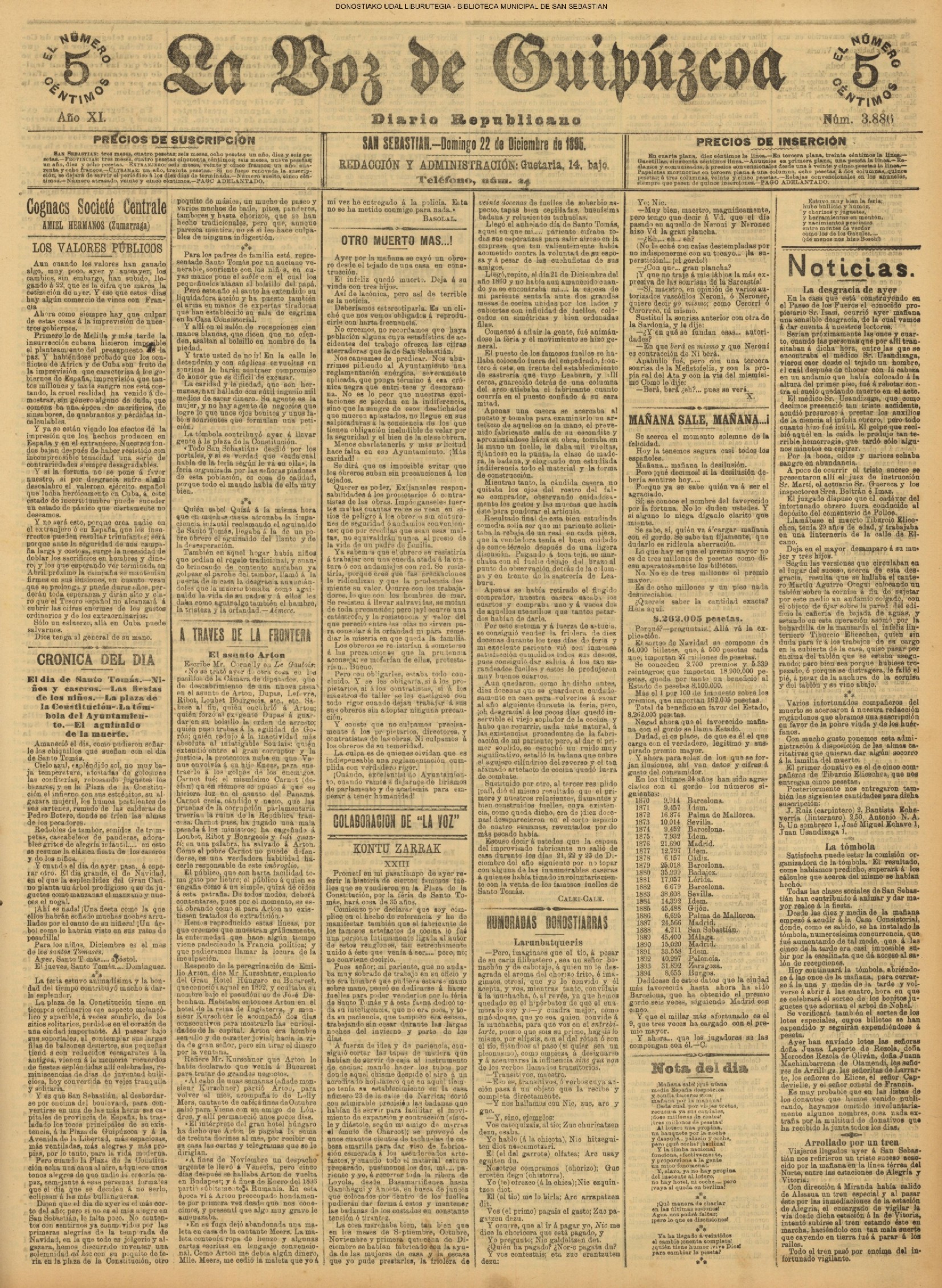 22.12 - Ayer(21.12) se celebró la tradicional feria de Santo Tomás. A pesar de lo desapacible del dia la Plaza de la Constitución se vió consueri-disima. Como es de rigor vinieron multitud de aldeanos en objeto de traer las rentse de las fincas que llevan en arrendamien to y los regalos consabidos. Con tal motivo la población ofrecim animadísimo aspecto. En las onsas de los amos sa desarrolla-ban las escenas de siempre, 6588 690anas tipicas de este país que tan admirabis mente han sido deseritas en más de una ocasión por algunos escritores vascou-gados. Ni el tiempo ni nadie ha podido borrar la cestumbre de este día, en el que se es-trechan más y más los fraternales lazos de unión entre Inquilinos y propietarios, y por eso, no menos que por otras cau-sas, la recordamos slempro con verdade-ro placer. La Piaza de la Constitución com deci mos antes presentaba desde las primeras horas de la mañana uu animado aspecto. Los puestos esparcidos en todo el ámbito de la plaza en que se verifiasban tre tsag efones de mil distintos objetos, el v ce rio de los vendedores y el amoroso pů blico que circulaba por aquellos sitios daban á la pisza un aspecto al y que sólo se puede ver un dis en to io el aña y can dia es: Sauto Tomás. A pesar de la afluencia de gente en aquel punto, no se registró ningún su-ceso desagradable que ocurriera durante todo el dias. |
