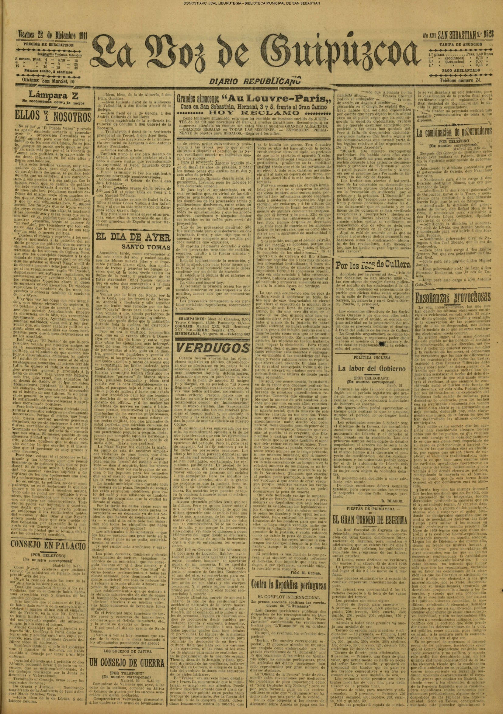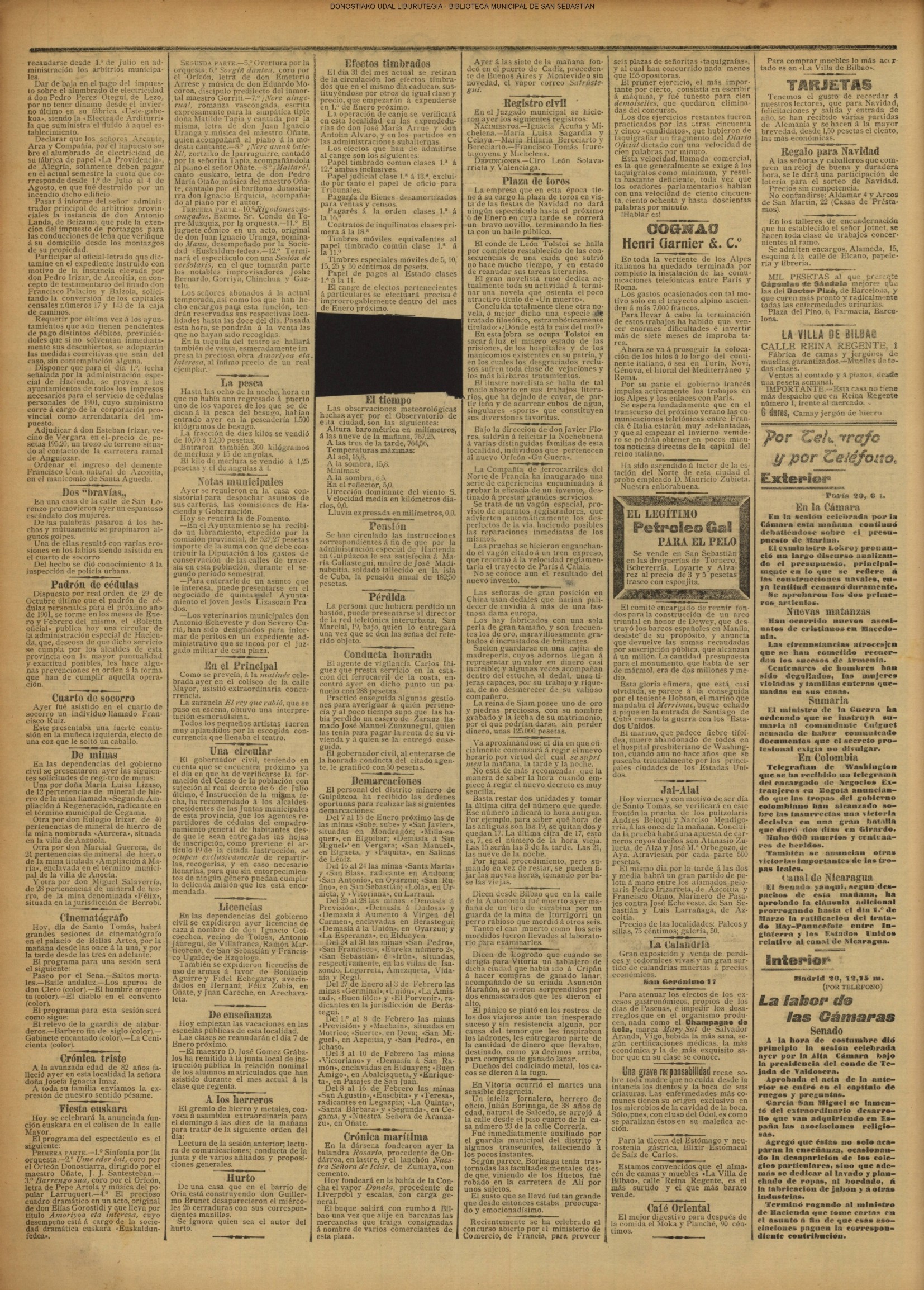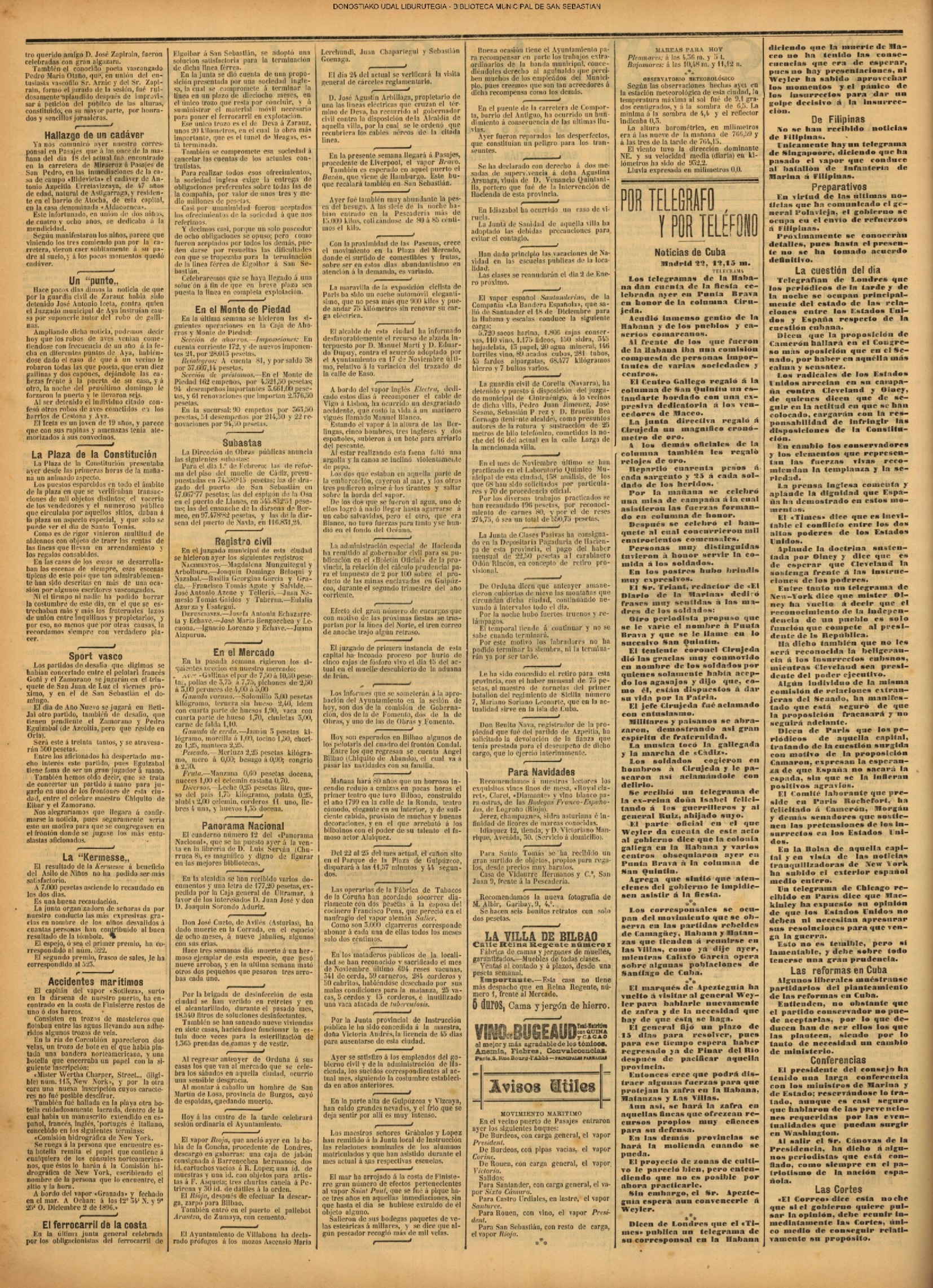 22.12 - CRÓNICA DEL DÍA - El tiempo. La plaza y las calles. Los capones y el bacalao de Escocia.-Infierno en casa. Hiso una buena mañana; pero por la tarde no renunció Santo Tomás & rooine con agua destilada los tradicionales cho-rinos de la plaza de la Constitución. Agua y granizo cayó ayer con interva-los de viento huracacado qua amenaza acabar en un dos por tres con los trastos, barracones y sartenes de la foria de Sau-to Tomas. El mal tiempo es complemento de estan fortas celebradas al abrigo de soportales. Asi como no se conclbe un dia del Corpus sin cielo despejado y hermoso sol, tam-poco es comprensible un dia do Santo To más sin amontonsumiento de gaute on los soportales, pisandose los talones, shu-mándose, como las moroillas castellanas, con el vaha aceitoso de las sartanes, qua se agarra a la garganta coma Canalejas A la carte ad Hacienda, empujandose y estrojando y soportando todo uu infierno de tamborilee, pitos y metálicos Instru-mentos que la solicitud paternal adquiero & costa, no tanto de su bolelilo, como de stis pacientes oldos. No es extraño que tautos Instrumentes, tambores, cornetse, ete., so toquen en di cha pisza. Con cualquier fisstilis results sitio de tocar. Los enseros deafliaron por la ciudad trayendo por la mañans los osbades y ri cos capones y llevándose el escasildo ba calao de Esnocis. El cambio no es equltativo; pero os il-bro. ¡Y habrá todaviş partidarios del li-bre cambio! Les bezares histeron su Diciembre, qus no stempre ha de sers Agosto, y durau-to las horas del dia la andad ofreafő ese sallo capcolal que la presta le tradicional feria. Los galzones destilaron, la noche se echo encima sla amorAsarcos ni nada, el baratlilero cerró su tienda, se con-galó en las mugrientas sartenes la gra-es donde nadaron los manojes de cho-rizos, y la finets de Santo Tomas..... no concluyó jea! Empiese shora y no pro longa muchos dias en el intranquilo ho-gar de is familla donde todos clamamos, como el personaje de la comedia de Serra: Santo Tomás panto mios el santo más testuendo de cuantos al otels han tdal
