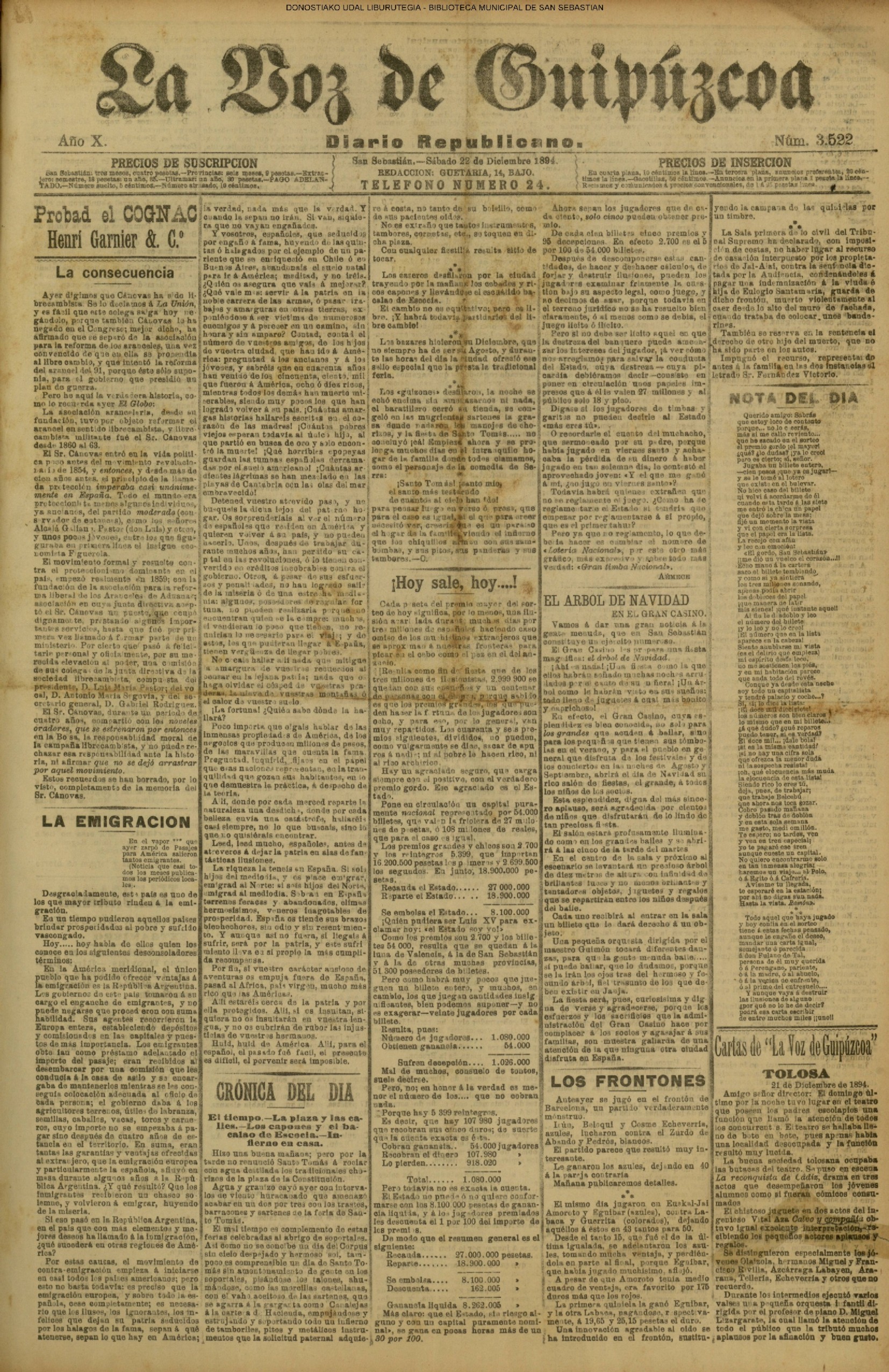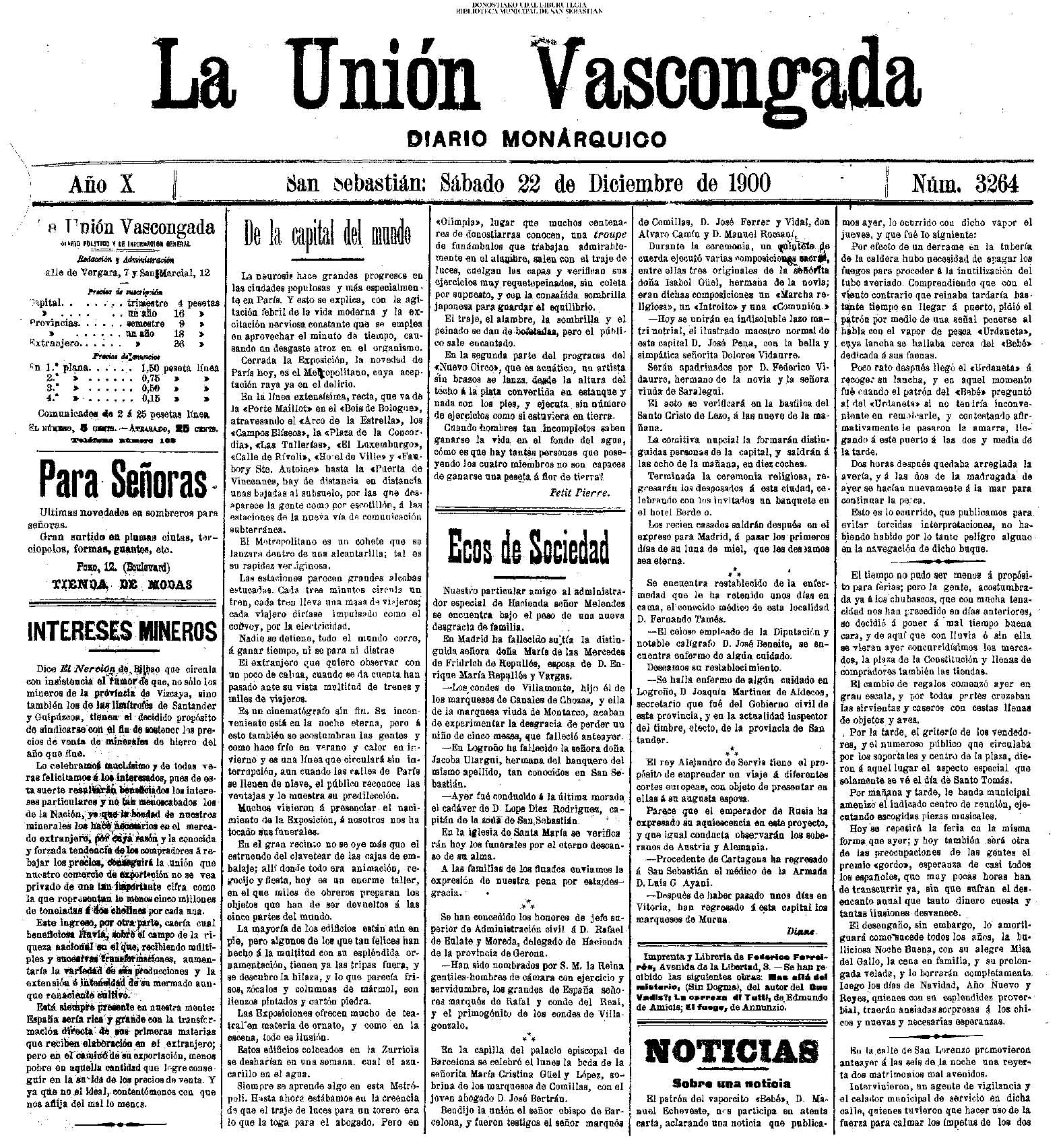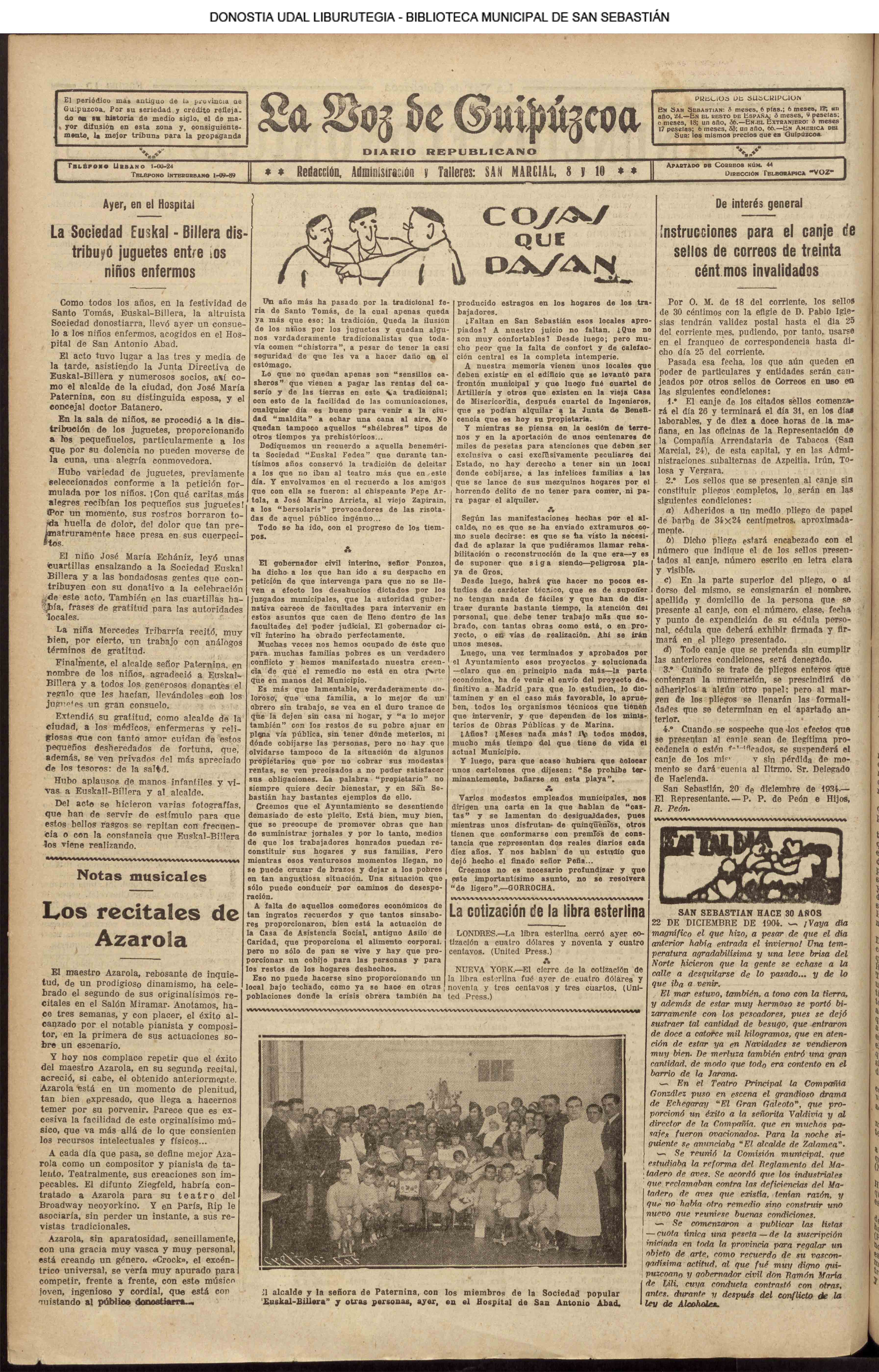 22.12 - CRÓNICA DEL DÍA - El tiempo. La plaza y las calles. Los capones y el bacalao de Escocia.-Infierno en casa. Hiso una buena mañana; pero por la tarde no renunció Santo Tomás & rooine con agua destilada los tradicionales cho-rinos de la plaza de la Constitución. Agua y granizo cayó ayer con interva-los de viento huracacado qua amenaza acabar en un dos por tres con los trastos, barracones y sartenes de la foria de Sau-to Tomas. El mal tiempo es complemento de estan fortas celebradas al abrigo de soportales. Asi como no se conclbe un dia del Corpus sin cielo despejado y hermoso sol, tam-poco es comprensible un dia do Santo To más sin amontonsumiento de gaute on los soportales, pisandose los talones, shu-mándose, como las moroillas castellanas, con el vaha aceitoso de las sartanes, qua se agarra a la garganta coma Canalejas A la carte ad Hacienda, empujandose y estrojando y soportando todo uu infierno de tamborilee, pitos y metálicos Instru-mentos que la solicitud paternal adquiero & costa, no tanto de su bolelilo, como de stis pacientes oldos. No es extraño que tautos Instrumentes, tambores, cornetse, ete., so toquen en di cha pisza. Con cualquier fisstilis results sitio de tocar. Los enseros deafliaron por la ciudad trayendo por la mañans los osbades y ri cos capones y llevándose el escasildo ba calao de Esnocis. El cambio no es equltativo; pero os il-bro. ¡Y habrá todaviş partidarios del li-bre cambio! Les bezares histeron su Diciembre, qus no stempre ha de sers Agosto, y durau-to las horas del dia la andad ofreafő ese sallo capcolal que la presta le tradicional feria. Los galzones destilaron, la noche se echo encima sla amorAsarcos ni nada, el baratlilero cerró su tienda, se con-galó en las mugrientas sartenes la gra-es donde nadaron los manojes de cho-rizos, y la finets de Santo Tomas..... no concluyó jea! Empiese shora y no pro longa muchos dias en el intranquilo ho-gar de is familla donde todos clamamos, como el personaje de la comedia de Serra: Santo Tomás panto mios el santo más testuendo de cuantos al otels han tdal